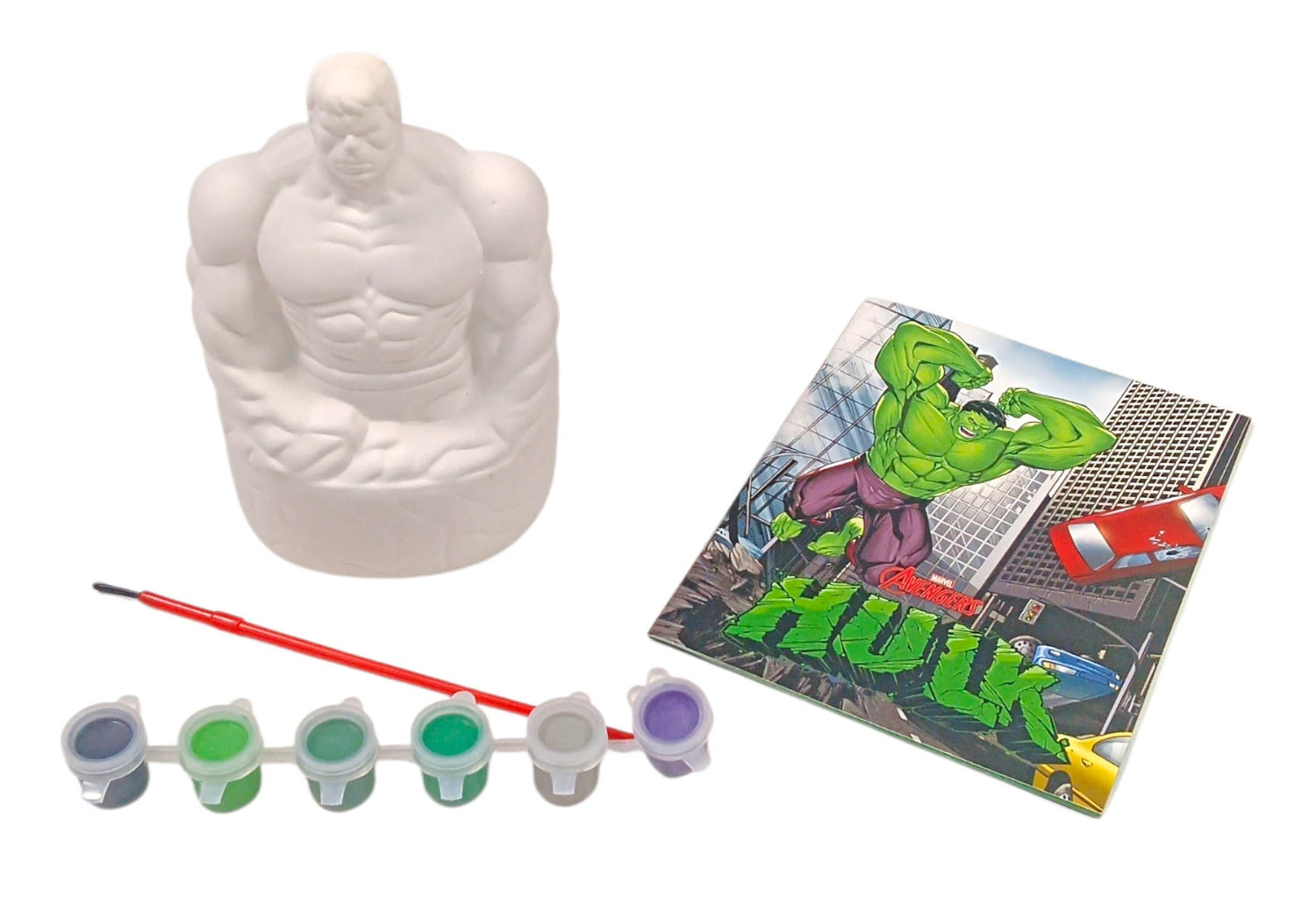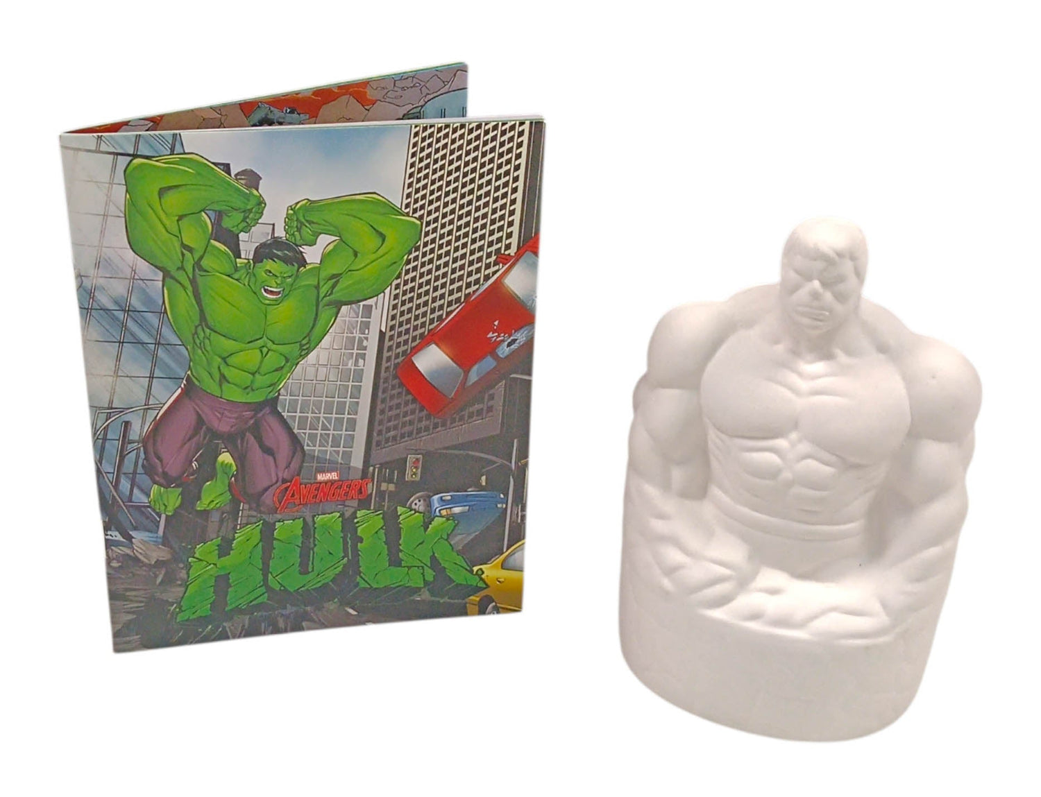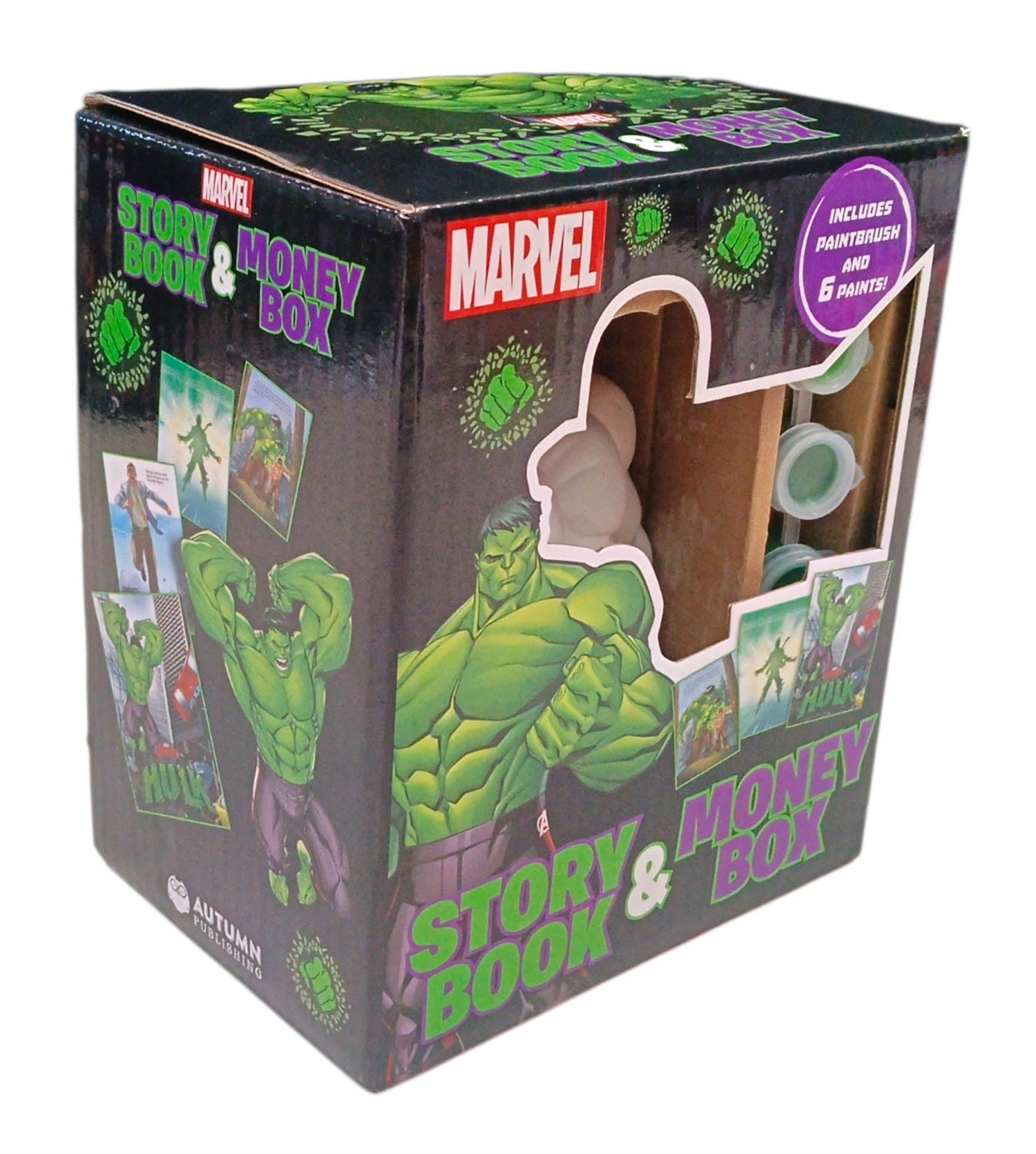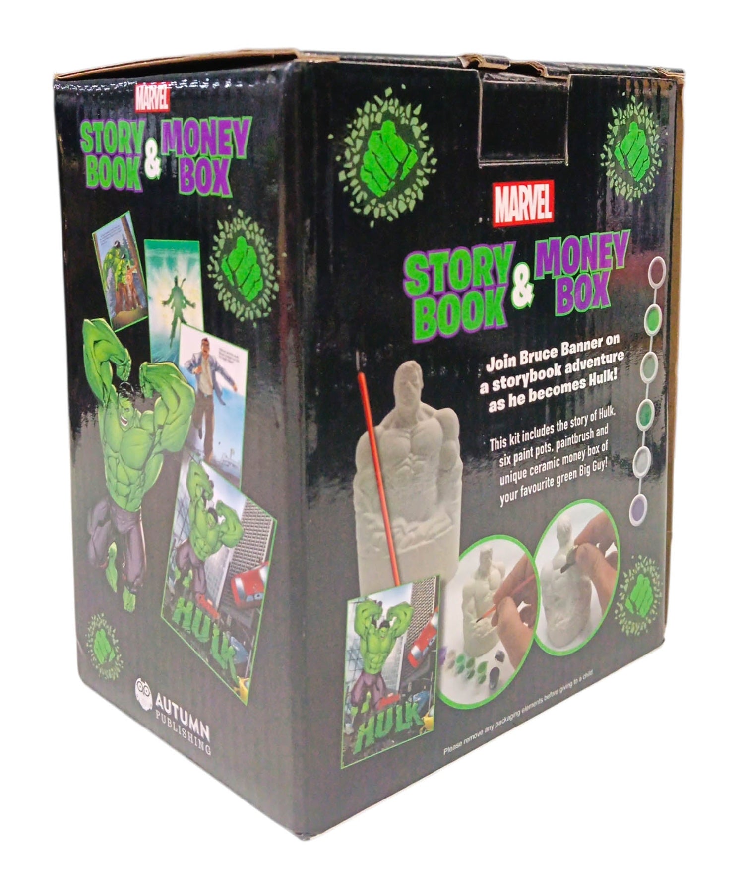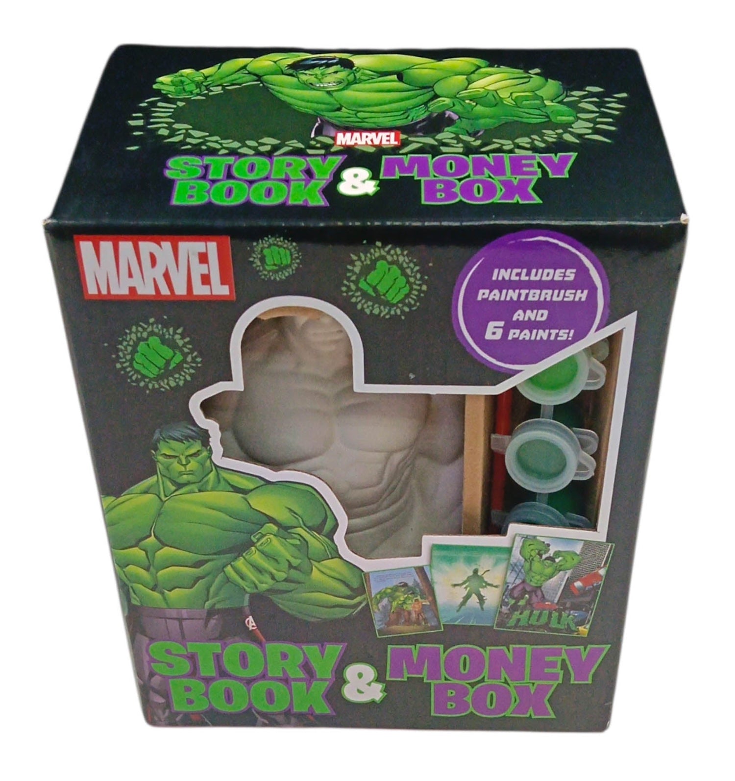 Join Bruce Banner on a storybook adventure as he becomes Hulk. This kit include the story of Hulk, six paint pots, paintbrush and unique ceramic money box of The Incredible Hulk!