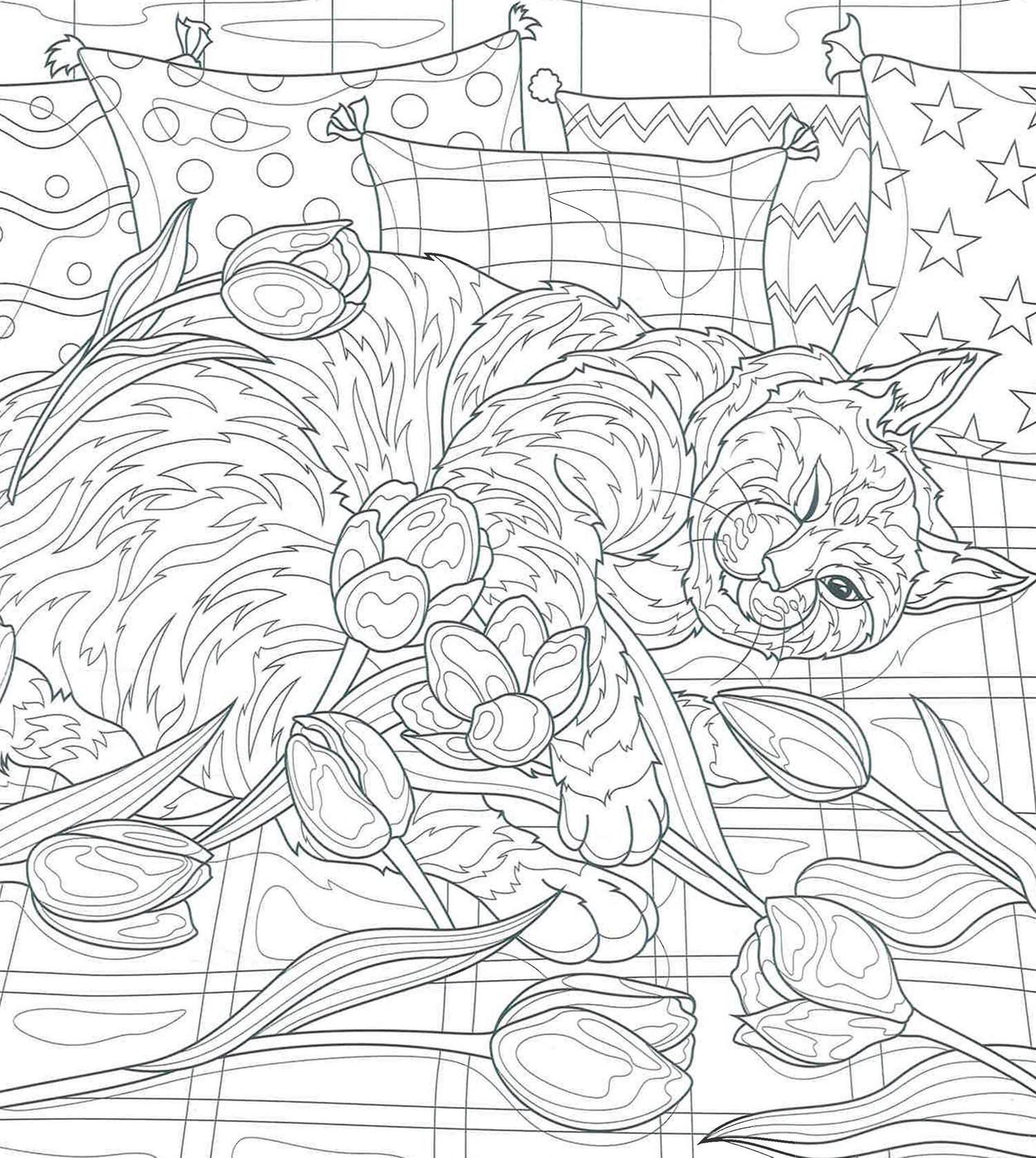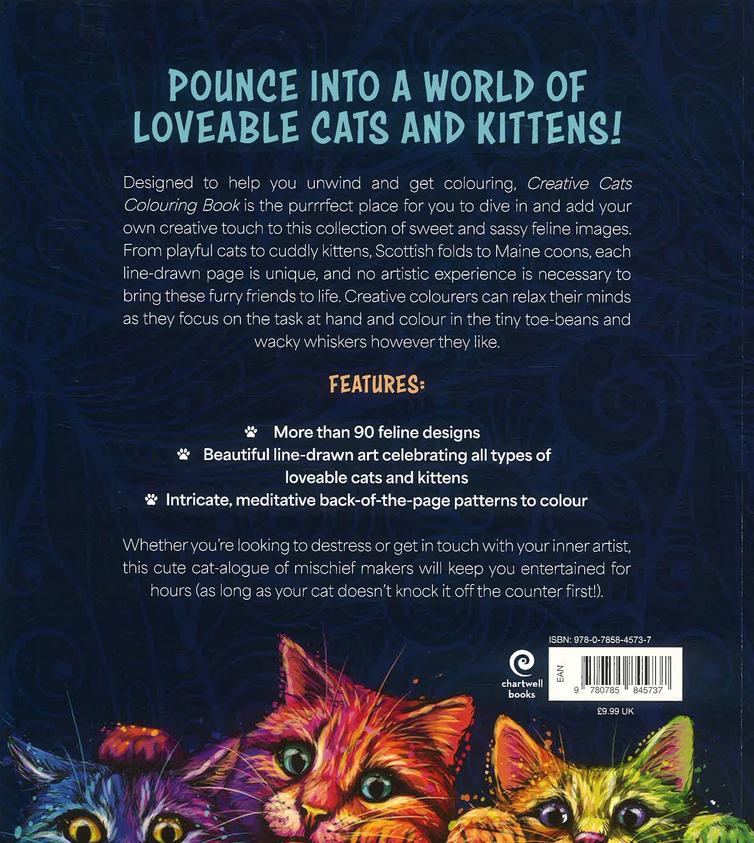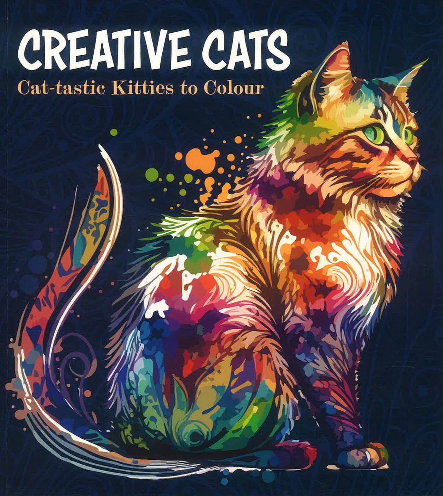 Beautiful black and white illustrations of all kinds of cats and kittens in different artwork styles from cartoony to realistic. The back of every illustration has a detailed feline pattern to colour. A wonderful book to help you release your creativity and gently unwind.