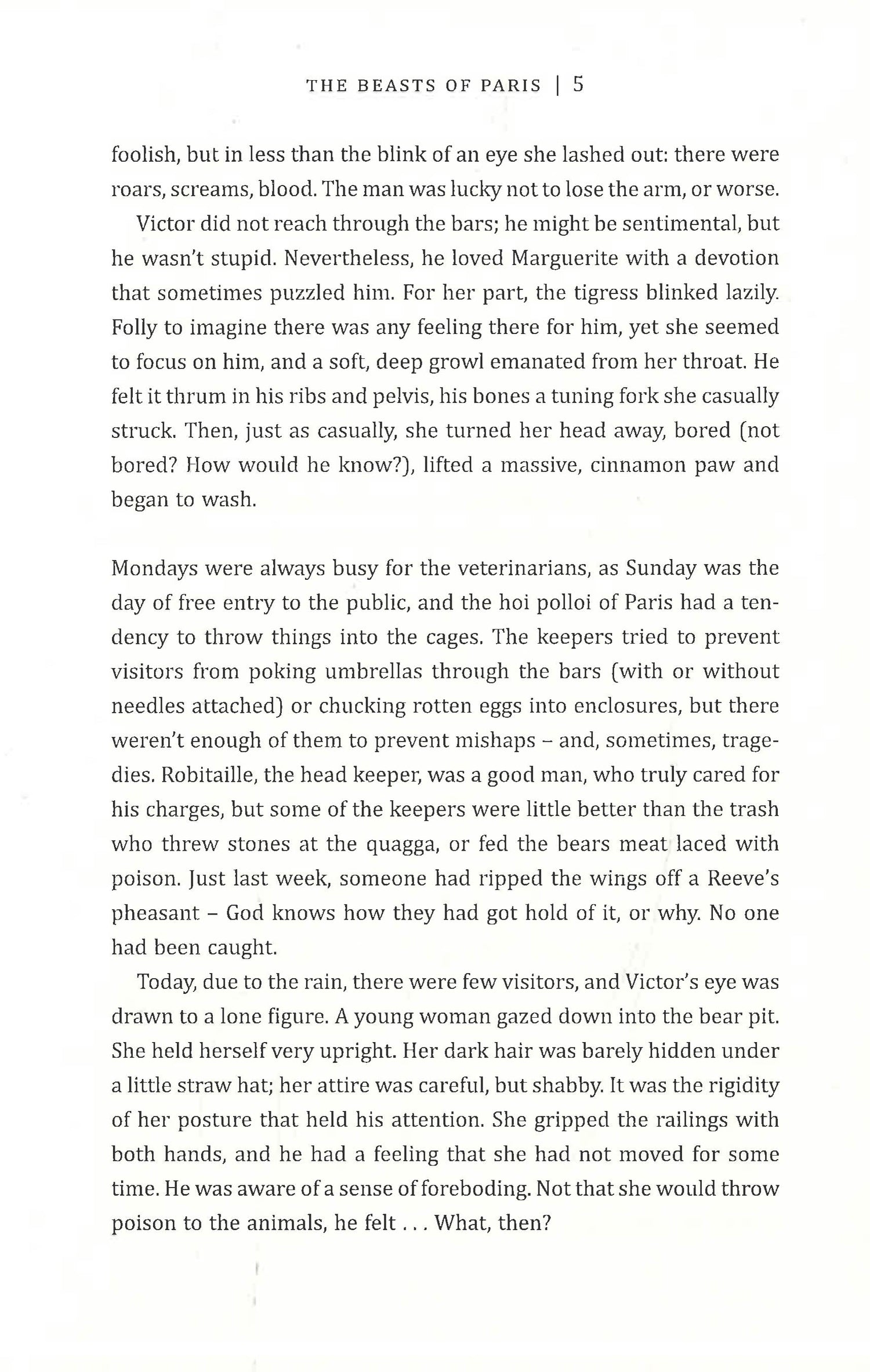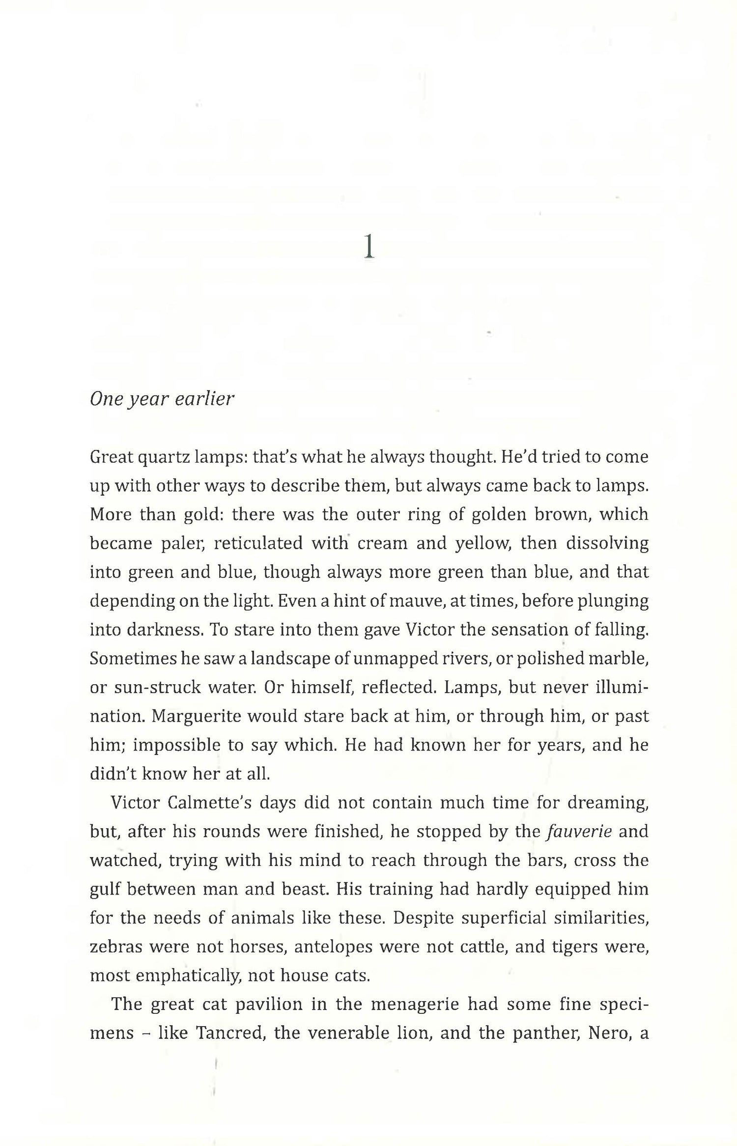 Each keeps company with the restless beasts of Paris' Menagerie, where they meet, fight their demons, lose their hearts, and rebel in a city under siege.