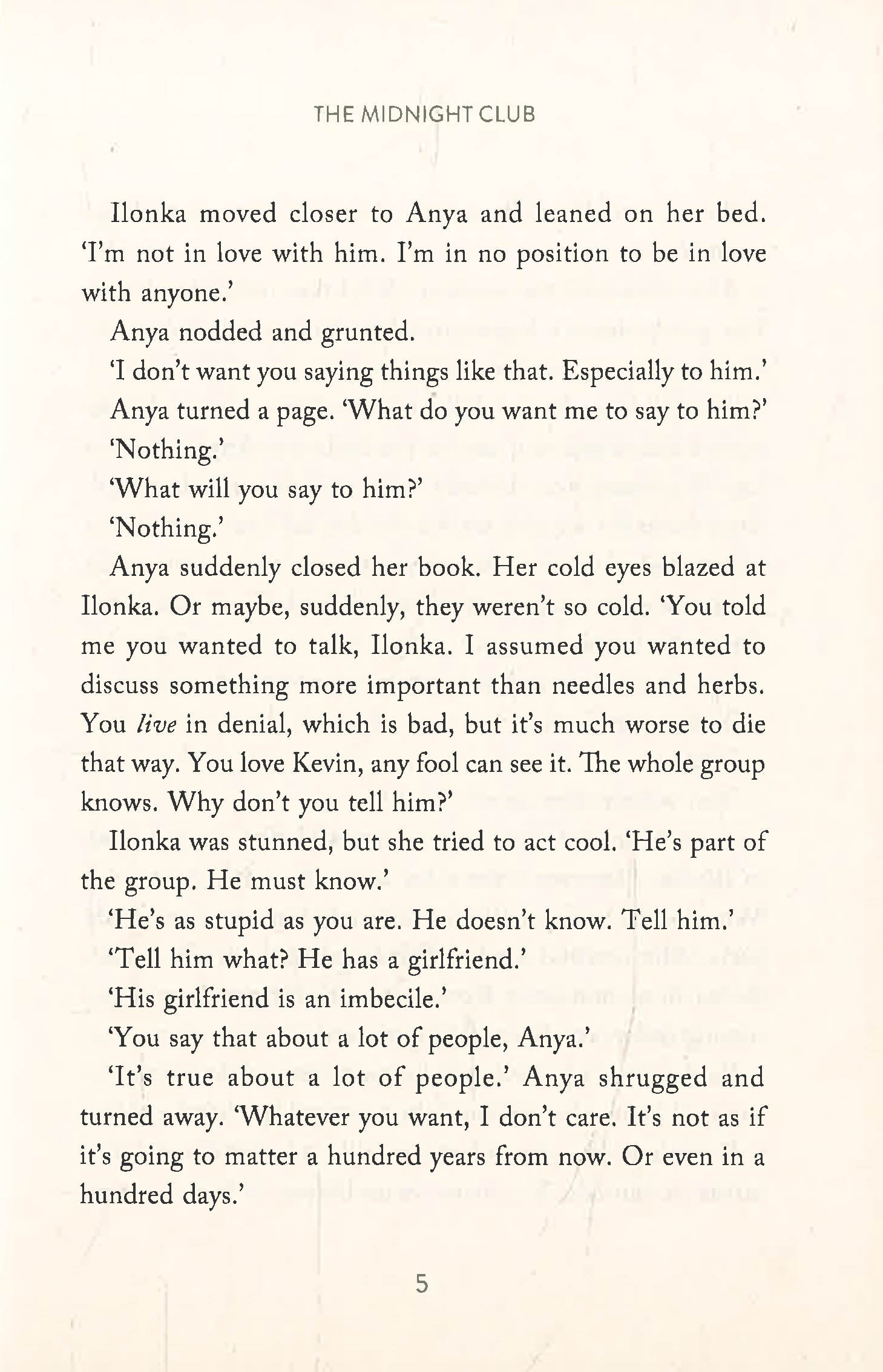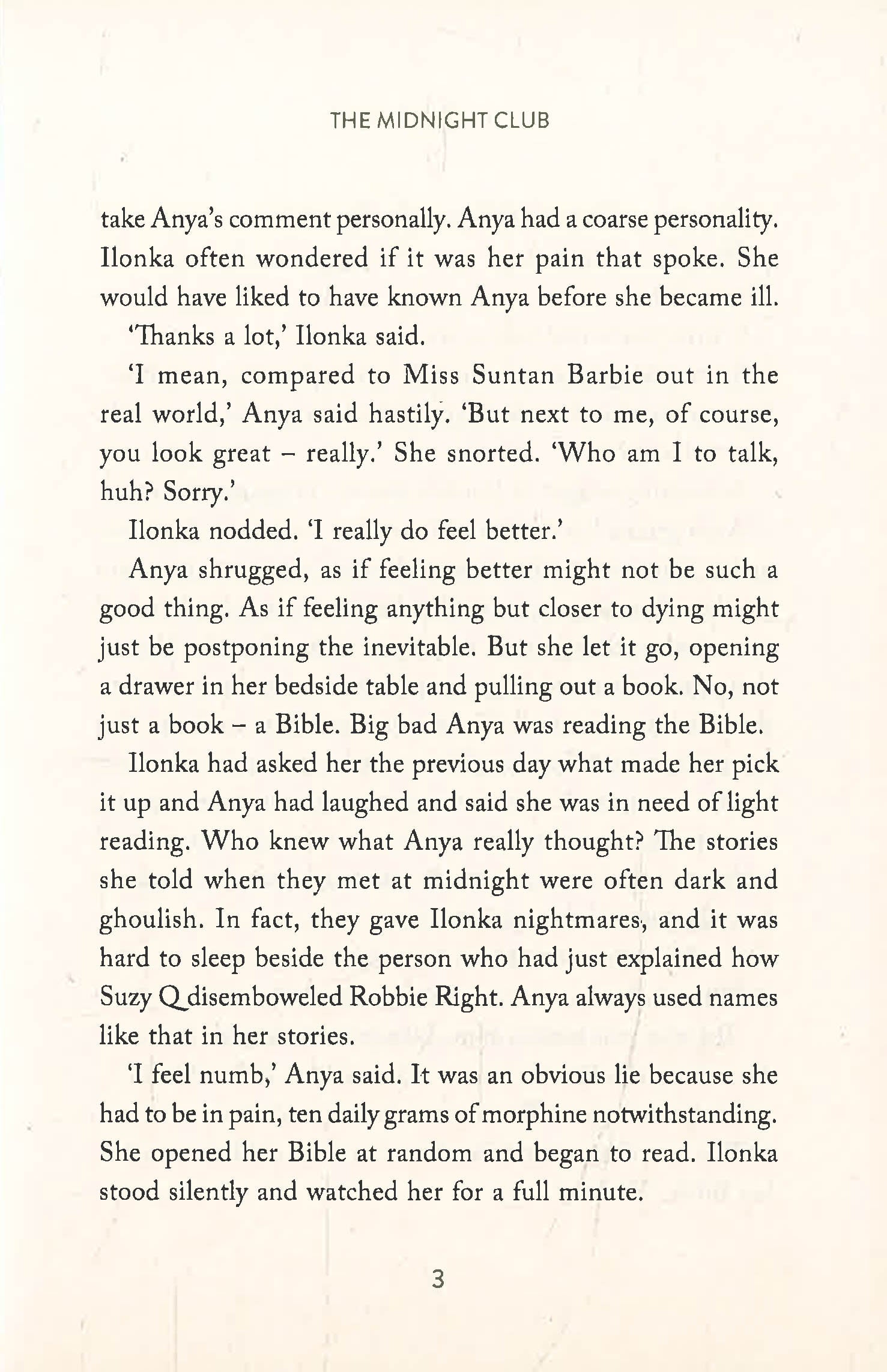 Every night at twelve, a group of young guys and girls at the hospice came together to tell stories. They called themselves the Midnight Club, and their stories could be true or false, inspiring or depressing, or somewhere in-between.