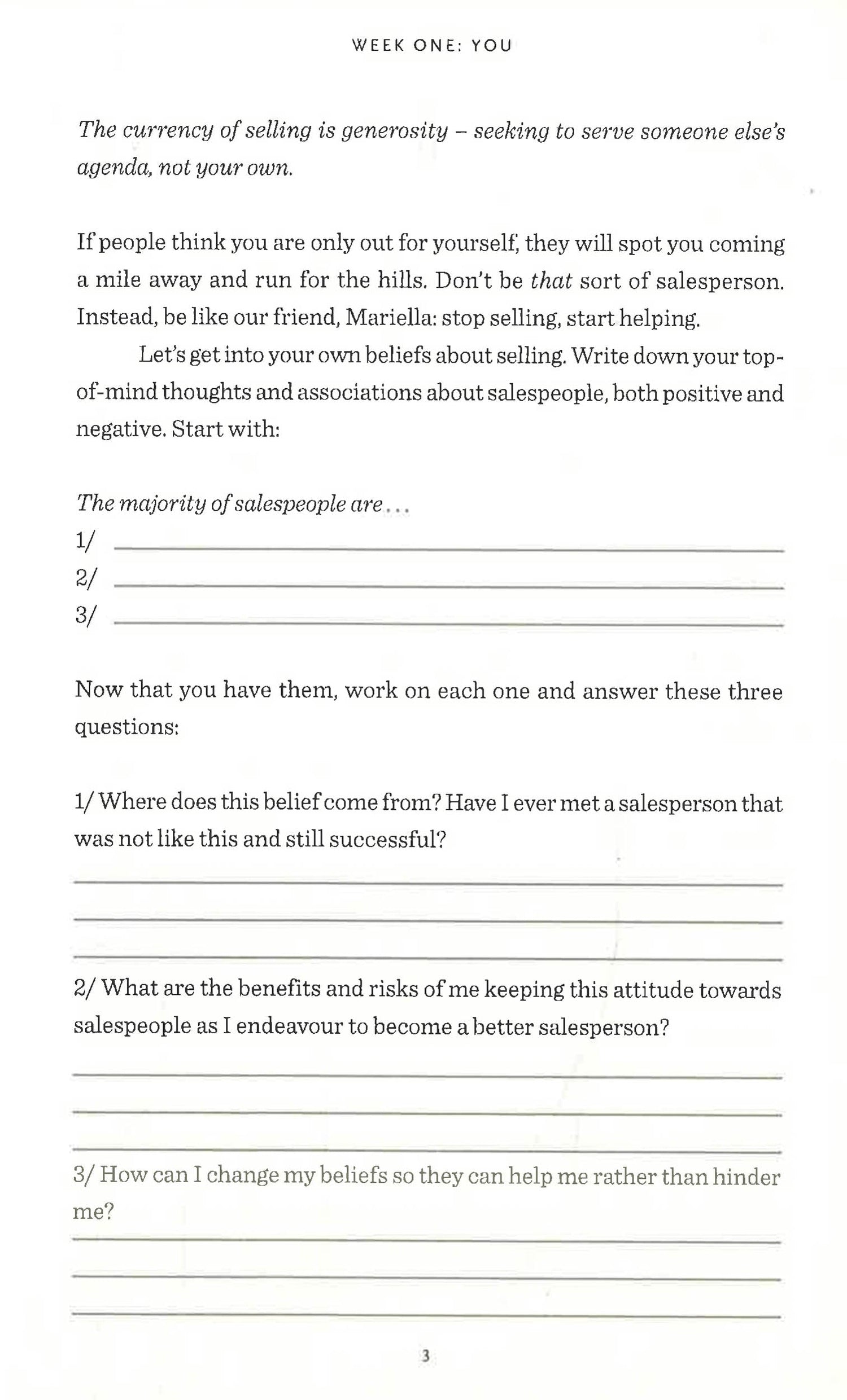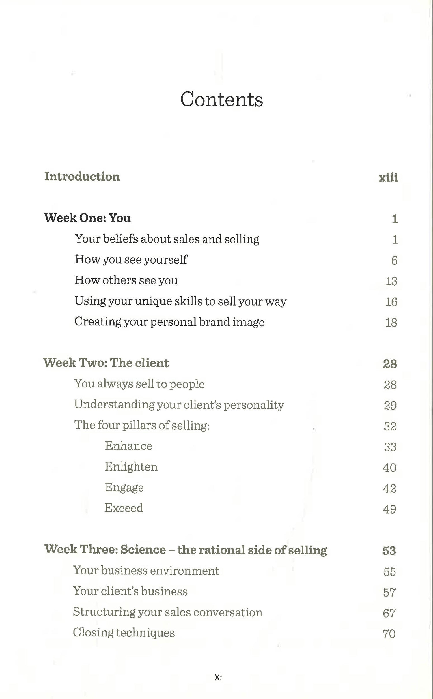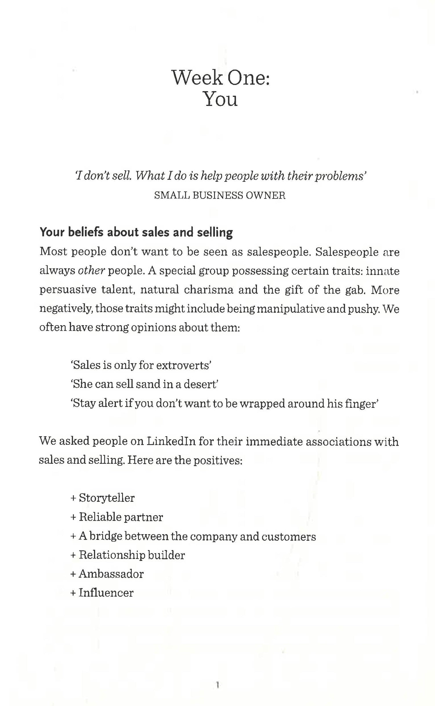 The book is a toolkit for self-exploration, analysis, learning and action plan development framed in a 5-week programme for building your unique sales self. Setting a clear objective for every week, it takes the reader through a simple 5-step programme: