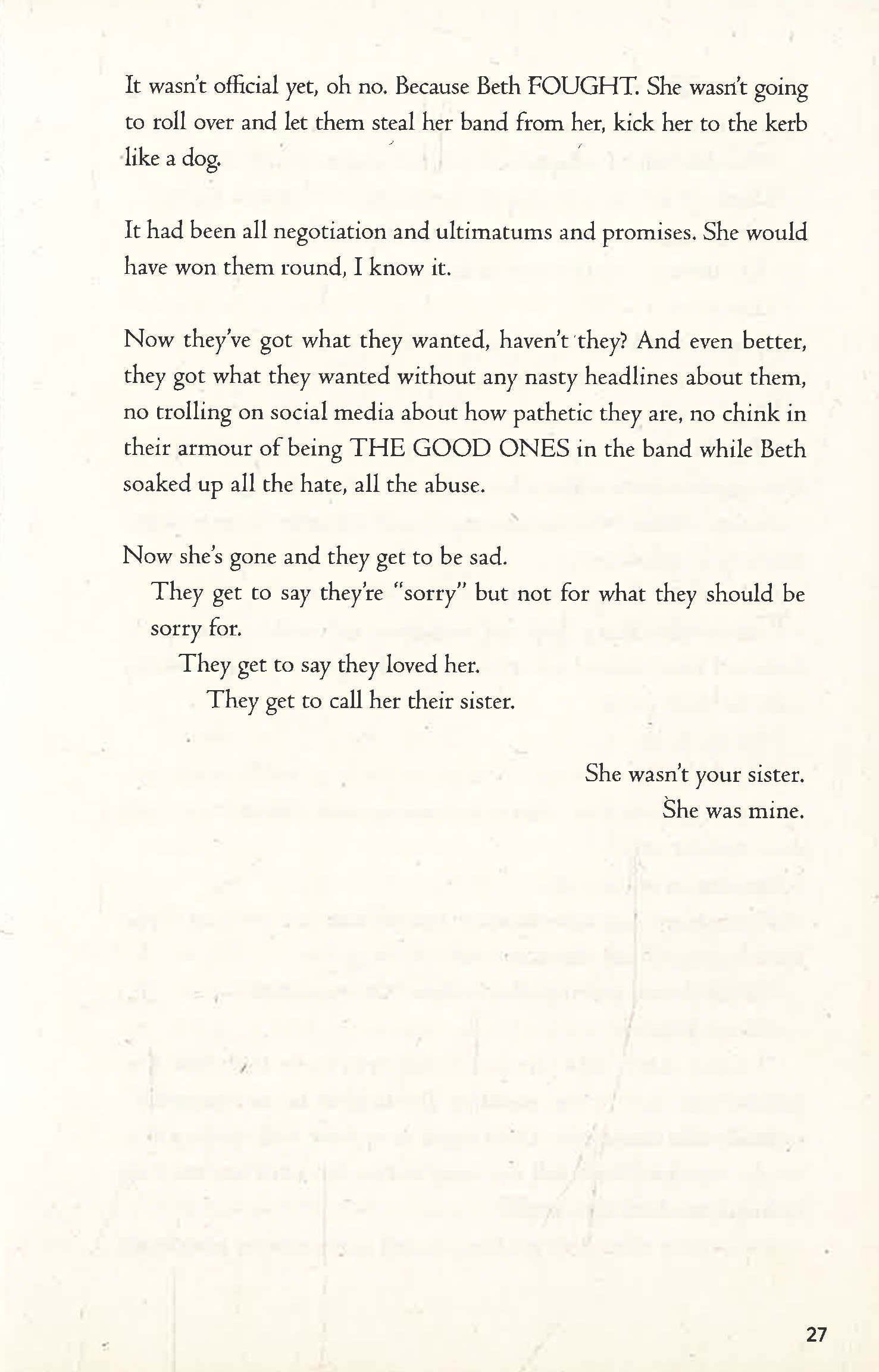Forced to face a world without the guiding light of her bright, brilliant big sister, Emmy must wrestle with the impact of private grief, public scrutiny and discover who she once was and who she will become, now that Beth is gone.