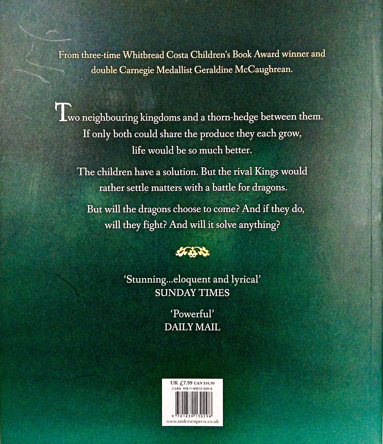 Two kingdoms, two dragons - which side will win, or will peace prevail? The kingdoms of Arbor with its lush forests, and Pomosa rich with farmland, have no love between them, and the children have taken to sneaking across the borders to thieve. If only they would share their produce. But the Kings decide to fight, instead... with dragons. But what kind of future will that bring? Written by multi-award-winning author Geraldine McCaughrean and with illustrations by renowned artist Peter Malone, this picture book with a classic feel is a perfect reflection of contemporary strife and conflict around the world. "This stunning picture book is one for every child… eloquent and lyrical" Sunday Times "A powerful message about sharing and cooperation underpins this colourful, old-fashioned fable" Daily Mail "A gently satirical and gorgeously illustrated fable" New Statesman "McCaughrean is one of the greatest living children's authors." The Bookseller