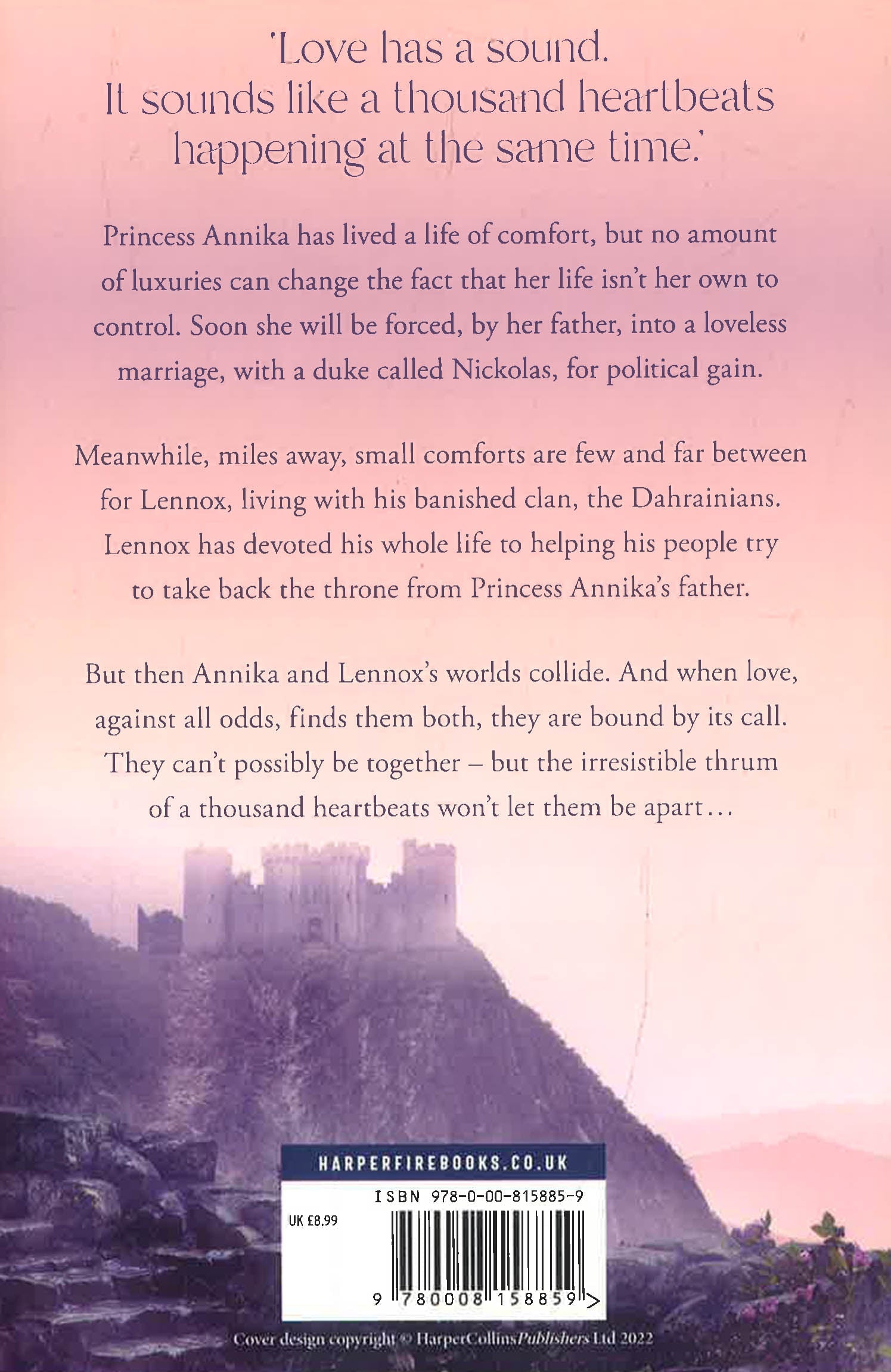 #1 New York Times bestselling author of The Selection series Kiera Cass is back with her most epic novel yet—a sweeping enemies-to-lovers standalone romance. “Love has a sound. It sounds like a thousand heartbeats happening at the same time.” Princess Annika has lived a life of comfort—but no amount of luxuries can change the fact that her life isn’t her own to control. The king, once her loving father, has gone cold, and Annika will soon be forced into a loveless marriage for political gain. Miles away, small comforts are few and far between for Lennox. He has devoted his life to the Dahrainian army, hoping to one day help them reclaim the throne that was stolen from them. For Lennox, the idea of love is merely a distraction—nothing will stand in the way of fighting for his people. But when love, against all odds, finds them both, they are bound by its call. They can’t possibly be together—but the irresistible thrum of a thousand heartbeats won’t let them stay apart. Kiera Cass brings her signature sparkling romance to this beautiful story of star-crossed lovers and long-held secrets.