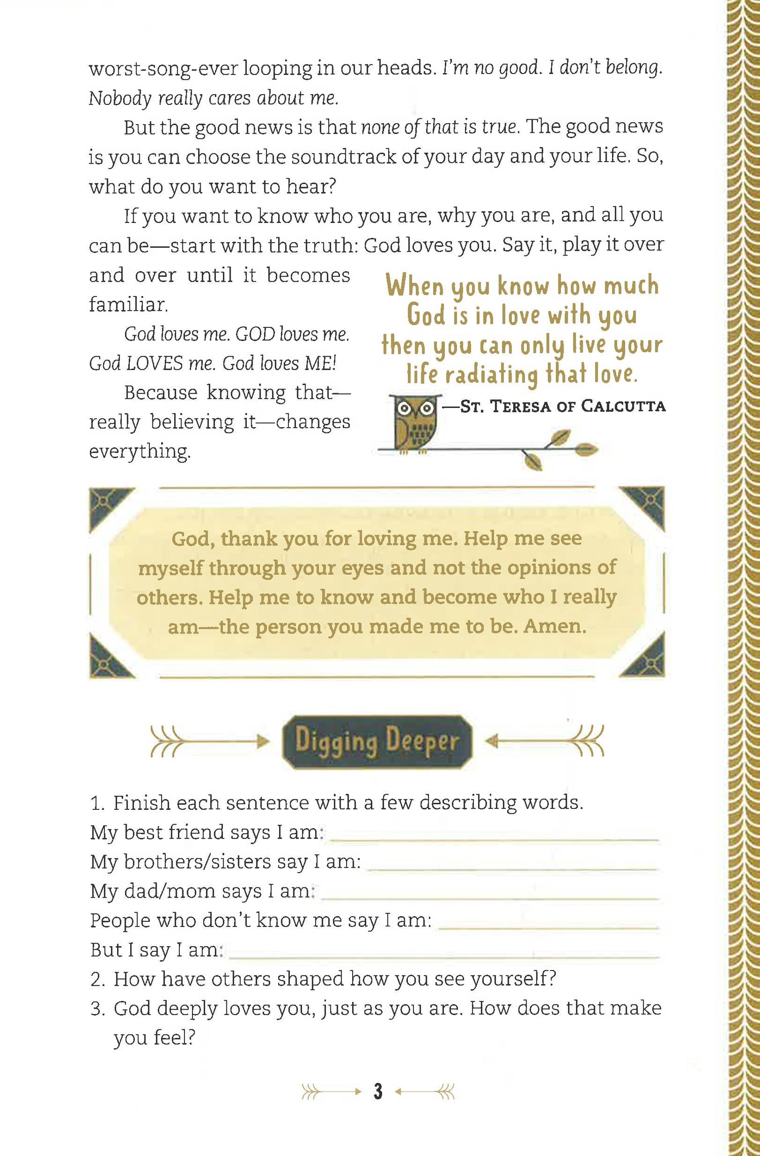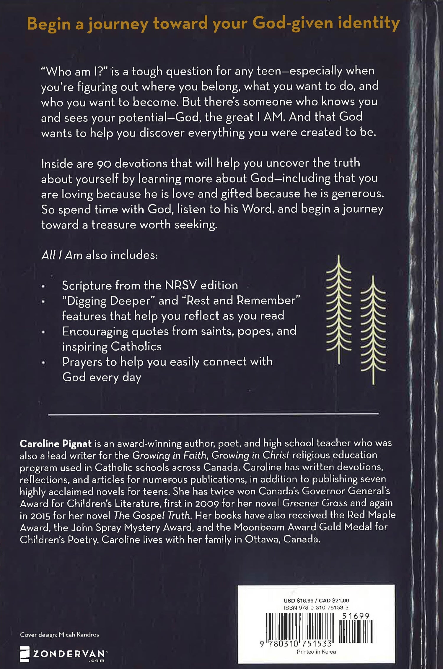 Inside the pages of All I Am are 90 devotions from a Catholic perspective that use conversational language to apply God's truth to your life through relatable examples and real-world applications, each helping you think, act, and be like Jesus and grow your faith and self-esteem.