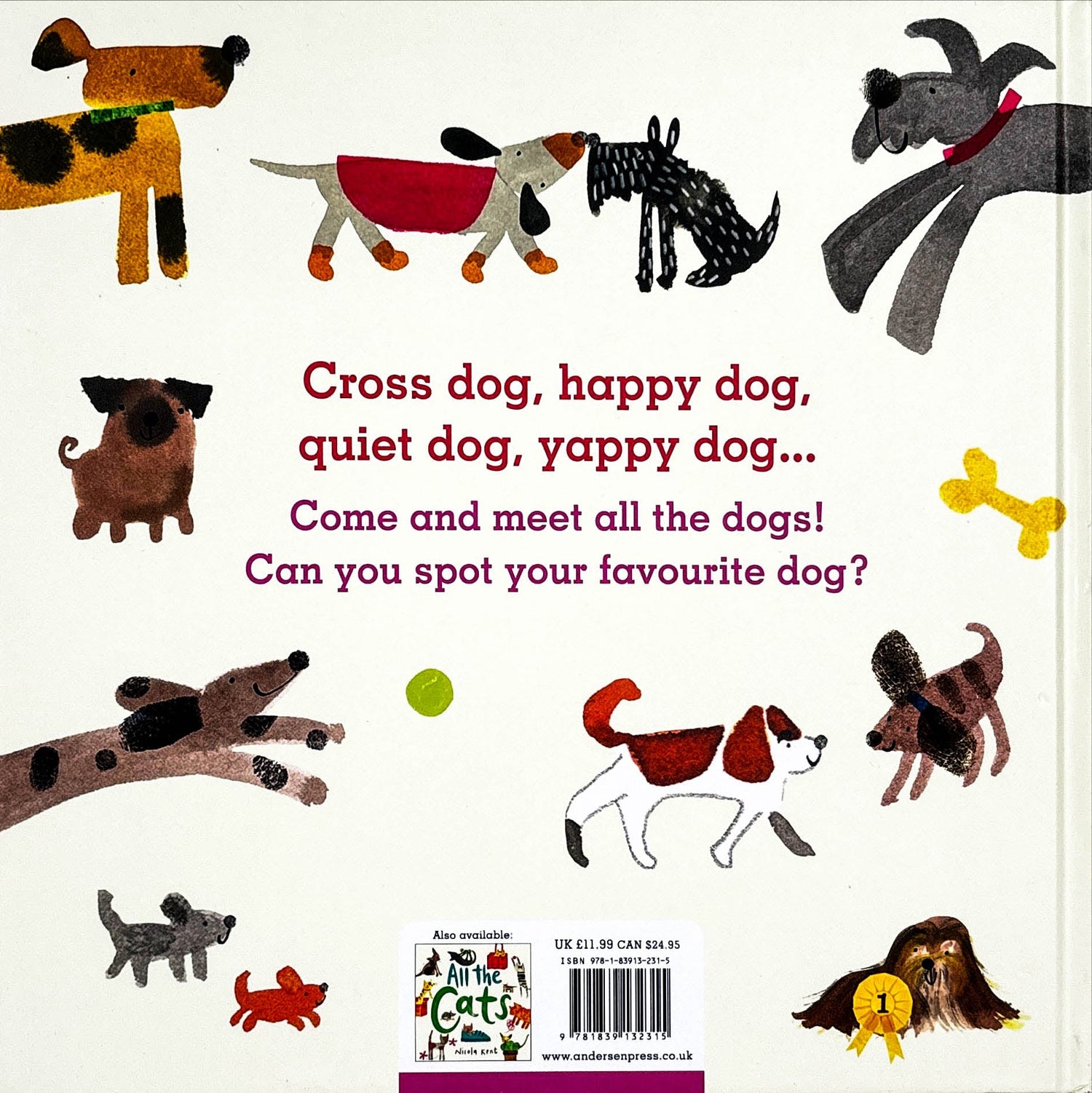 Created by the 2019 winner of the UK Independent Booksellers' Best New Illustrator Award! Nicola Kent presents... ALL THE DOGS! Big dogs, small dogs, hardly there at all dogs. Two dogs, three dogs, always need a pee dogs! Have fun reading along in this gorgeous doggy picture book and meet ALL the dogs... Read along and spot your favourite, then read Nicola Kent's matching book: All the Cats.