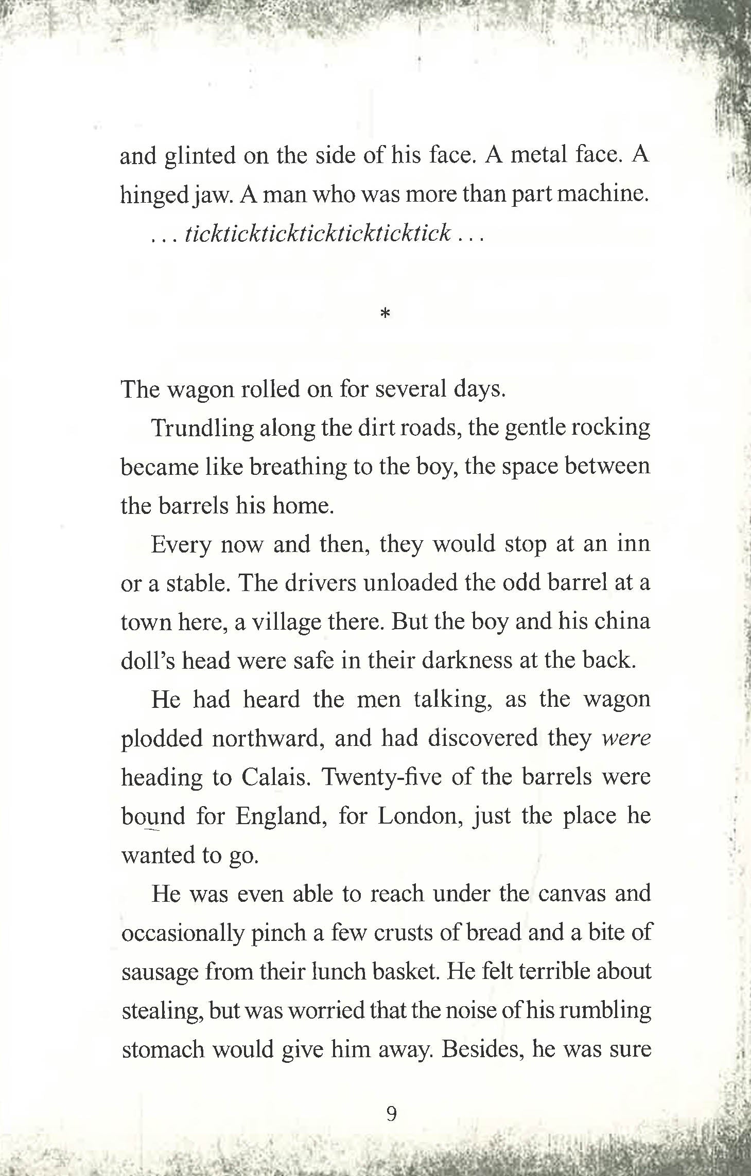 There were three men and two women . . . One had half a face. One had iron legs. The others all had one or both arms missing. There were pincers and claws and guns instead. And you could hear them ticking. Ticking all the time.