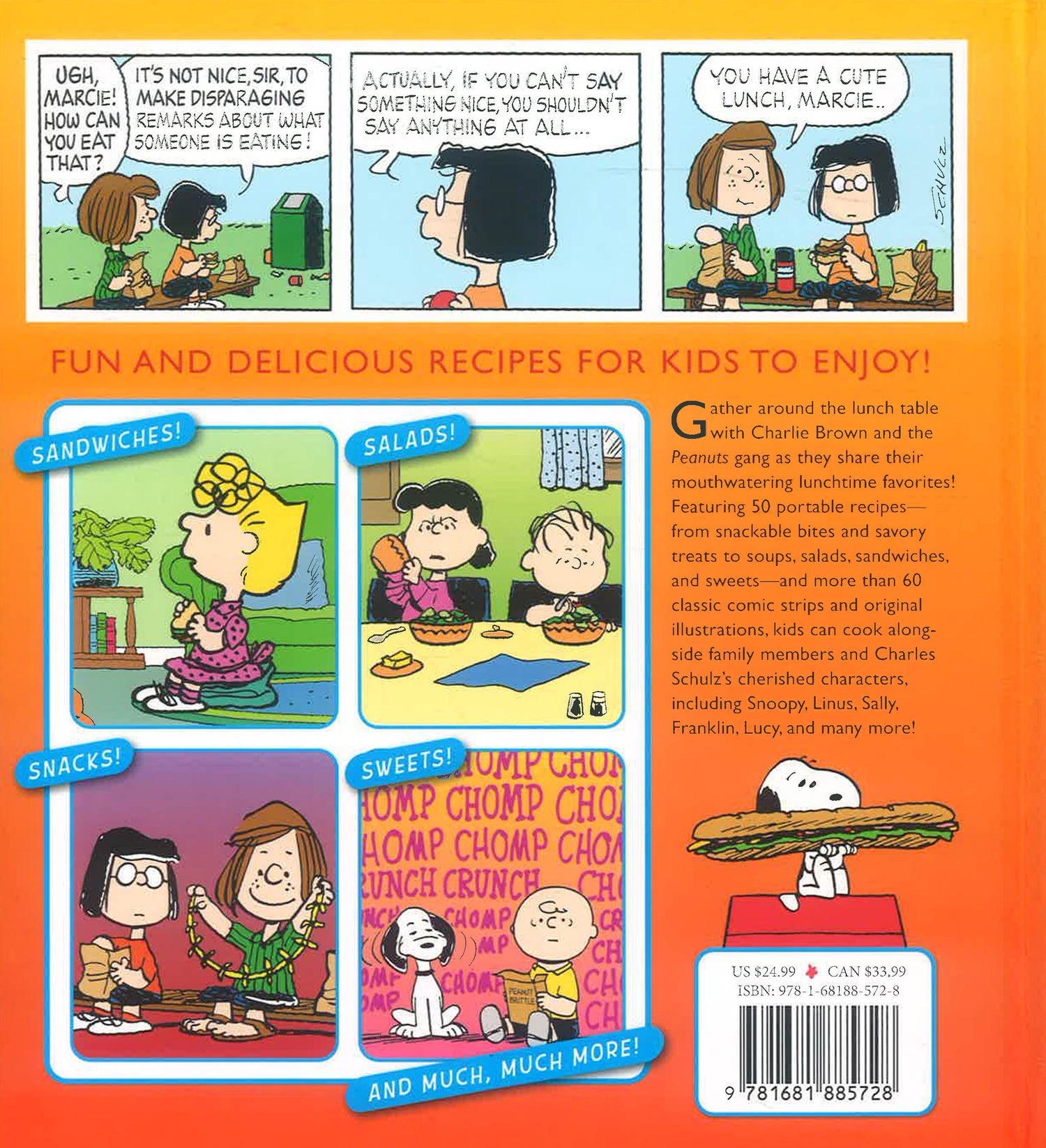 Join the peanuts gang around the lunch table as they share all of their favorite portable midday treats. From Charlie Brown's Lonesome Peanut Butter and Jelly Pockets to Snoopy's Flying Ace Pizza, and Lucy's Crabby Avocado Toasts to Linus' Great Pumpkin Bread, Charles Schulz's beloved characters inspired delightful riffs on delicious, kid-friendly recipes made portable for school time dining. Featuring more than 50 delicious recipes accompanied by a colorful array of classic comic strips and original illustrations, kids will share the kitchen and the lunch table with Charles Schulz's beloved characters, including Charlie Brown, Snoopy, Lucy, Linus, Pig Pen Schroeder, and many more!