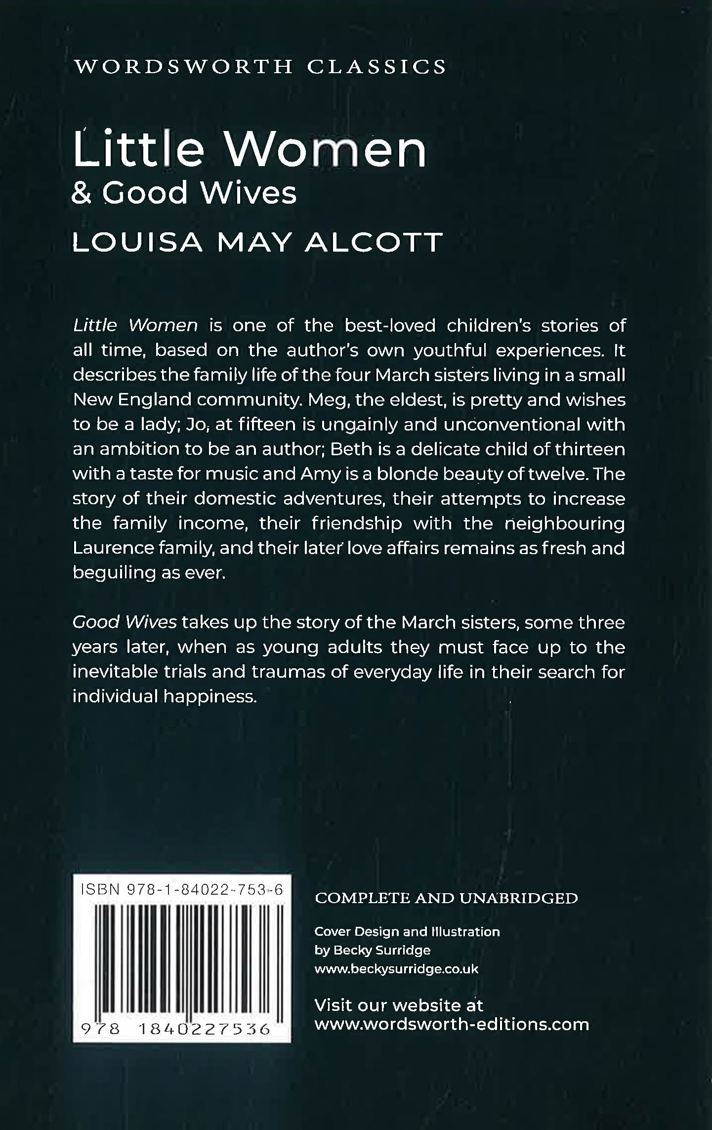 Little Women by Louisa May Alcott is one of the best-loved children's stories of all time, based on the author's own youthful experiences. It describes the family life of the four March sisters living in a small New England community. Meg, the eldest, is pretty and wishes to be a lady; Jo, at fifteen, is ungainly and unconventional with an ambition to be an author; Beth is a delicate child of thirteen with a taste for music and Amy is a blonde beauty of twelve. The story of their domestic adventures, their attempts to increase the family income, their friendship with the neighboring Lawrence family and their later love affairs remains as fresh and beguiling as ever. This edition also includes the sequel, Good Wives, which takes up the story of the March sisters some three years later when, as young adults, they must face up to the inevitable trials and traumas of everyday life in their search for individual happiness.