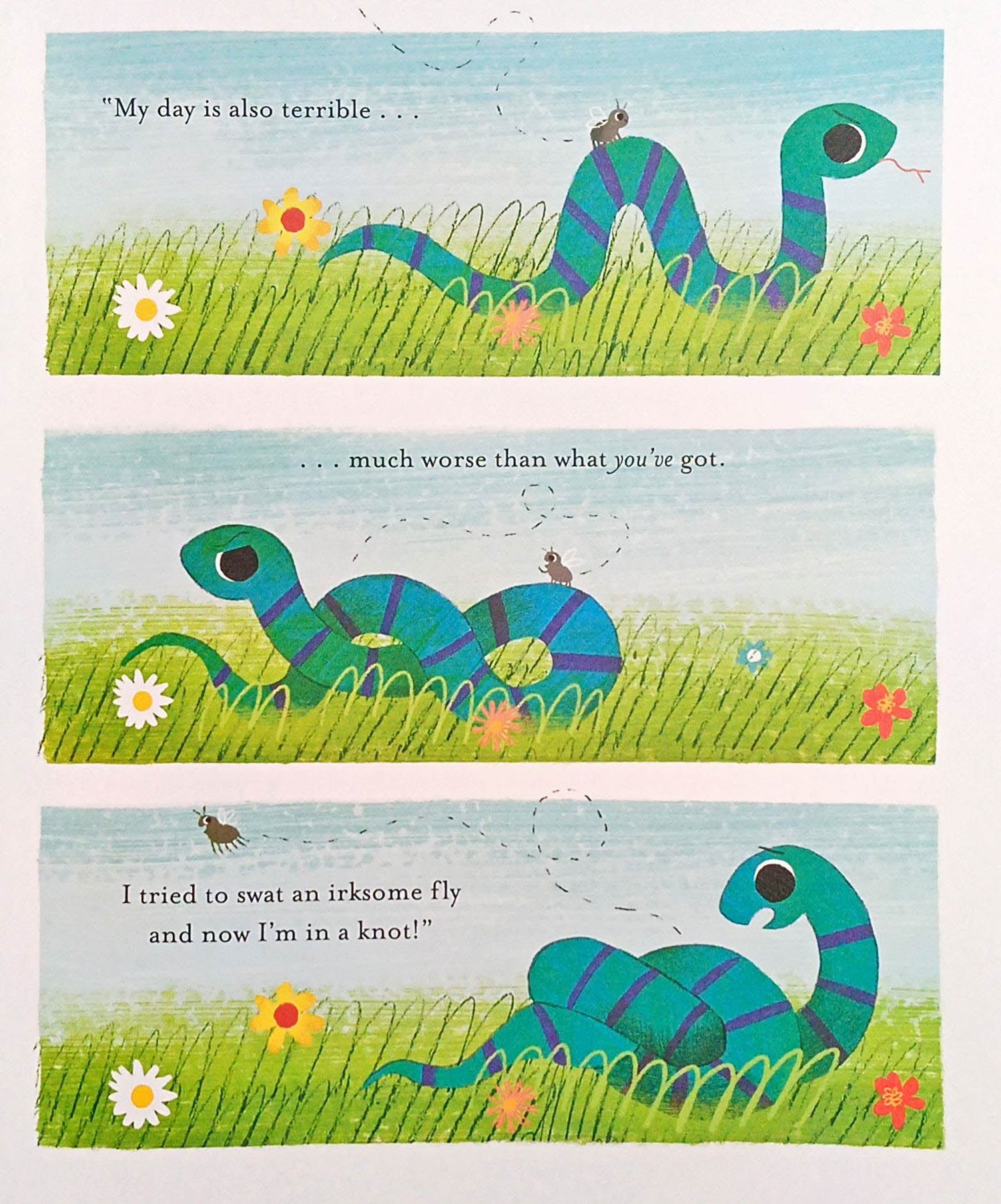 Squirrel is left hanging when a search for a tasty nut goes wrong. Meanwhile, Woodpecker has his beak buried in a tree trunk, Snake is tied in a knot, Turtle is upside down, and Fox? Well, Fox has a suspicious tummy ache . . .These animals are all having a VERY BAD DAY!
