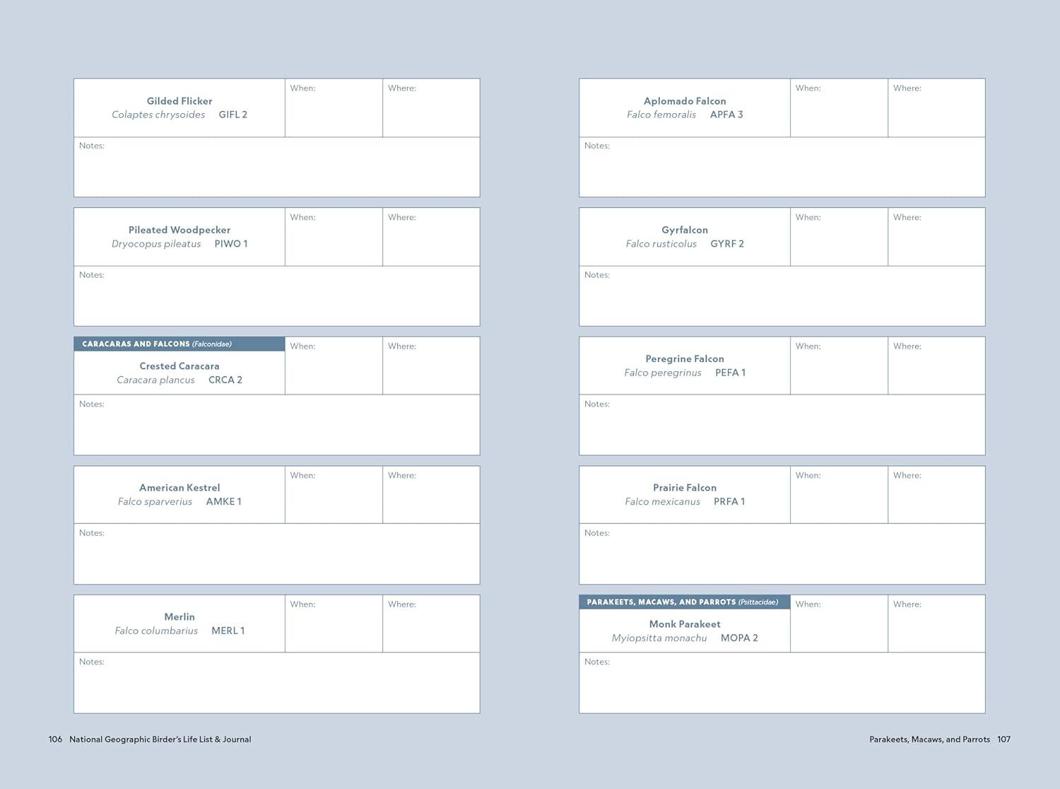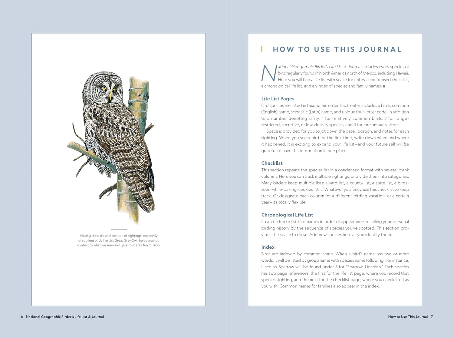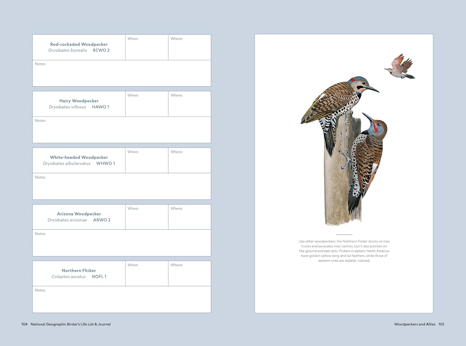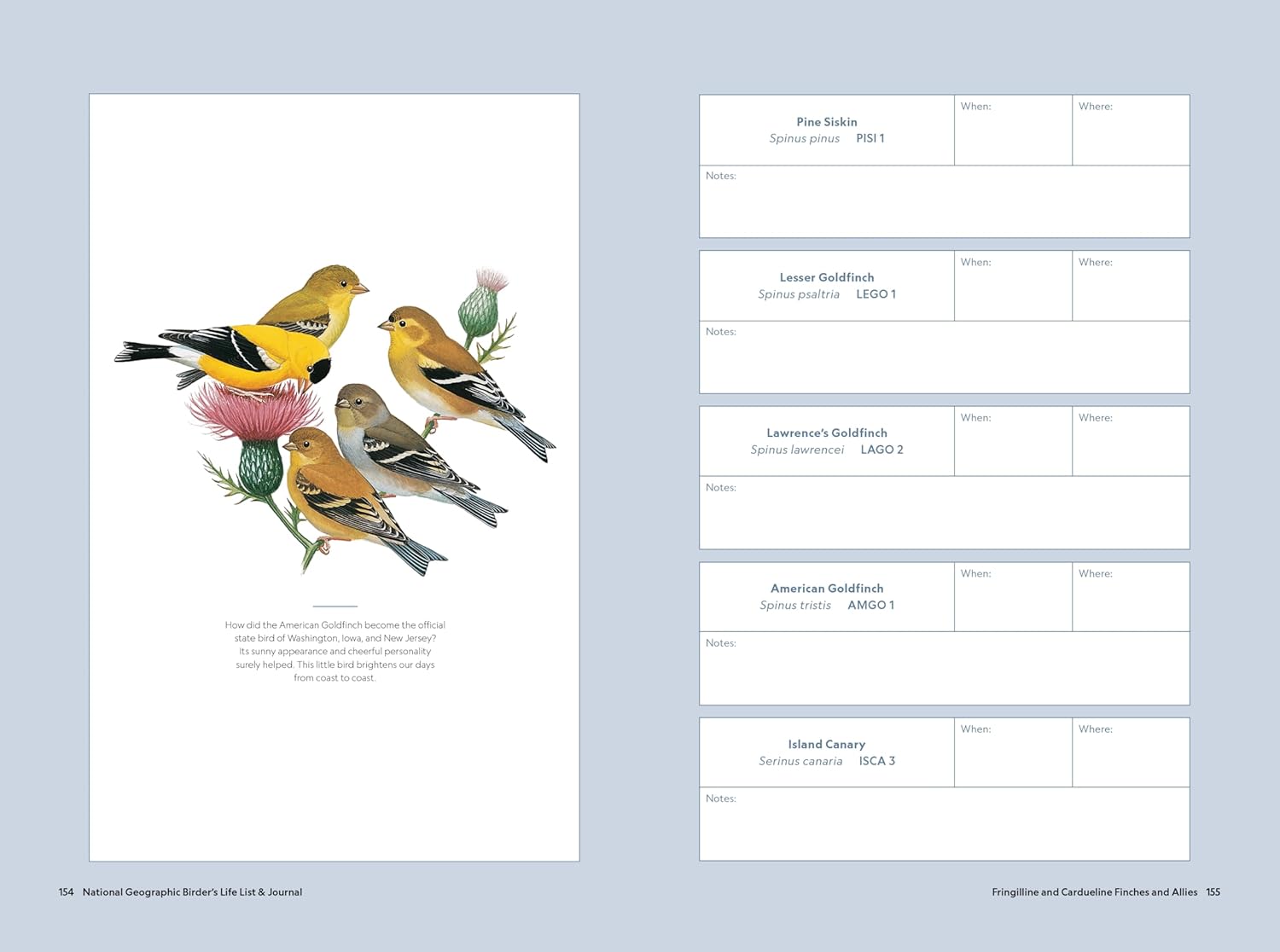 Every birder keeps a life list―a personal record of each new species as it is observed―and this beautiful blank book offers the perfect way to do so, with room for dates, locations, and personal notes, encompassing a lifetime of bird-watching adventures. Organized to match ornithological taxonomy, with graceful illustrations of common species, occasional text by renowned birding expert Noah Strycker, and an index for easy navigation, this journal makes the mission of keeping a life list all the more convenient and rewarding. Complementing National Geographic's best-selling birding field guides, National Geographic Birder's Life List & Journal is the ideal accessory and gift for birders of all ages and at all levels of experience.
