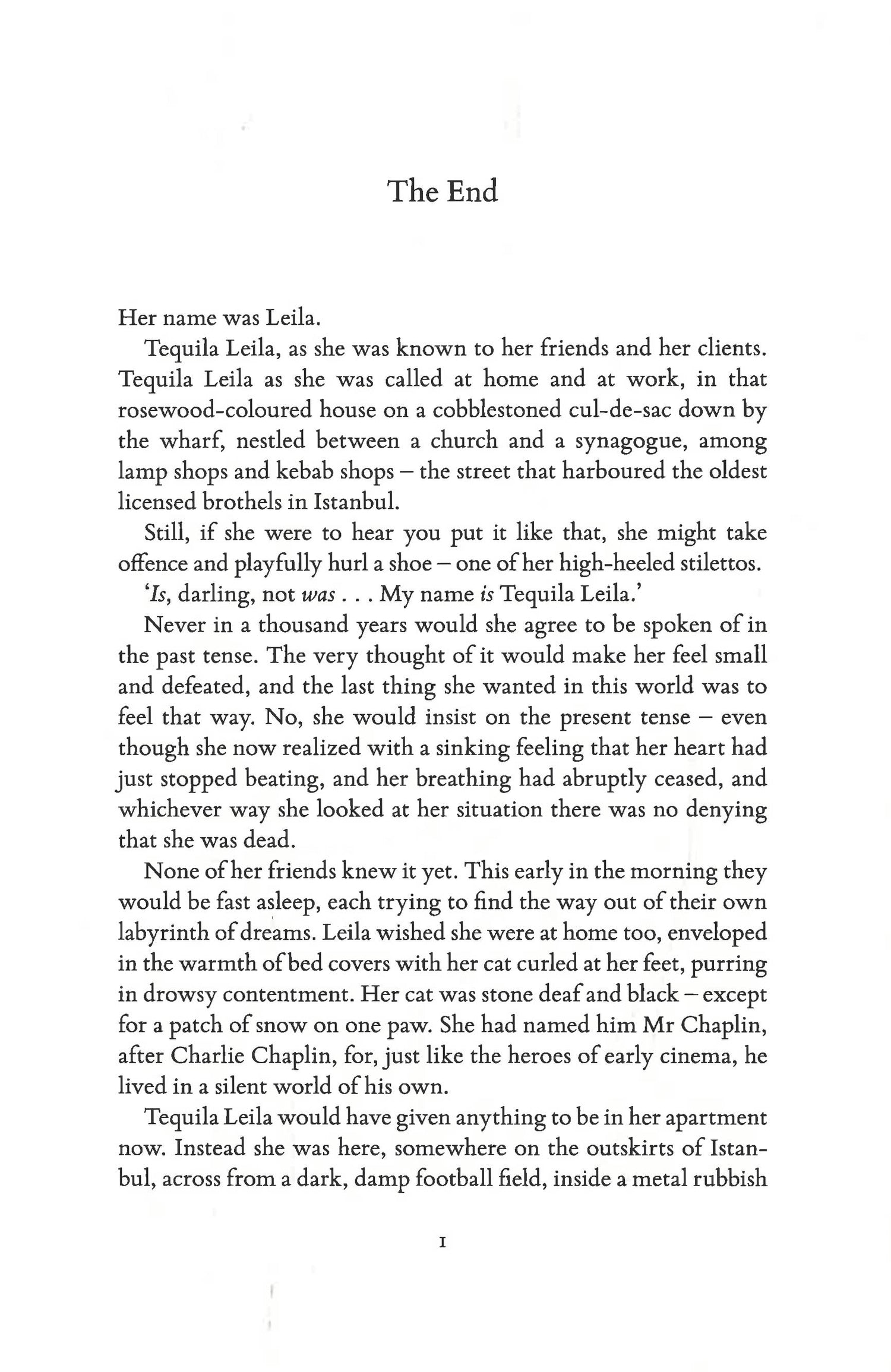 In Tequila Leila's death, the secrets and wonders of modern Istanbul come to life, painted vividly by the captivating tales of how Leila came to know and be loved by her friends. As her epic journey to the afterlife comes to an end, it is her chosen family who brings her story to a buoyant and breathtaking conclusion.