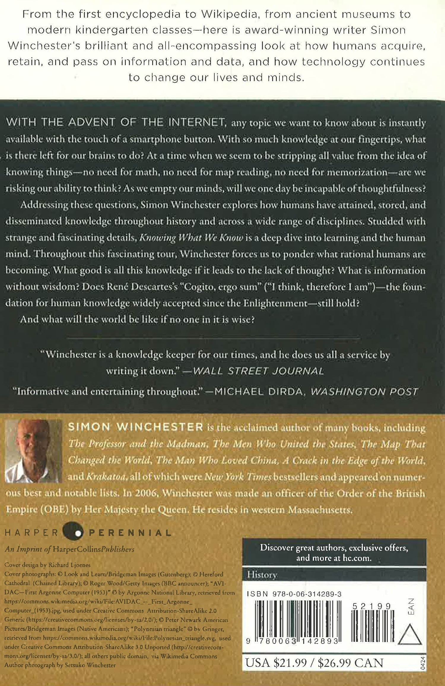 Addressing these questions, Simon Winchester explores how humans have attained, stored, and disseminated knowledge. Examining such disciplines as education, journalism, encyclopedia creation, museum curation, photography, and broadcasting, he looks at a whole range of knowledge diffusion--from the cuneiform writings of Babylon to the machine-made genius of artificial intelligence, by way of Gutenberg, Google, and Wikipedia to the huge Victorian assemblage of the Mundanaeum, the collection of everything ever known, currently stored in a damp basement in northern Belgium.