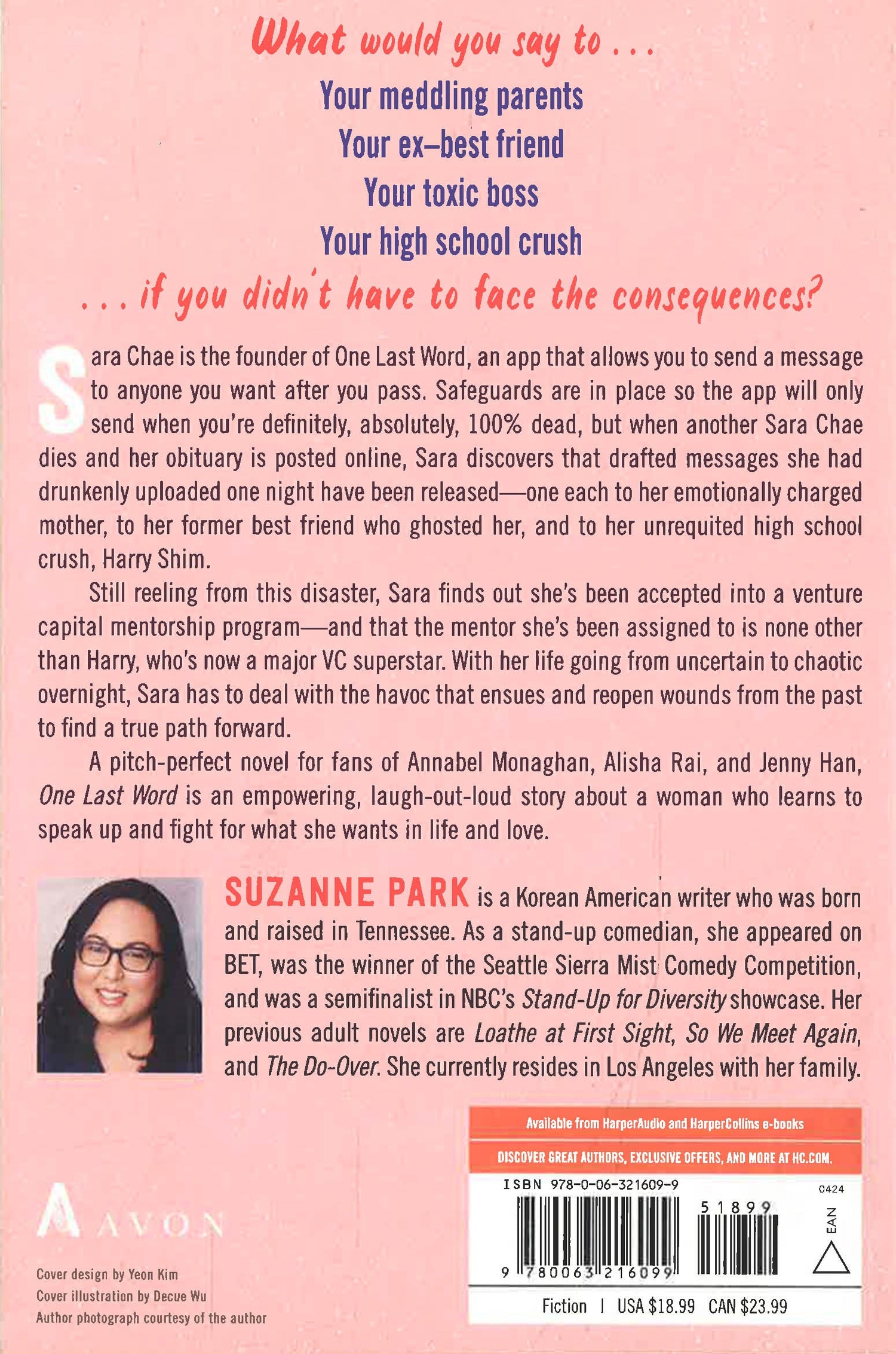 Sara Chae is the founder of One Last Word, an app that allows you to send a message to anyone you want after you pass. Safeguards are in place so the app will only send when you’re definitely, absolutely, 100% dead, but when another Sara Chae dies and her obituary is posted online, Sara discovers that drafted messages she had drunkenly uploaded on one night have been released ―one each to her emotionally charged mother, to her former best friend who ghosted her, and to her unrequited high school crush, Harry Shim.