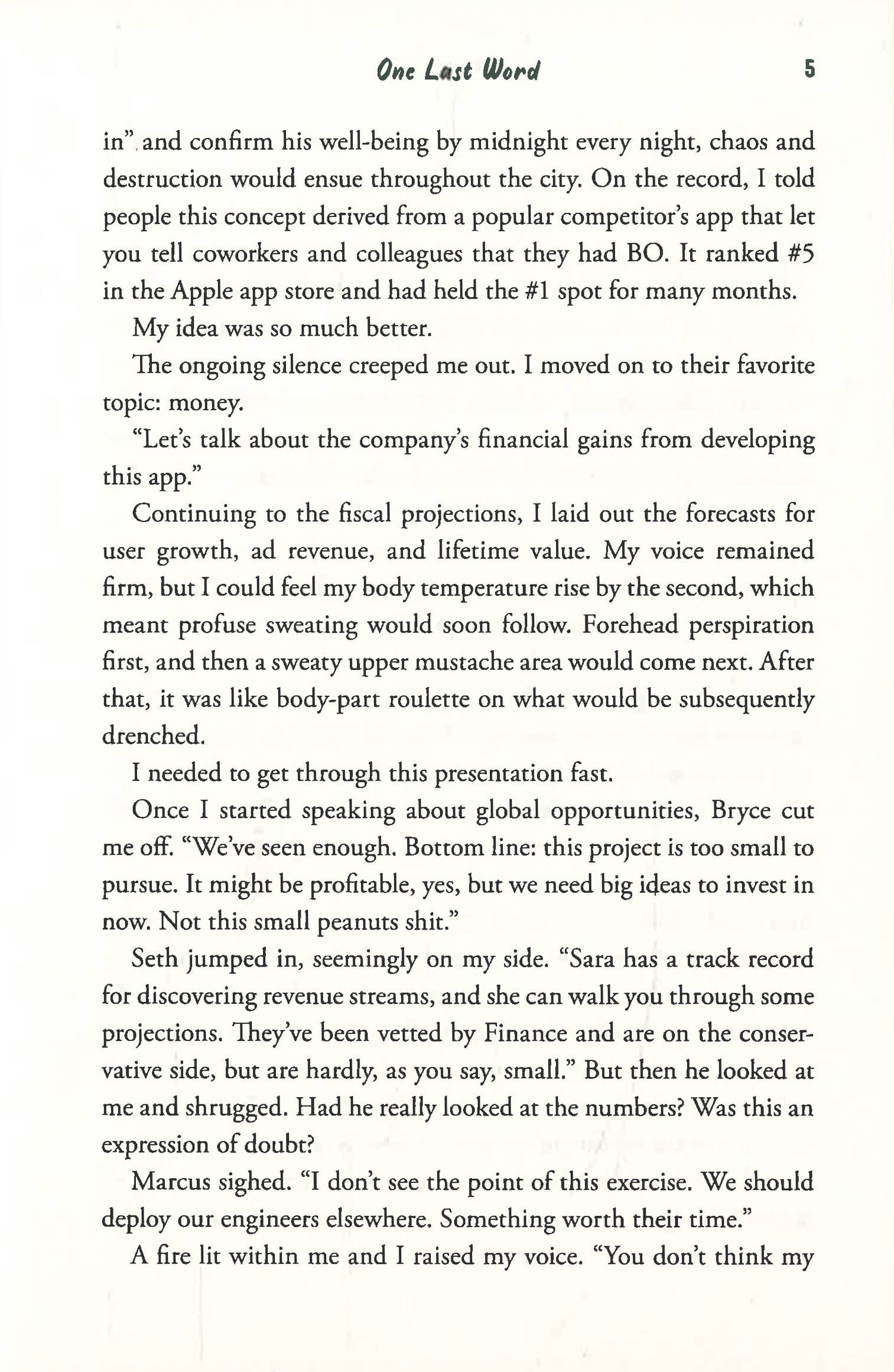 Still reeling from this disaster, Sara finds out she’s been accepted into a venture capital mentorship program― and that the mentor she’s been assigned to is none other than Harry, who’s now a major VC superstar. With her life going from uncertain to chaotic overnight, Sara has to deal with the havoc that ensues and reopen wounds from the past to find a true path forward.