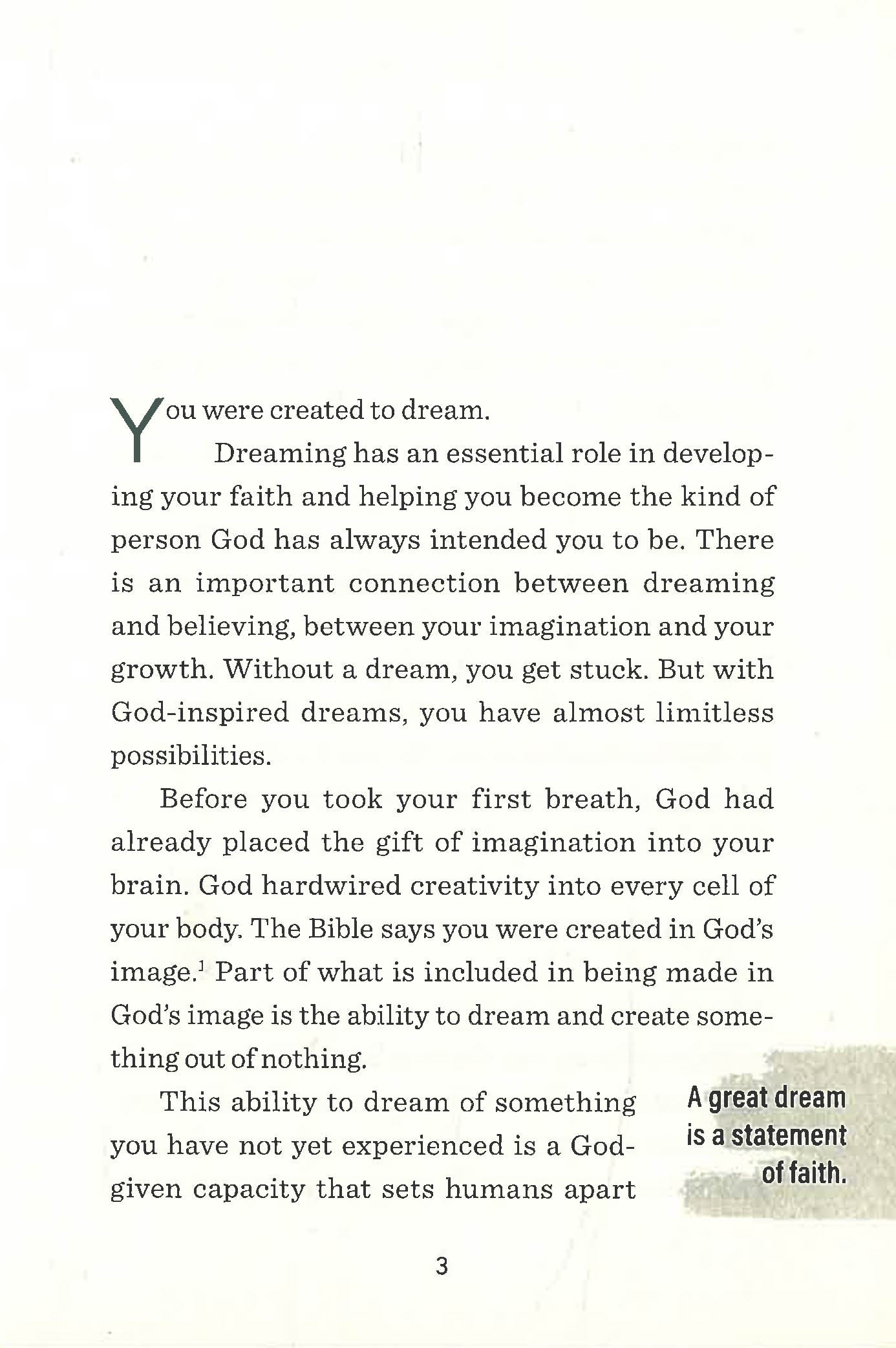 A great dream is a statement of faith. Whether you dream of creating something beautiful or accomplishing something incredible, your dream is the first step God uses to develop your spiritual maturity and change your life. The Bible is full of stories of people whose God-given dreams became reality—but to get there, they had to take a journey of faith.