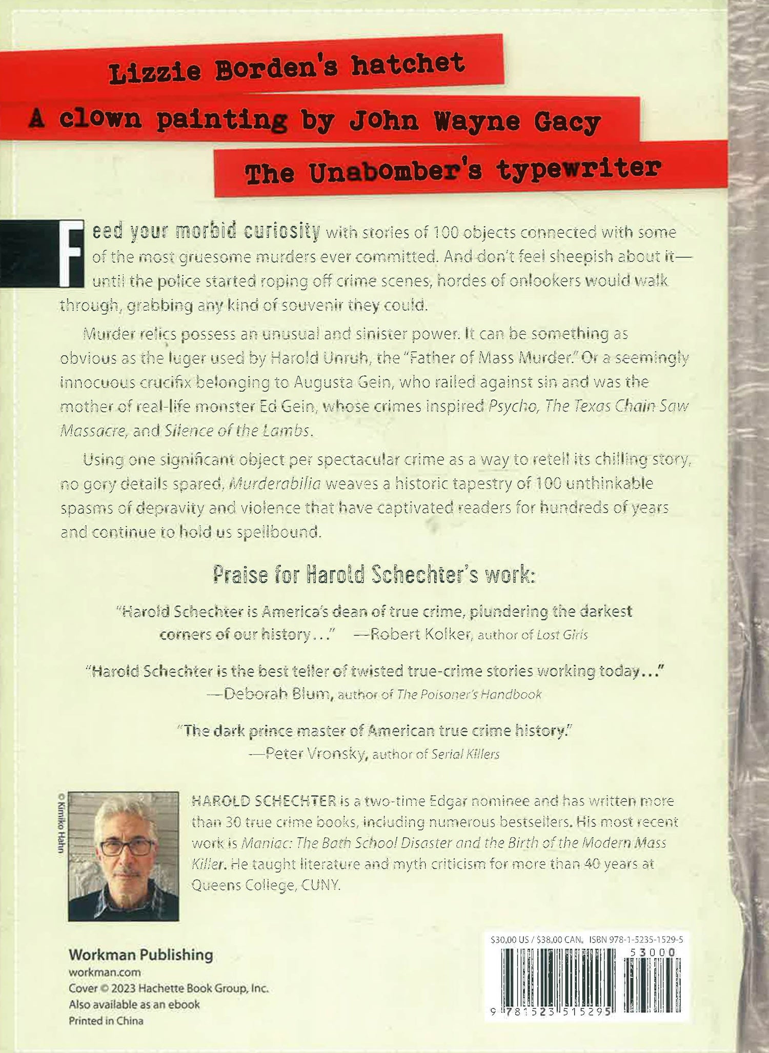 In Murderabilia, veteran true crime writer Harold Schechter presents 100 murder-related artefacts spanning two centuries (1808-2014), with accompanying stories of various lengths. A visual and literary journey, it presents a history unlike any previously told in the true crime genre, one that speaks to the dark fascination of true crime fans while also presenting a larger historical timeline of how and why we continue to be captivated by the most sensational crimes and killers among us.