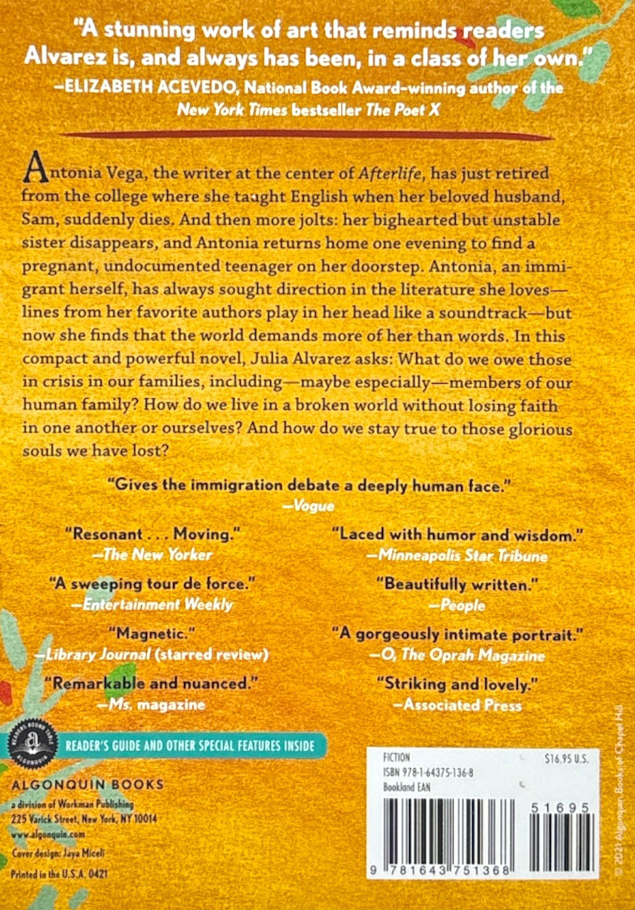 Antonia Vega, the immigrant writer at the center of Afterlife, has had the rug pulled out from under her. She has just retired from the college where she taught English when her beloved husband, Sam, suddenly dies. And then more jolts: her bighearted but unstable sister disappears, and Antonia returns home one evening to find a pregnant, undocumented teenager on her doorstep. Antonia has always sought direction in the literature she loves—lines from her favorite authors play in her head like a soundtrack—but now she finds that the world demands more of her than words.