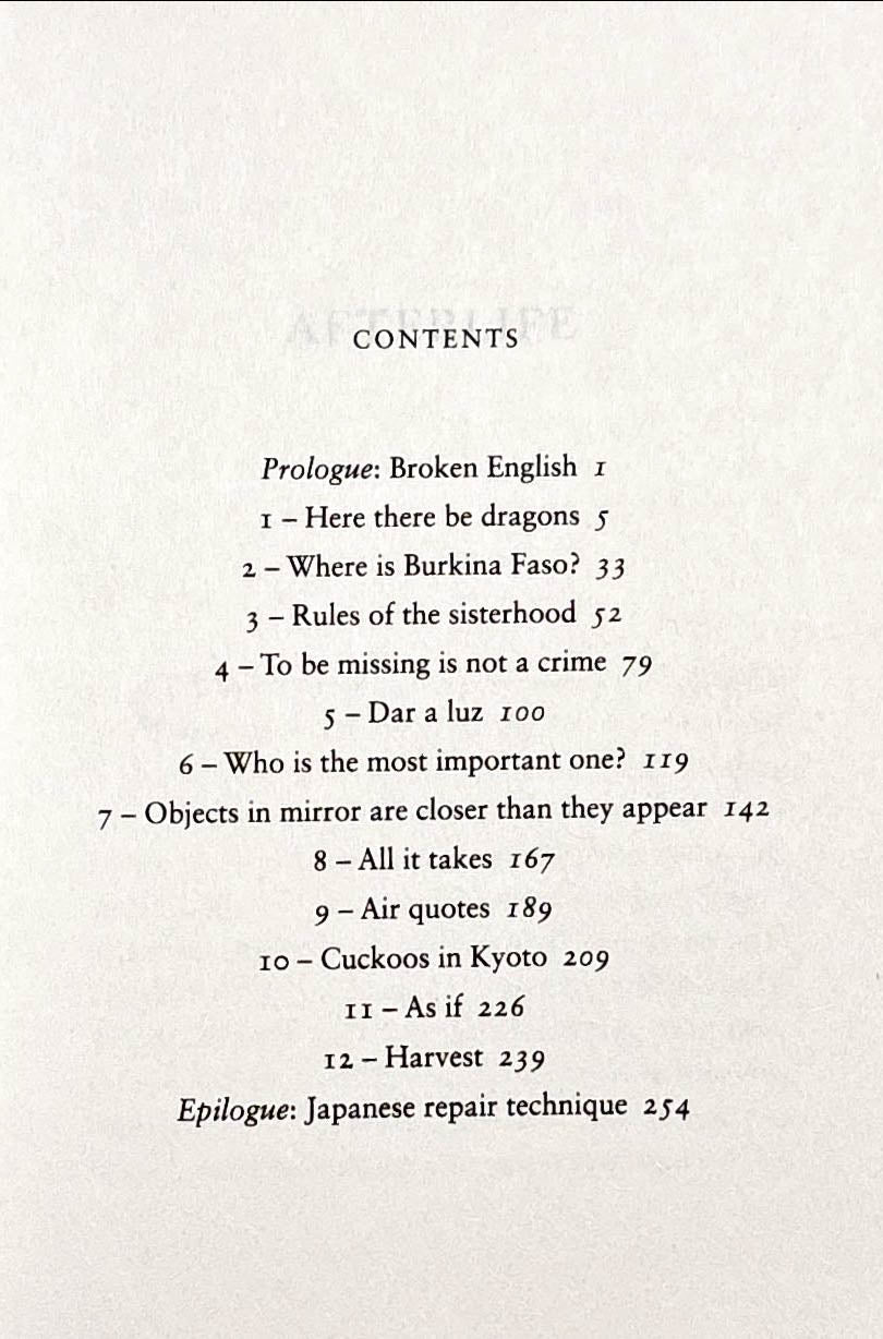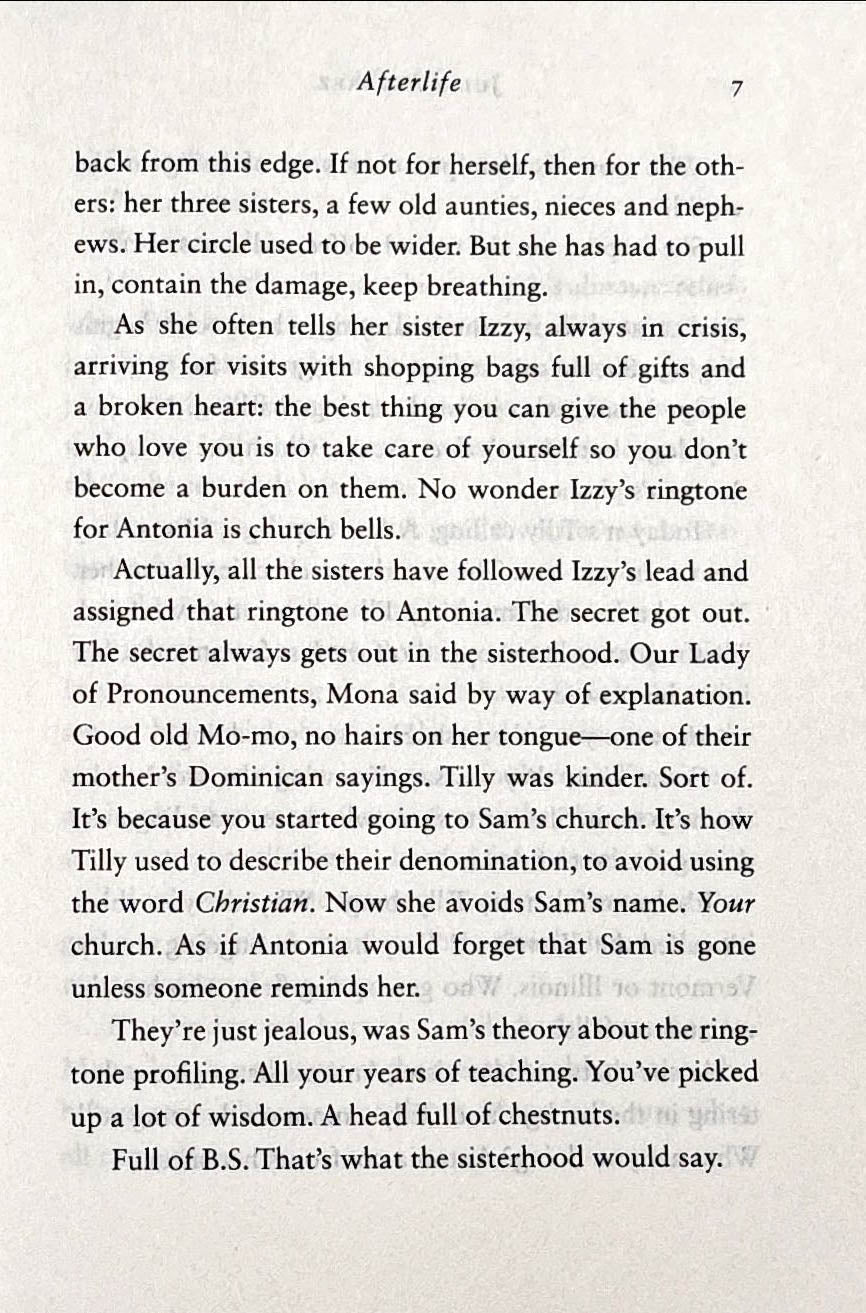 Afterlife is a compact, nimble, and sharply droll novel. Set in this political moment of tribalism and distrust, it asks: What do we owe those in crisis in our families, including—maybe especially—members of our human family? How do we live in a broken world without losing faith in one another or ourselves? And how do we stay true to those glorious souls we have lost?
