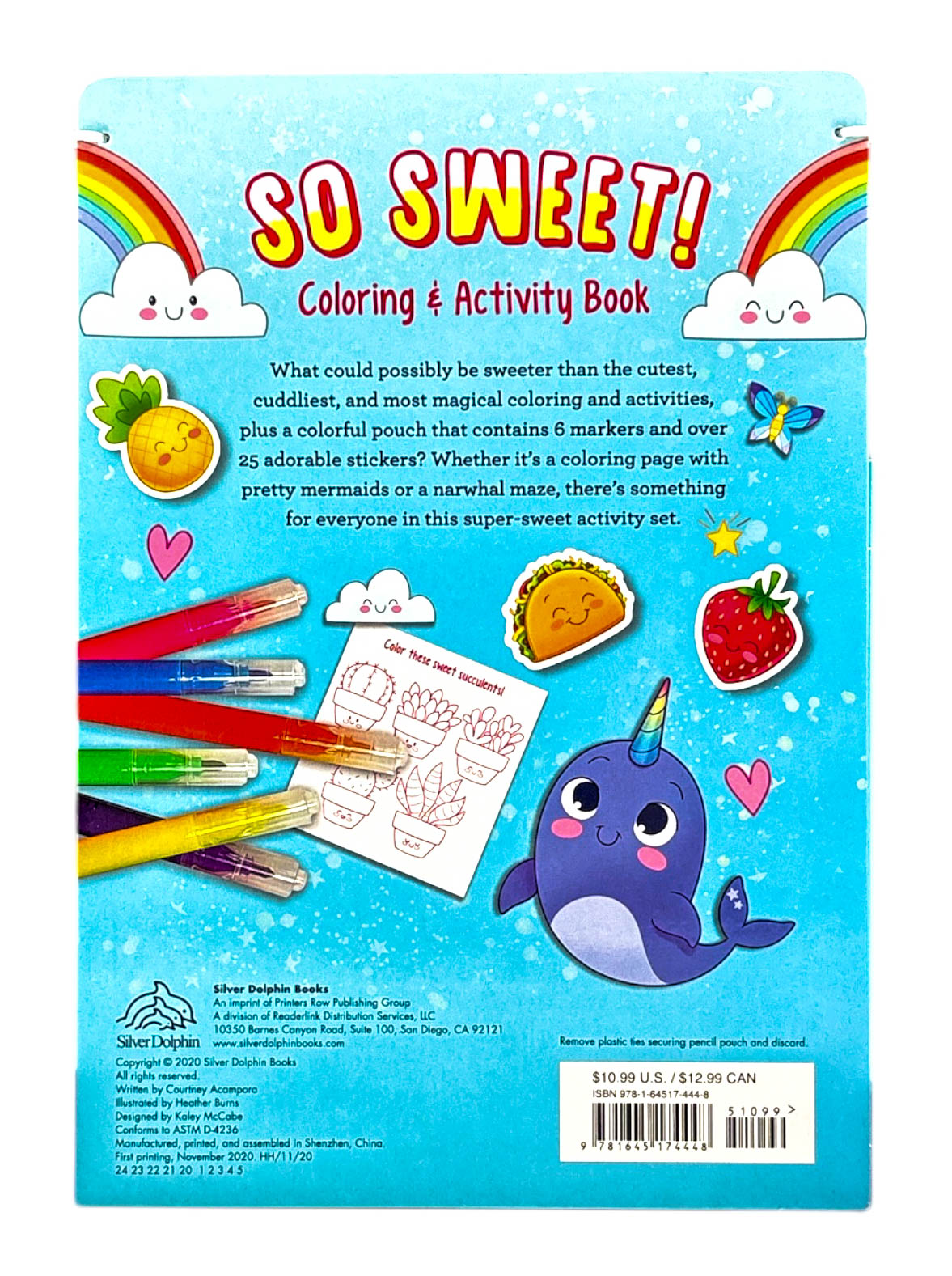 What could be sweeter than a coloring and activity book jam-packed with fun that includes markers and a removable pouch to store them? So Sweet! Coloring & Activity Book includes the cutest, cuddliest, and most magical coloring and activities—plus a printed removable pouch filled with 6 markers and 26 adorable stickers!