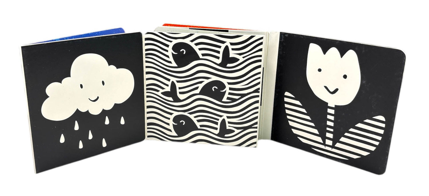 This sturdy accordion book opens up to stand alone in a crib, on the carpet, or on a bed, making it easy for your baby to enjoy tummy time, all the time. One side feature vibrantly illustrated smiling babies and other cheerful images, and the opposite side has high-contrast black and white patterns, perfect for baby's developing eyes. And with two reflective pages, your baby can see him- or herself and practice those future smiles!