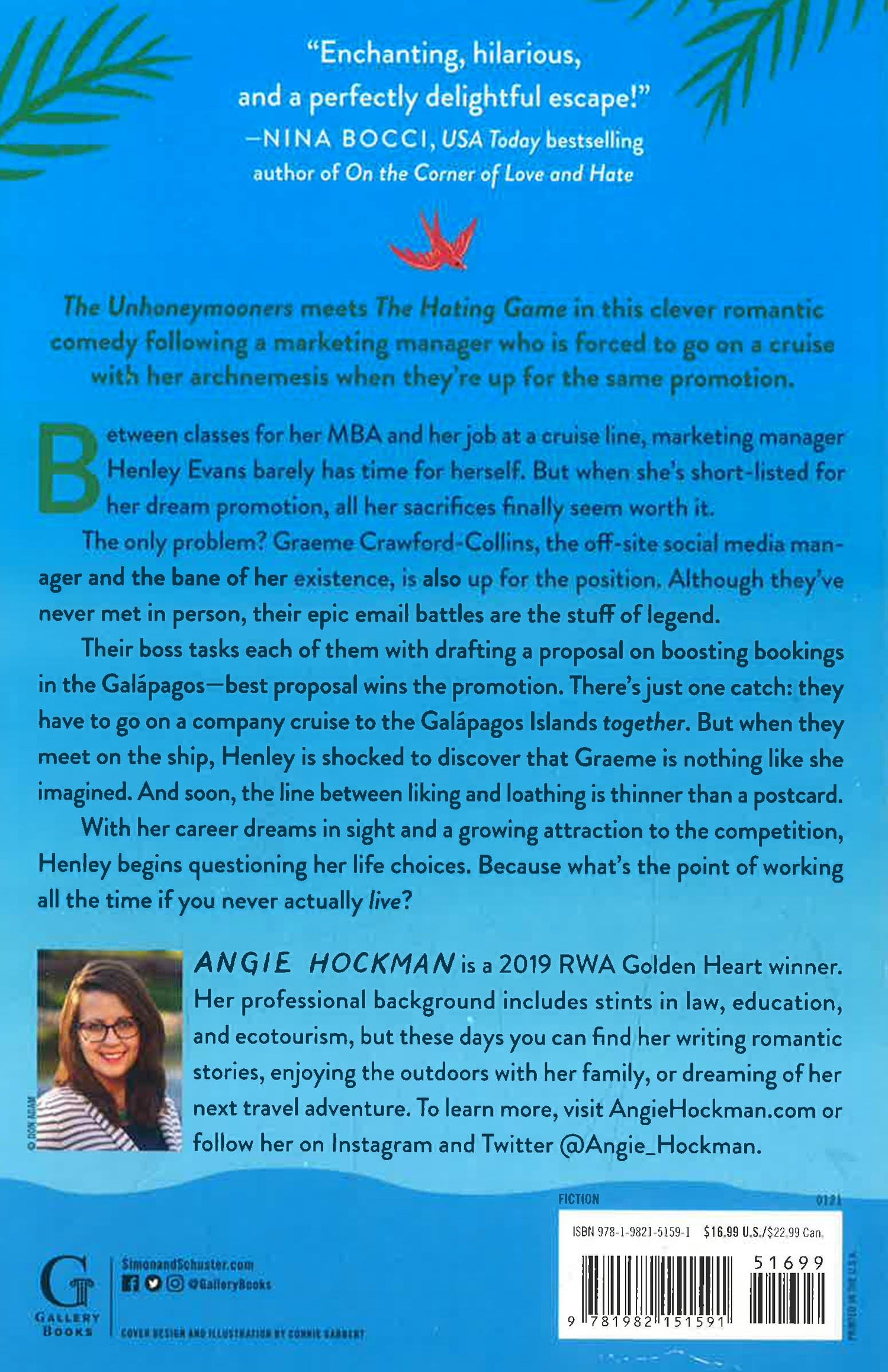 Their boss tasks each of them with drafting a proposal on how to boost bookings in the Galápagos—best proposal wins the promotion. There’s just one catch: they have to go on a company cruise to the Galápagos Islands...together. But when the two meet on the ship, Henley is shocked to discover that the real Graeme is nothing like she imagined. As they explore the Islands together, she soon finds the line between loathing and liking thinner than a postcard.