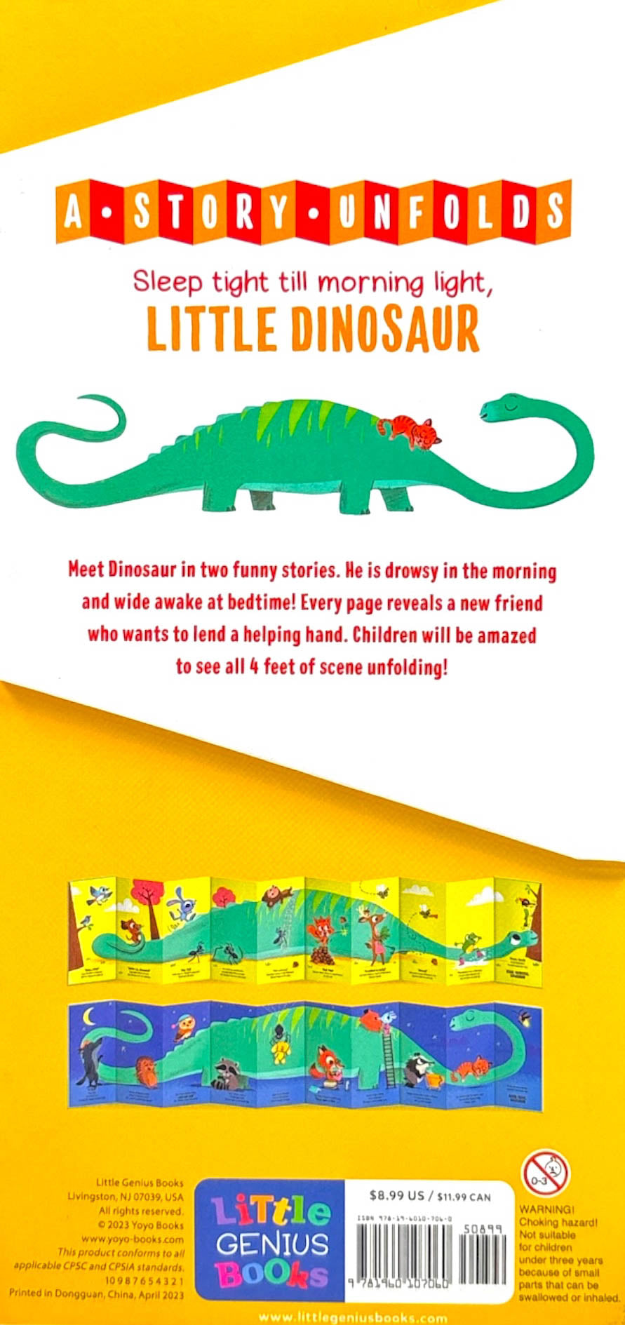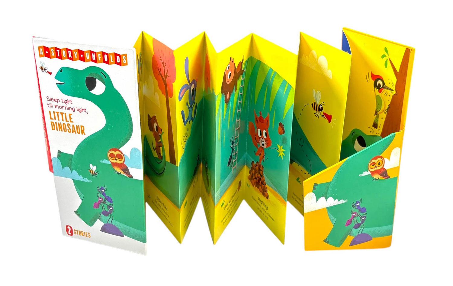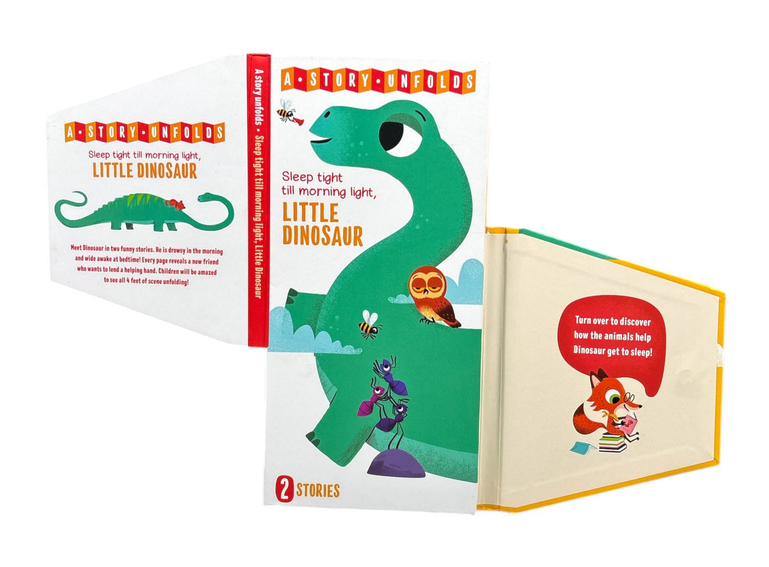Discover the best extra-long fold-out books for children with two entertaining stories per title: one story for morning and day, and one story for bedtime and night! Meet our merry little friend, little dinosaur!