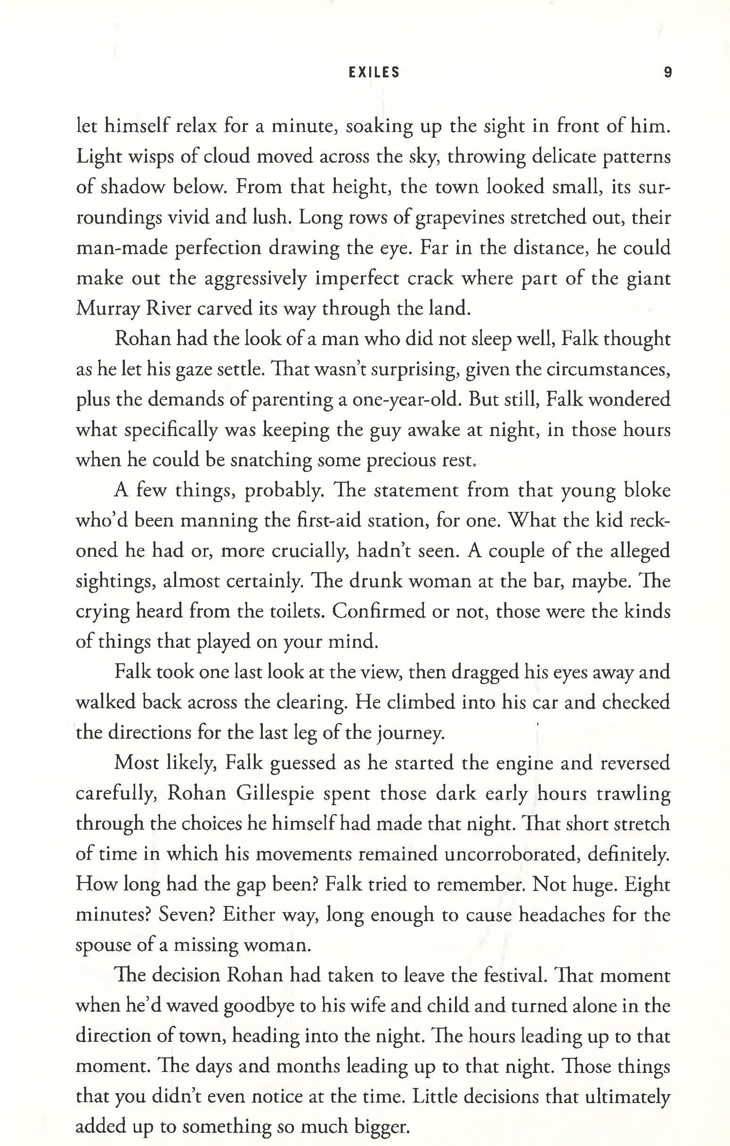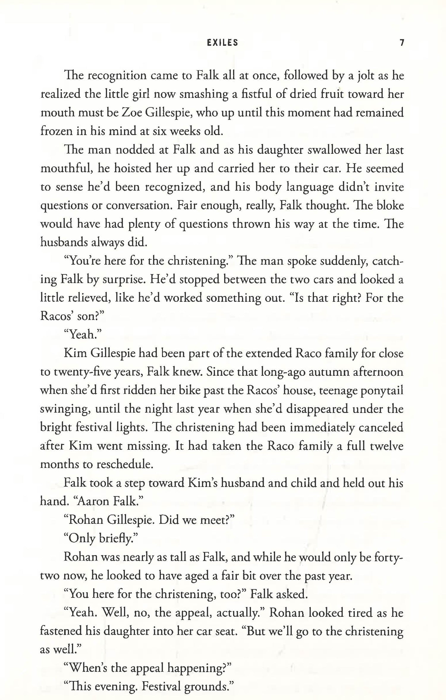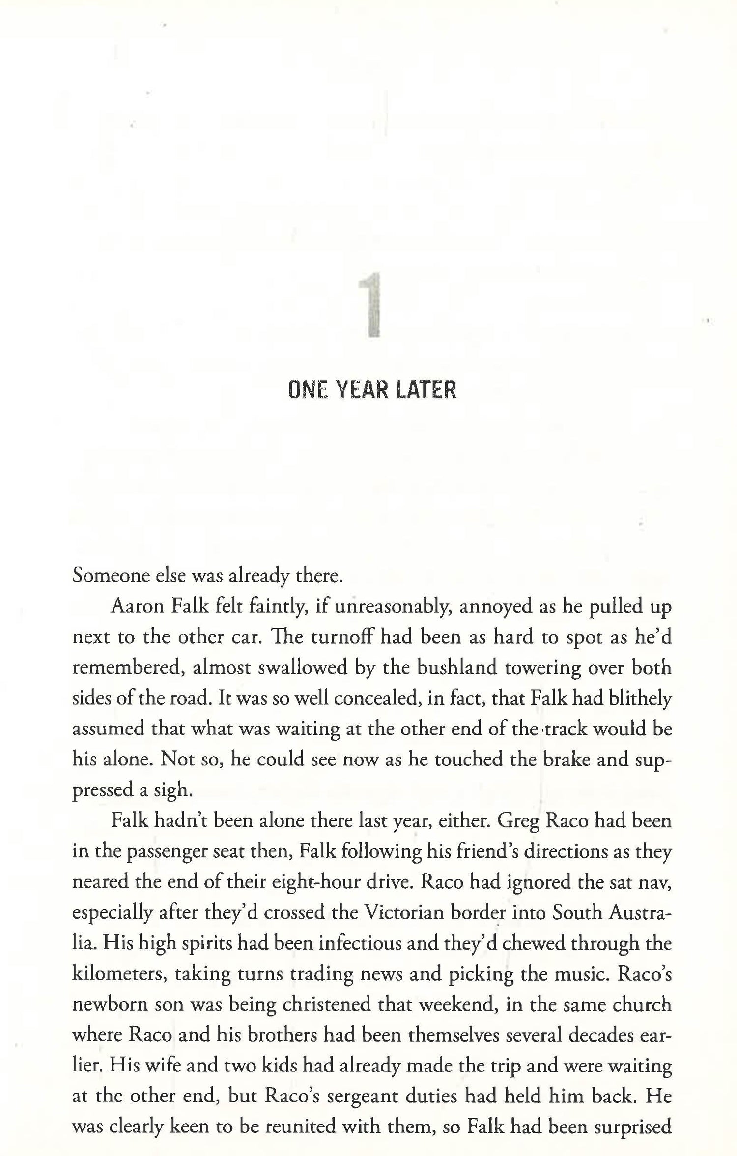 Federal Investigator Aaron Falk is on his way to a small town deep in Southern Australian wine country for the christening of an old friend's baby. But mystery follows him, even on vacation.