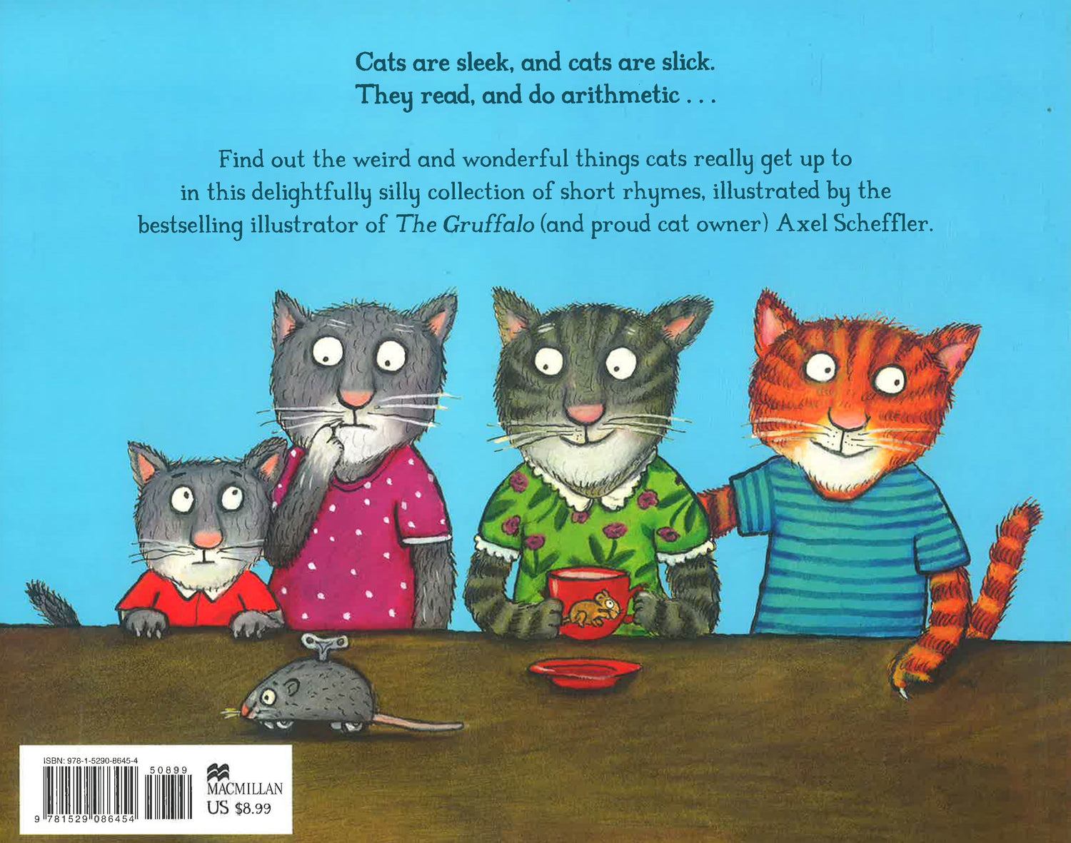 Have you ever seen a cat playing a piano? Or taking a bubble bath with a rubber duck? Find out what cats really get up to when people aren't around! Axel Scheffler's charming and witty illustrations introduce all kinds of cats - making mischief, playing games, singing songs and out on adventures. This collection of hilarious, quirky poems by Frantz Wittkamp is wonderfully adapted from German to English for the very first time by celebrated children's author David Henry Wilson.