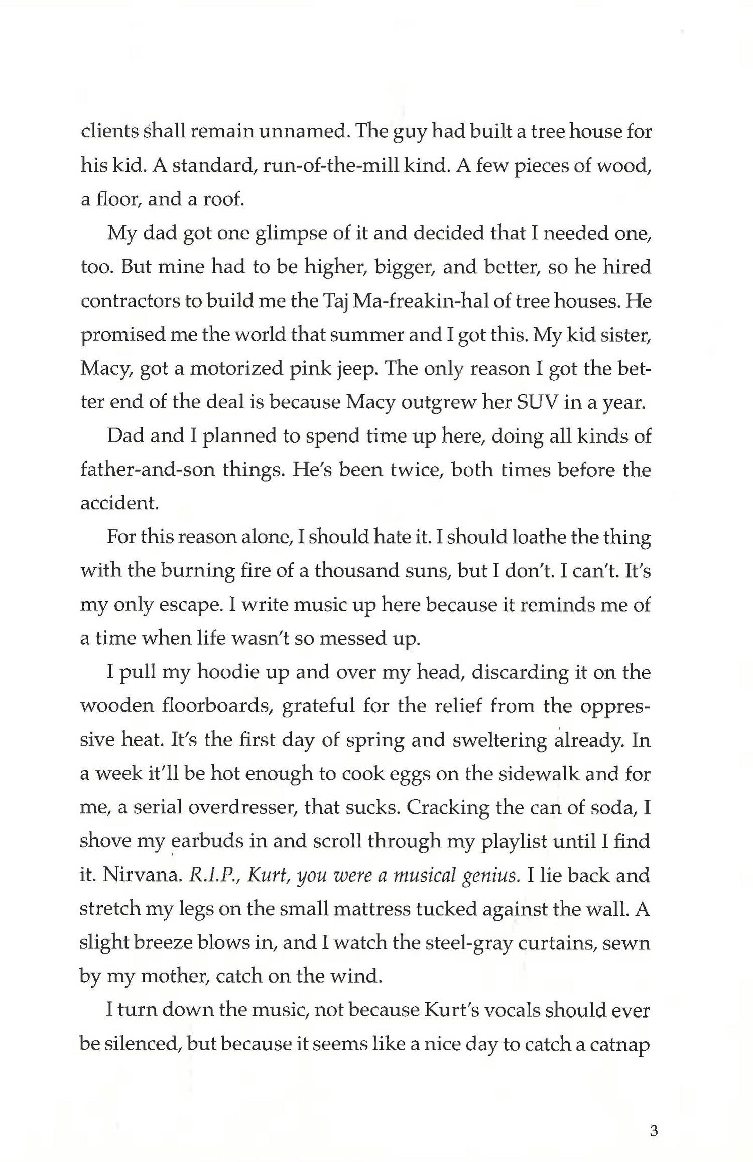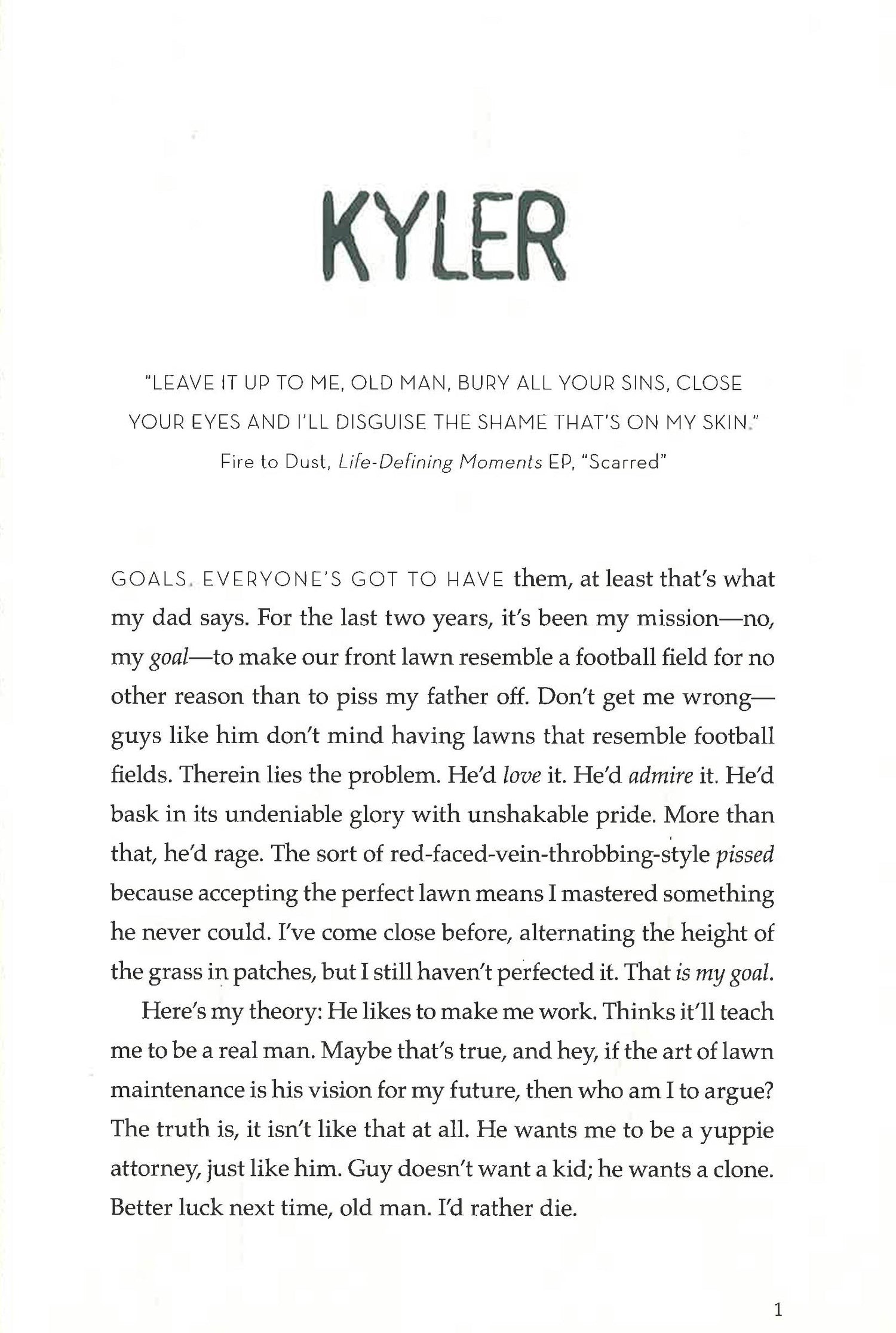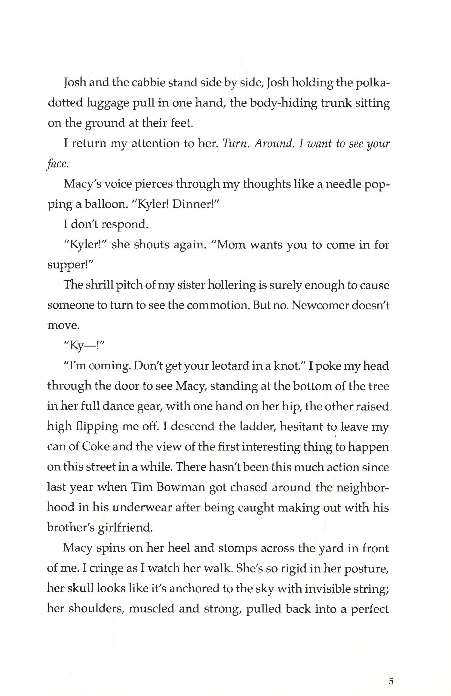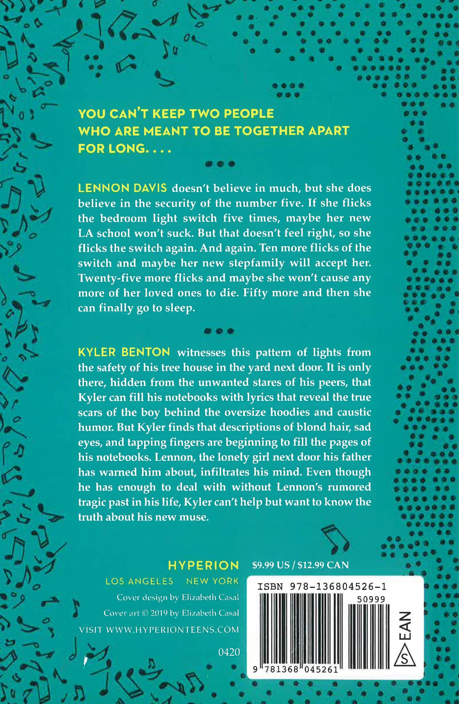 Lennon Davis doesn't believe in much, but she does believe in the security of the number five. If she flicks the bedroom light switch five times, maybe her new LA school won't suck. But that doesn't feel right, so she flicks the switch again. And again. Ten more flicks of the switch and maybe her new stepfamily will accept her. Twenty-five more flicks and maybe she won't cause any more of her loved ones to die. Fifty more and then she can finally go to sleep. Kyler Benton witnesses this pattern of lights from the safety of his tree house in the yard next door. It is only there, hidden from the unwanted stares of his peers, that Kyler can fill his notebooks with lyrics that reveal the true scars of the boy behind the oversize hoodies and caustic humor. But Kyler finds that descriptions of blond hair, sad eyes, and tapping fingers are beginning to fill the pages of his notebooks. Lennon, the lonely girl next door his father has warned him about, infiltrates his mind. Even though he has enough to deal with without Lennon's rumored tragic past in his life, Kyler can't help but want to know the truth about his new muse.
