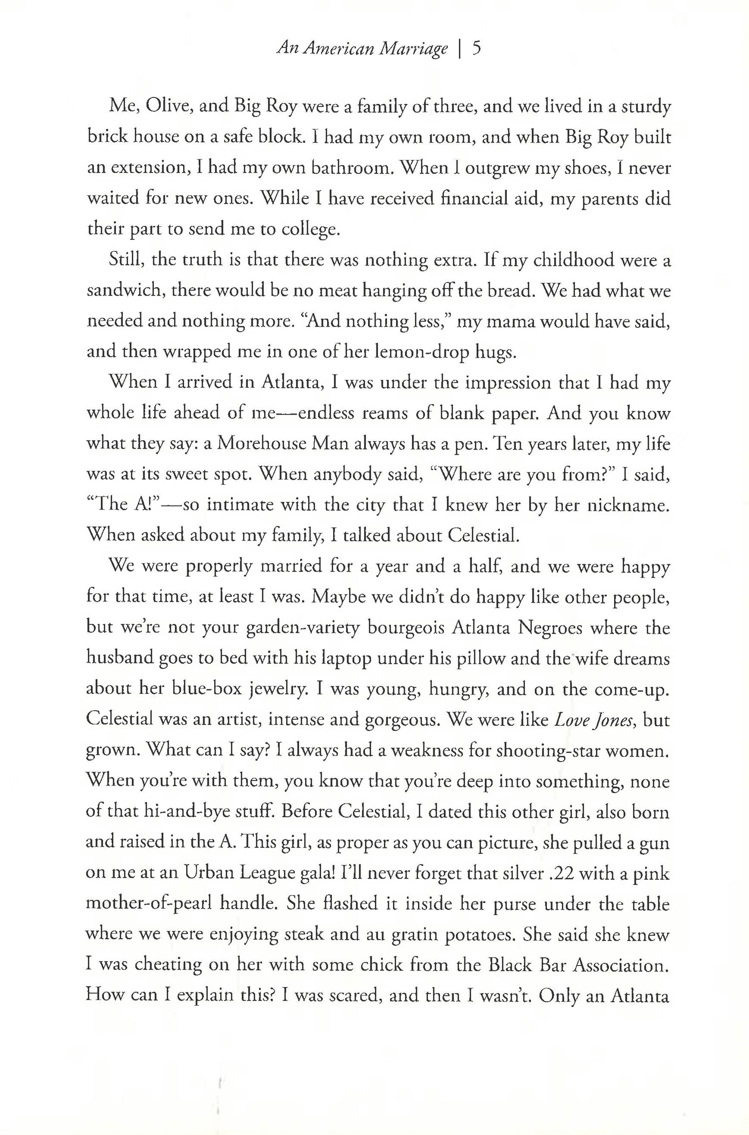 Newlyweds Celestial and Roy are the embodiment of both the American Dream and the New South. He is a young executive, and she is an artist on the brink of an exciting career. But as they settle into the routine of their life together, they are ripped apart by circumstances neither could have imagined. Roy is arrested and sentenced to twelve years for a crime Celestial knows he didn’t commit. Though fiercely independent, Celestial finds herself bereft and unmoored, taking comfort in Andre, her childhood friend, and best man at their wedding. As Roy’s time in prison passes, she is unable to hold on to the love that has been her center. After five years, Roy’s conviction is suddenly overturned, and he returns to Atlanta ready to resume their life together.