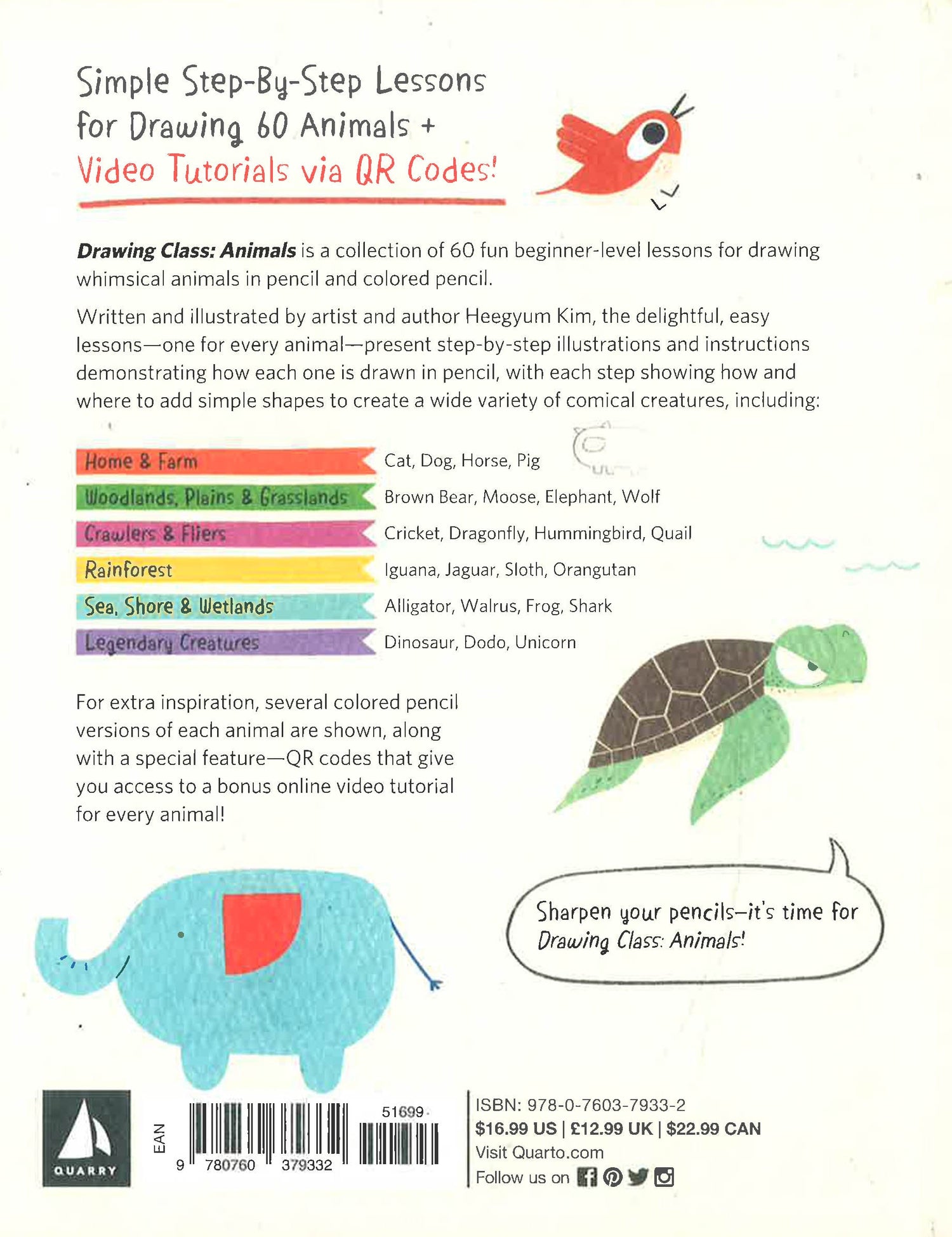 From Heegyum Kim, artist and author of Quarry's Draw 62...and Make Them Cute series, Drawing Class: Animals is a collection of 60 fun, beginner-level lessons for drawing animals in pencil, along with QR codes that link to video tutorials.