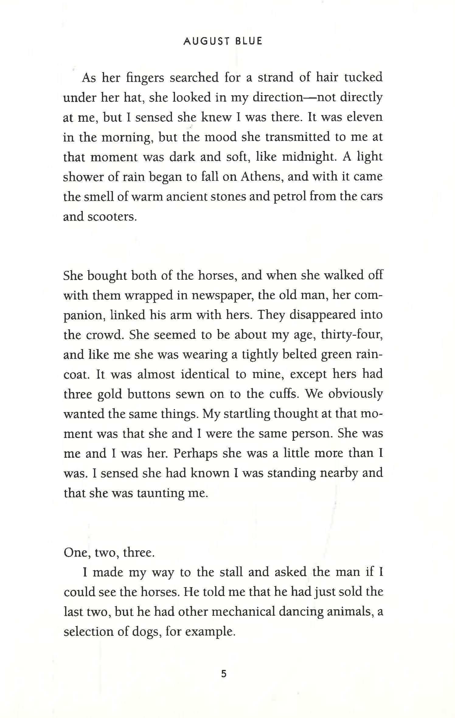 Now she is in Athens, watching an uncannily familiar woman purchase a pair of mechanical dancing horses at a flea market. Elsa wants the horses too, but there are no more for sale. She drifts to the ferry port, on the run from her talent and her history.