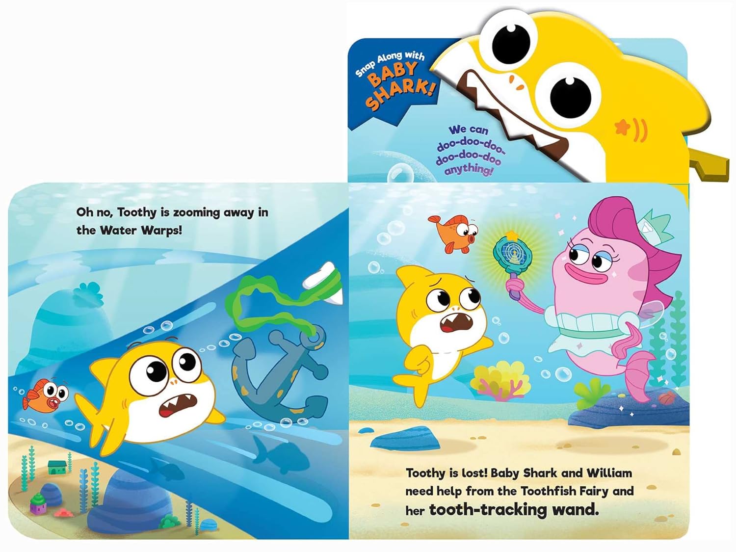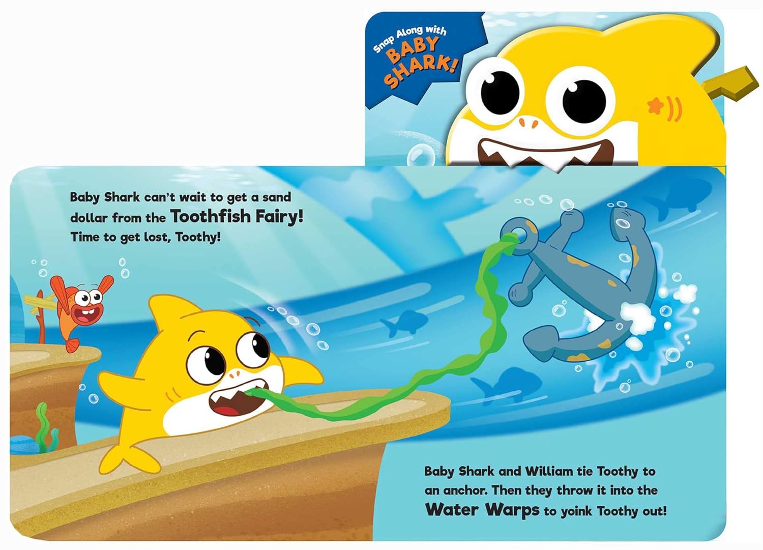 Snap along with the story as Baby Shark and his best friend William search for Toothy in this fun, interactive board book with a snapping, plastic Baby Shark head!
