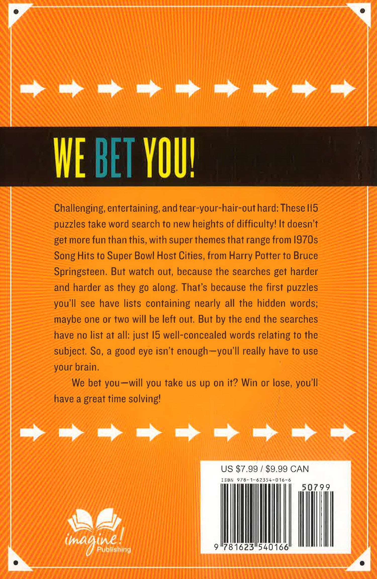 Challenging, entertaining, and tear-your-hair out hard! These 115 puzzles will test the mettle of all solvers―and take word search to new levels of difficulty. With topics that range from 1970s Song Hits to Super Bowl Host Cities, from Harry Potter to Bruce Springsteen, the themes couldn’t be more fun. The trick is that the searches get harder as they go along. In the earliest puzzles, you’ll get a list containing nearly all the hidden words; perhaps just one will be missing. But gradually, the accompanying lists grow shorter and shorter, and by the end, there’s no list at all: just fifteen well-concealed words relating to the subject. So, a good eye isn’t enough―because you won’t know what you’re looking for in advance, it’s also helpful to know something about the theme. For example, in Broadway Musicals, with no guidance, you’ll have to find Camelot, The Book of Mormon, Les Miserables (written backwards), Sweet Charity (reading from bottom to top), and more, from a variety of eras. We’re betting only the best can finish!