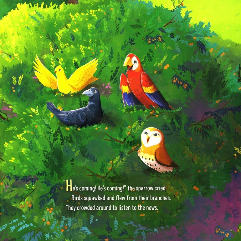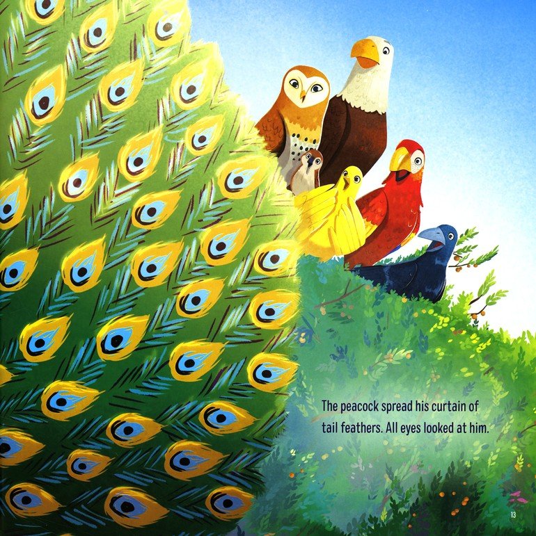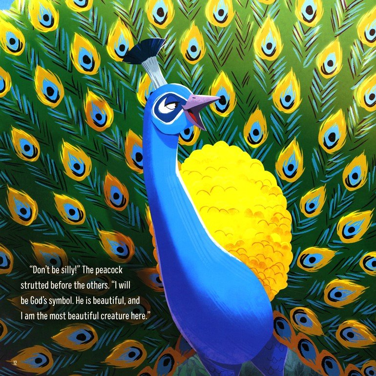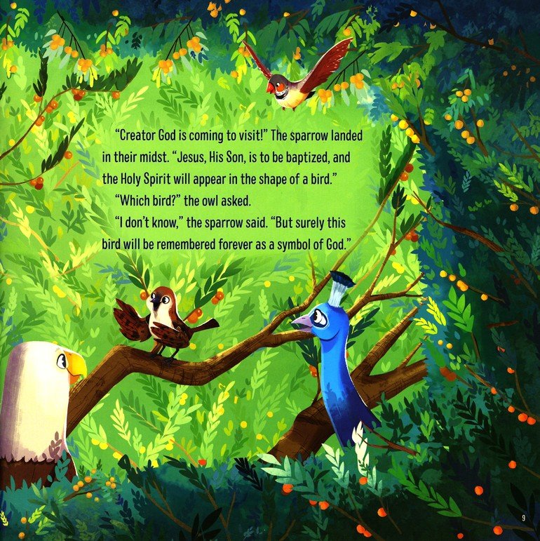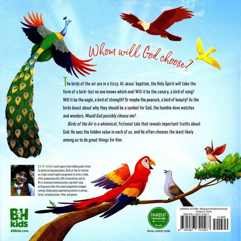 In Birds of the Air by S.E.M. Ishida, several birds hear the news that God's Spirit will descend on Jesus in the form of a bird, but no one knows which bird. Immediately, they begin to compare themselves, boasting about why each should be God's symbol-the peacock for his beauty, the eagle for his strength, and the parrot for his smarts. But the dove, the least impressive bird of all, has more in common with Jesus than the other birds realize. Recommended for ages 4 to 8 years.