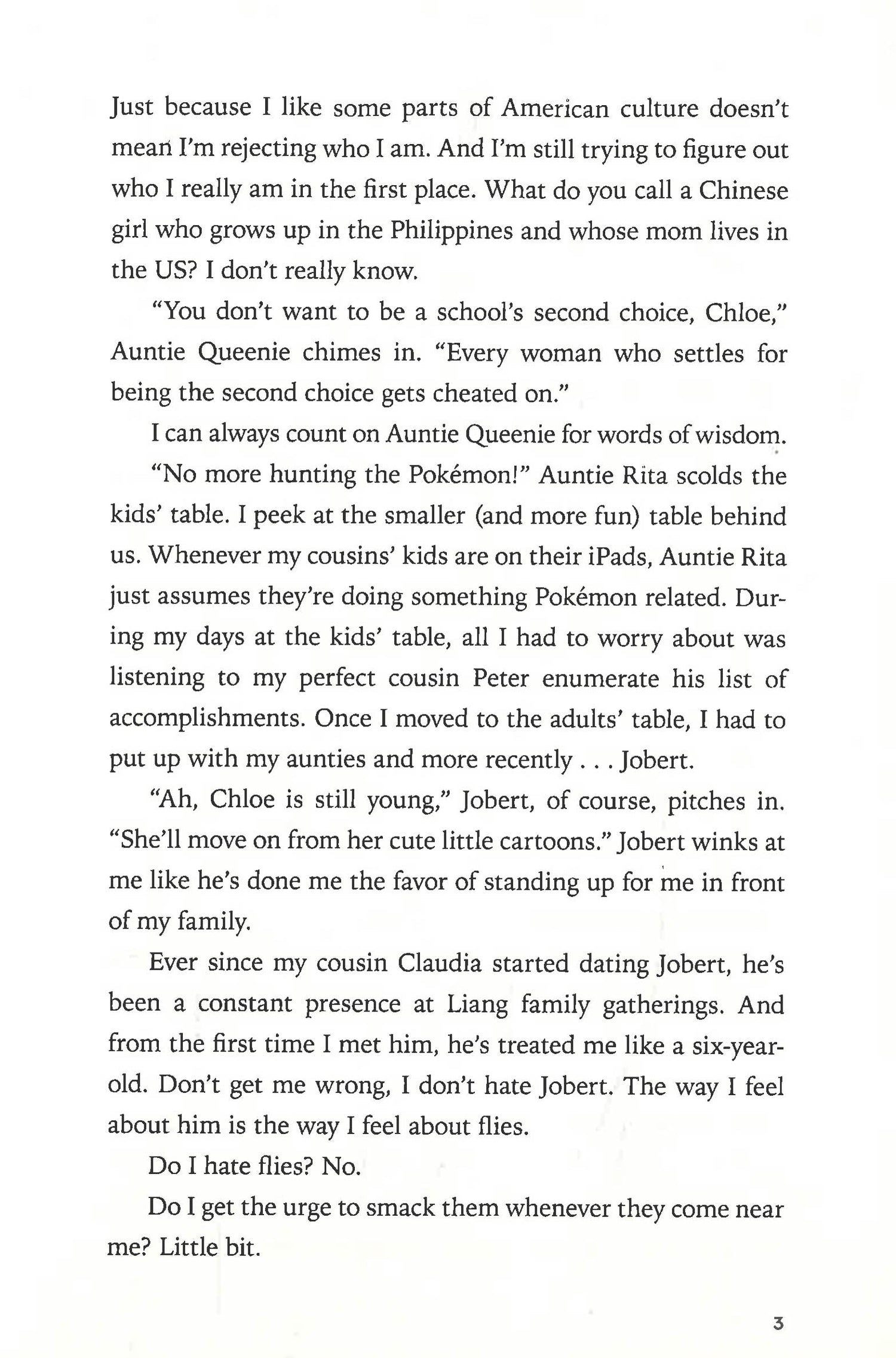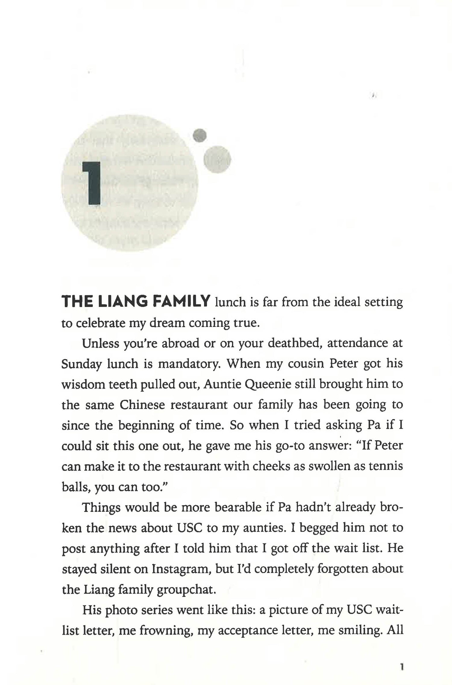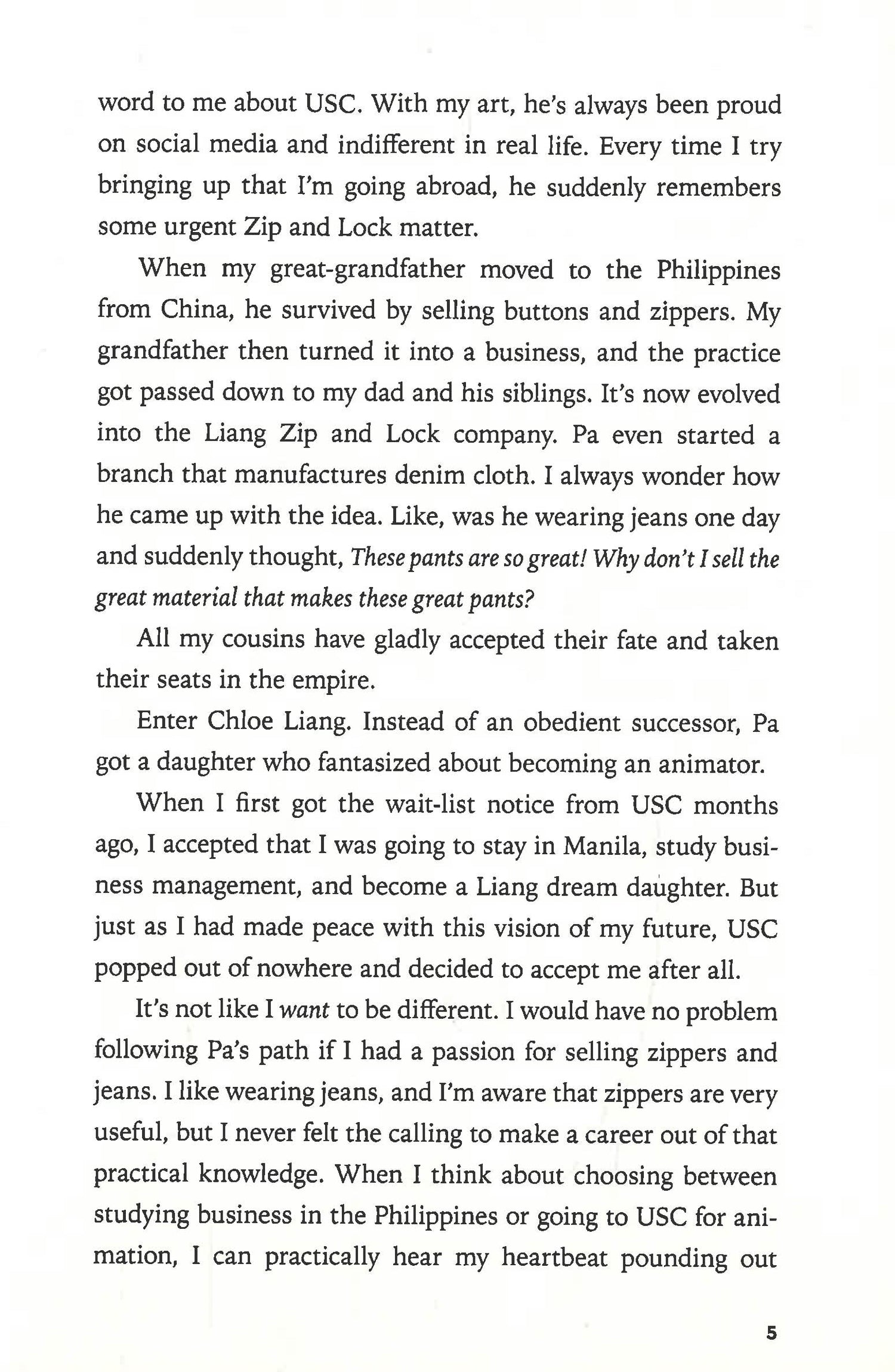 Chloe knows what it takes to be the perfect Liang daughter―stay in Manila, study business management, and join the family company. But when she unexpectedly gets off the wait list for USC, her dream of becoming an animator in the United States is suddenly within reach.