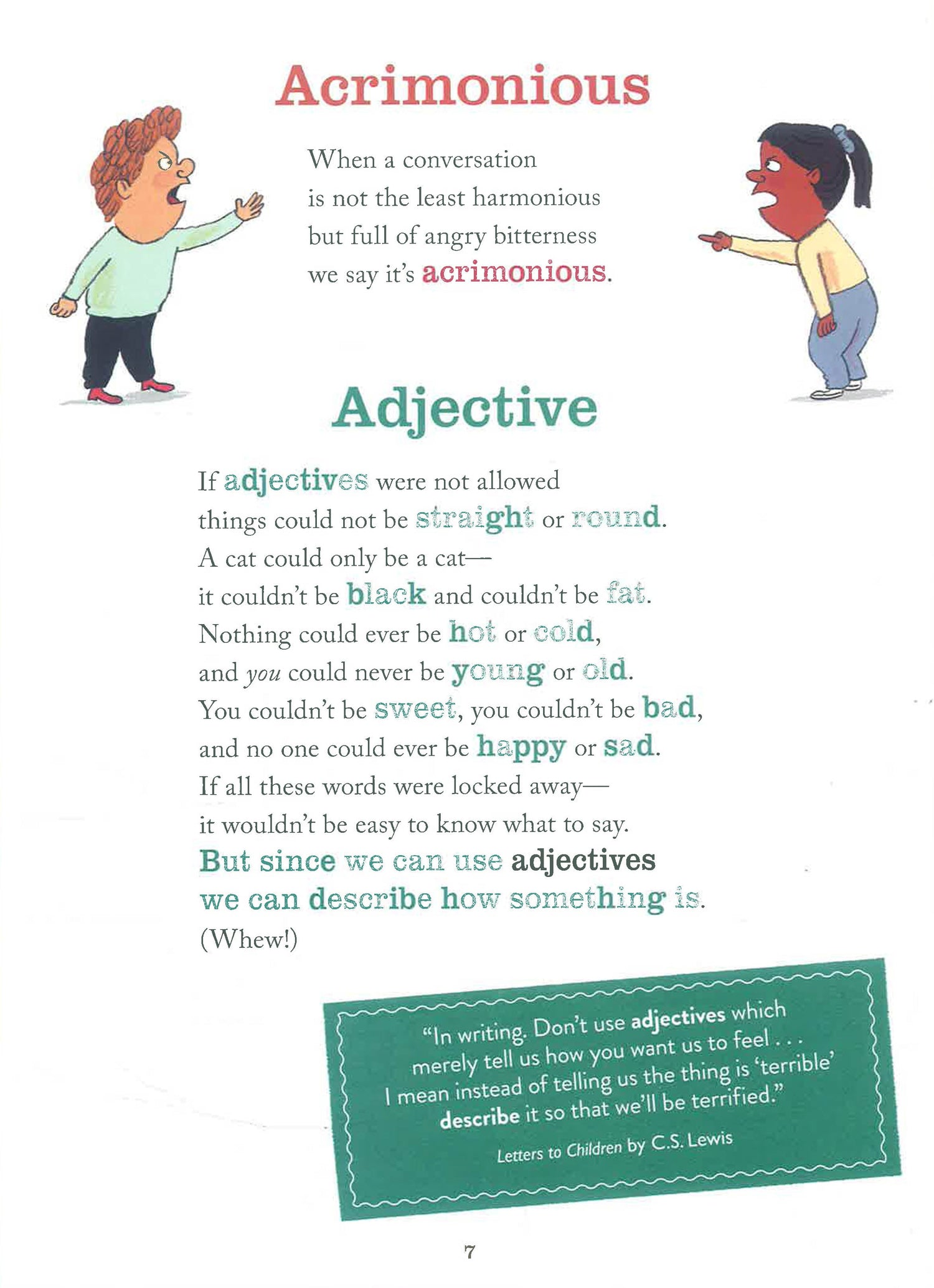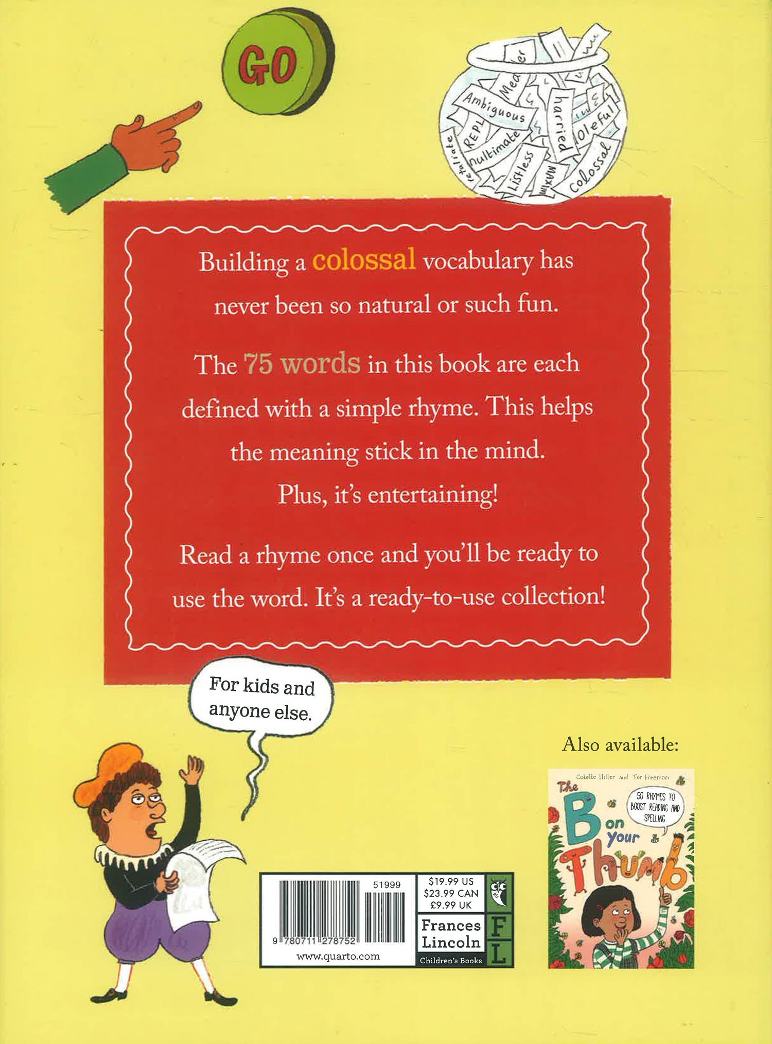 Building a colossal vocabulary has never felt so natural, or so much fun! Each word in this collection is defined in a simple rhyme. Using rhythm, humor and logic, each word’s meaning is made clear and accessible. Kids will want to try them out straight away: it’s a ready-to-use collection! You and your kids will love: