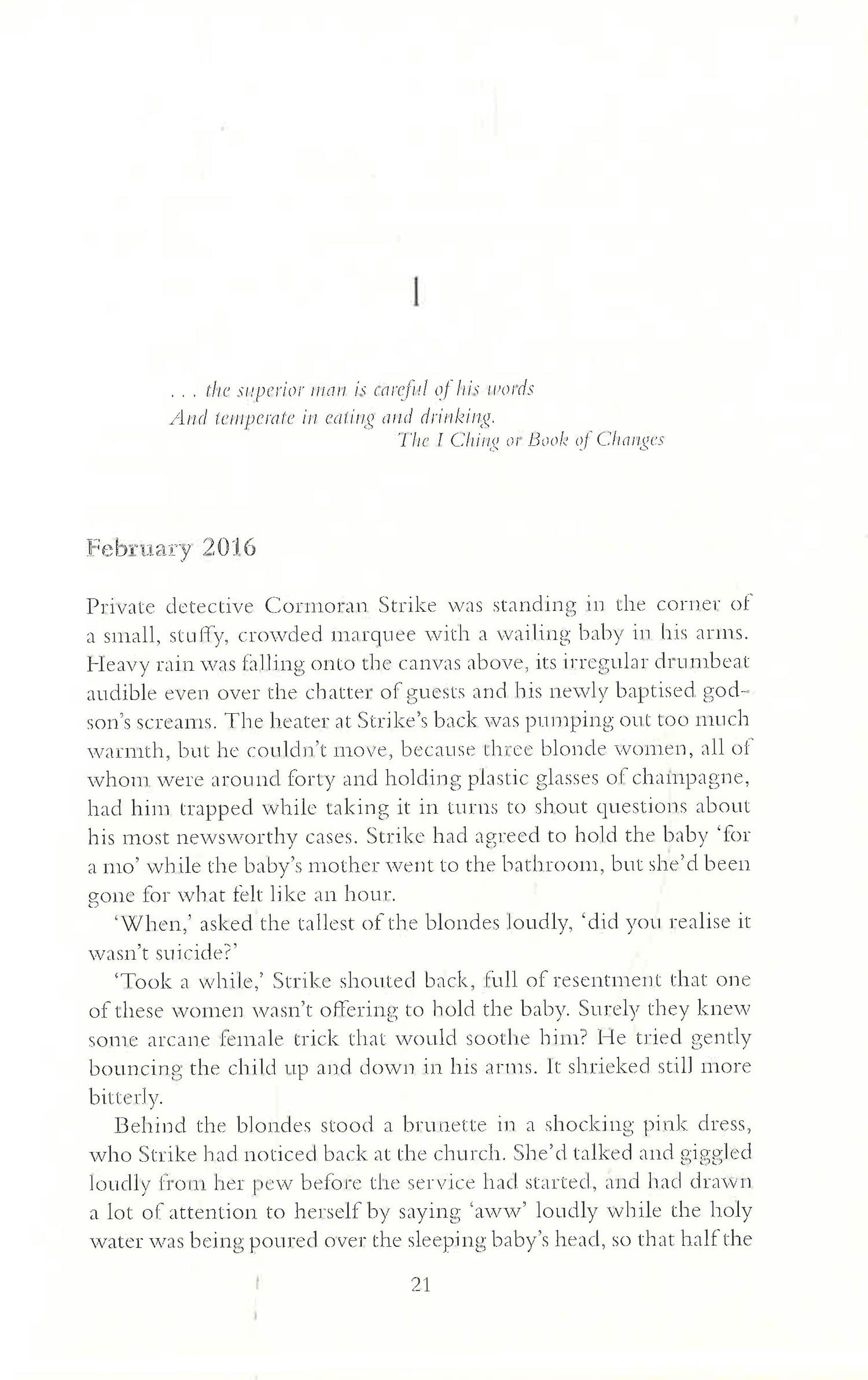 The Universal Humanitarian Church is, on the surface, a peaceable organization that campaigns for a better world. Yet Strike discovers that beneath the surface there are deeply sinister undertones, and unexplained deaths.