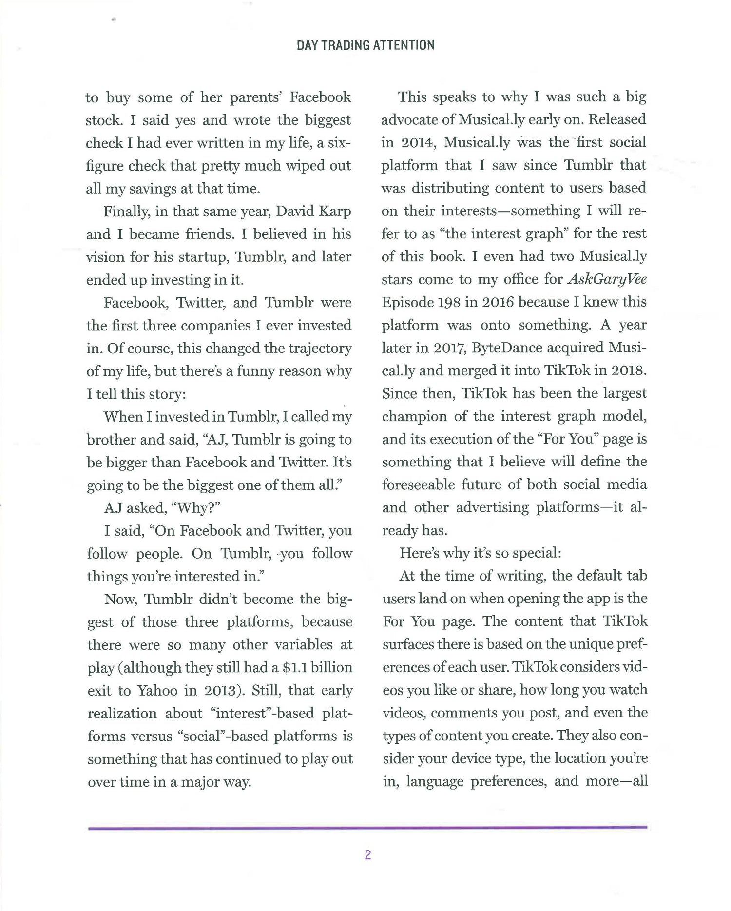 In his latest book, Vaynerchuk argues that today’s fast-growing businesses, brands, content creators, and influencers have one thing in common: They mastered storytelling in areas of underpriced attention, which predominantly exists across a handful of social media platforms. Informed by 20+ years of business and marketing success, he contends that the biggest transformation and opportunity is the “TikTokification of Social Media.” Increasingly, platforms are distributing content based on what users are interested in, rather than who they follow. In Day Trading Attention, Gary offers detailed advice on how small businesses, large corporations, and creators can: