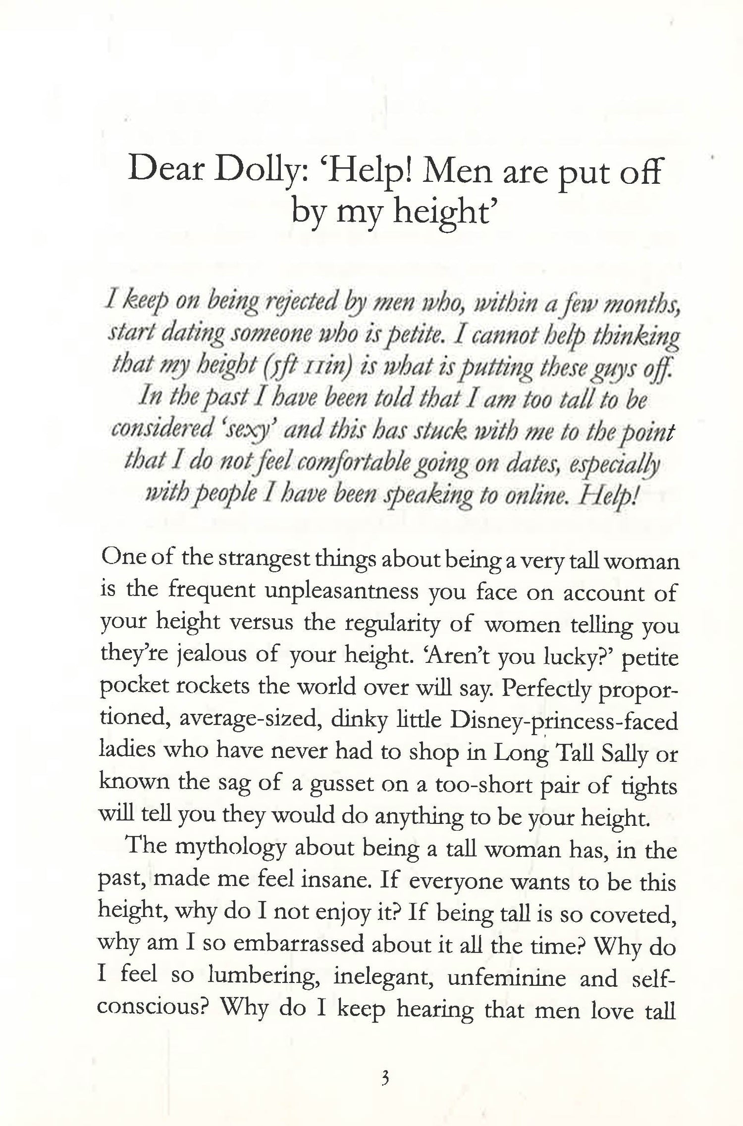 Dolly has thoughtfully answered questions ranging from the painfully--and sometimes hilariously--relatable to the occasionally bizarre. They include breakups and body issues, families, relationships platonic and romantic, dating, divorce, the pleasures and pitfalls of social media, sex, loneliness, longing, love and everything in between.