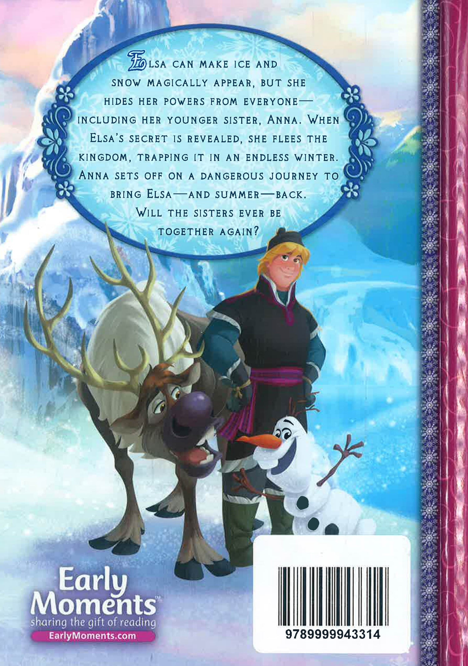 Elsa can make ice and snow magically appear, but she hides her powers from everyoneincluding her younger sister, Anna. When Elsa's secret is revealed, she flees the kingdom, trapping it in an endless winter. Anna sets off on a dangerous journey to bring Elsa—and summer—back. Will the sisters ever be together again?