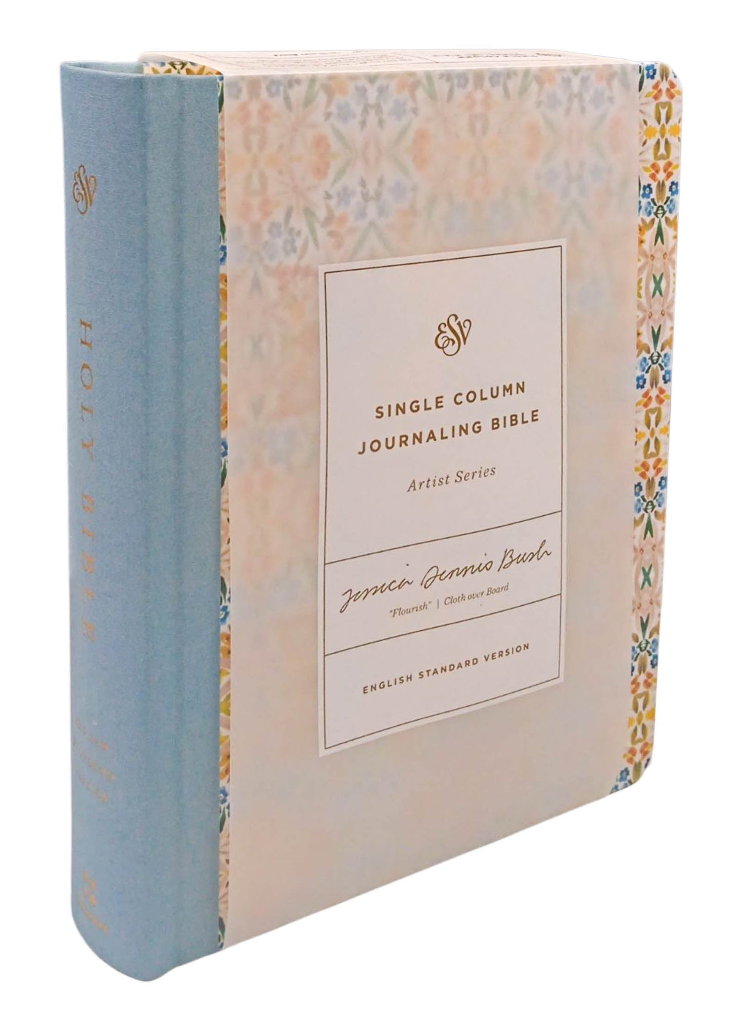 The ESV Single Column Journaling Bible, Artist Series is a collection of journaling Bibles meant to celebrate the treasure of God's Word through the artistic talents of his people. These Bibles feature commissioned cover artwork designed by Christian artists such as Ruth Chou Simons, Lulie Wallace, and Joshua Noom. Each artist offers a visual entry point focused on a particular biblical theme or passage, setting a tone of awe as readers engage with the Bible.
