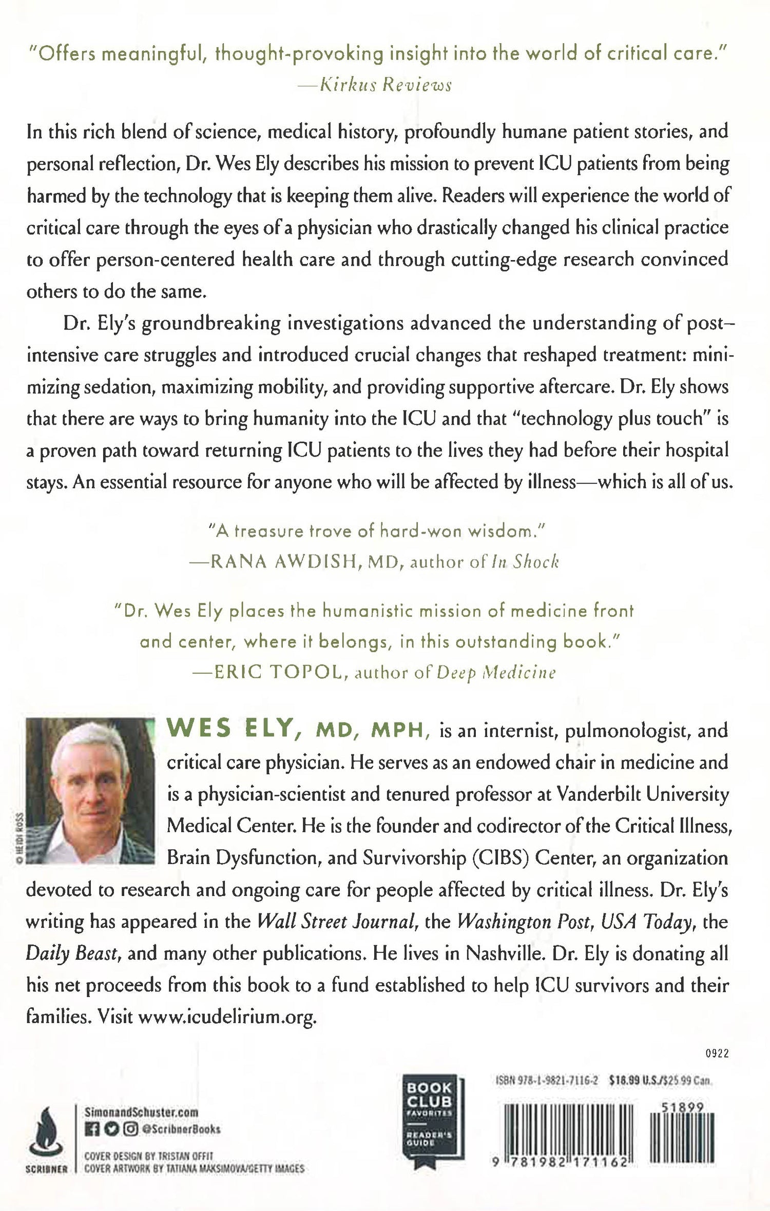 In this rich blend of science, medical history, profoundly humane patient stories, and personal reflection, Dr. Wes Ely describes his mission to prevent ICU patients from being harmed by the technology that is keeping them alive. Readers will experience the world of critical care through the eyes of a physician who drastically changed his clinical practice to offer person-centered health care and through cutting-edge research convinced others to do the same.