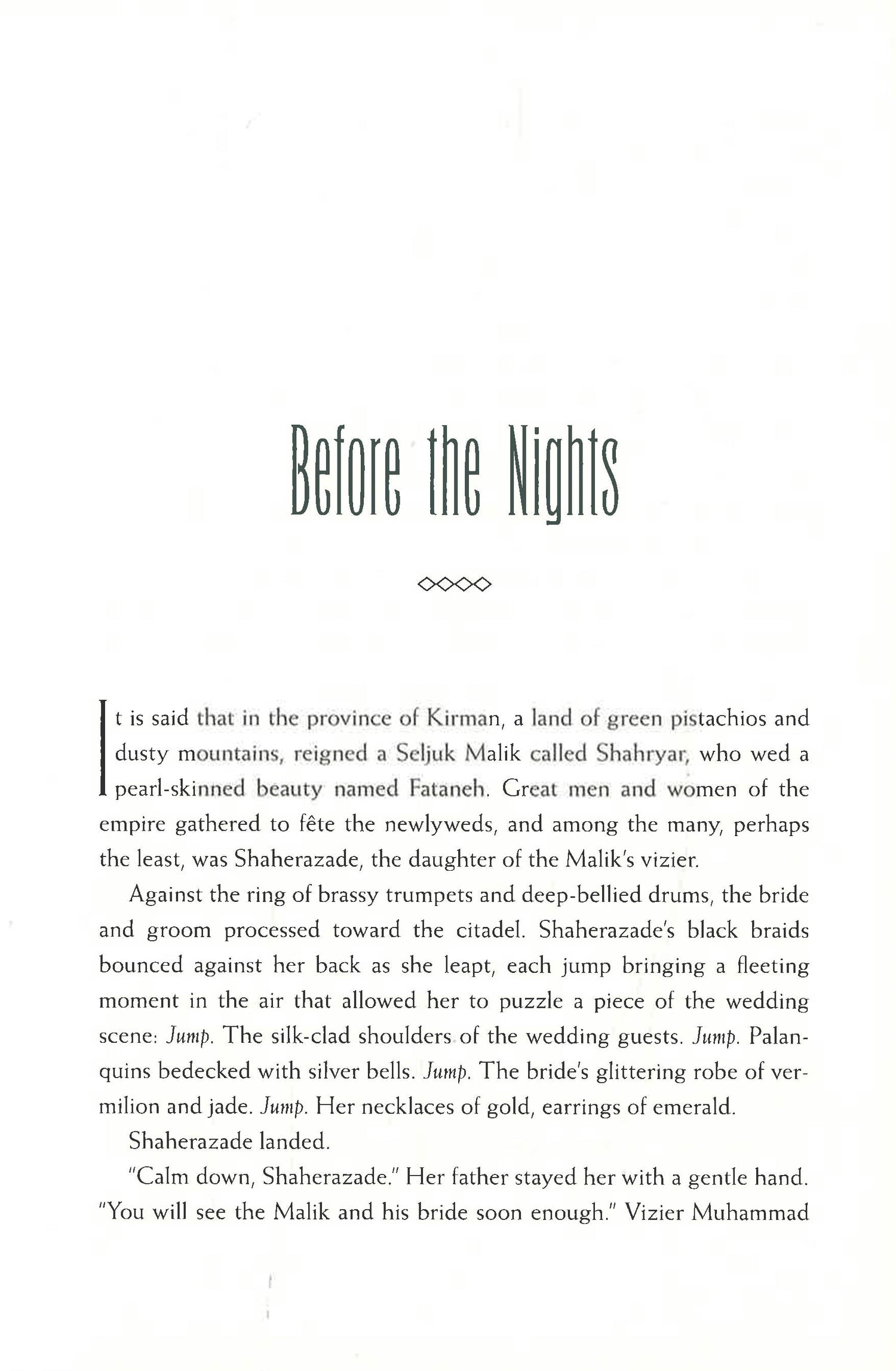 Enraged at his wife’s betrayal, the once-gentle Malik beheads her. But when that killing does not quench his anger, the Malik begins to marry and behead a new bride each night. Furious at the murders, his province seethes on rebellion’s edge. To suppress her guilt, quell threats of a revolt, and perhaps marry the man she has loved since childhood, Shaherazade persuades her beloved father, the Malik’s vizier, to offer her as the next wife. On their wedding night, Shaherazade begins a yarn, but as the sun ascends she cuts the story short, ensuring that she will live to tell another tale, a practice she repeats night after night.