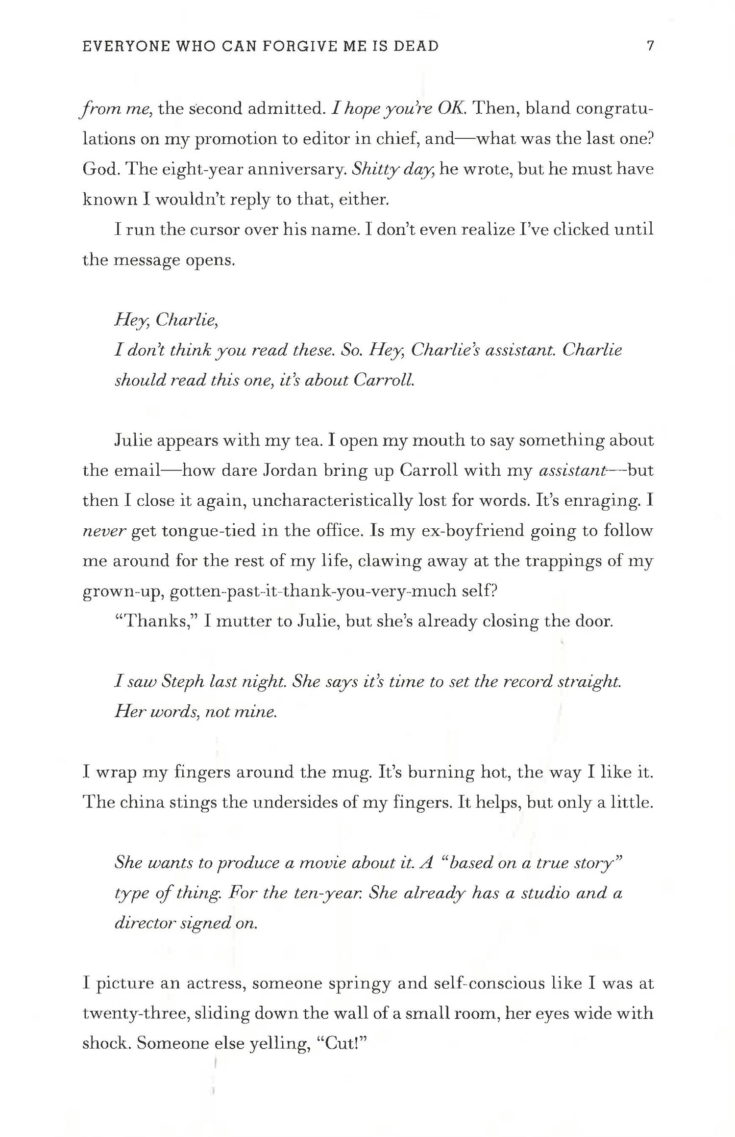 Now, Charlie has meticulously rebuilt her life: She's the editor-in-chief of a major magazine, engaged to the golden child of the publishing industry, and hell-bent on never, ever letting her guard down again. But when a buzzy film made by one of Charlie's former classmates threatens to shatter everything she's worked for, Charlie realizes how much she's changed in nine years. Now, she's not going to let anything―not even the people she once loved most―get in her way.