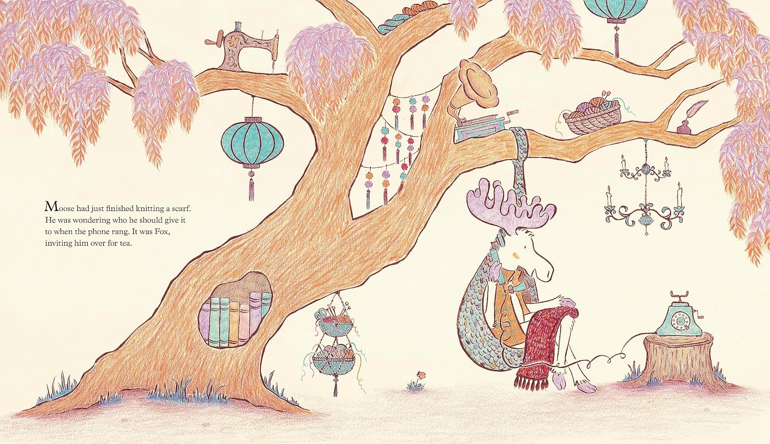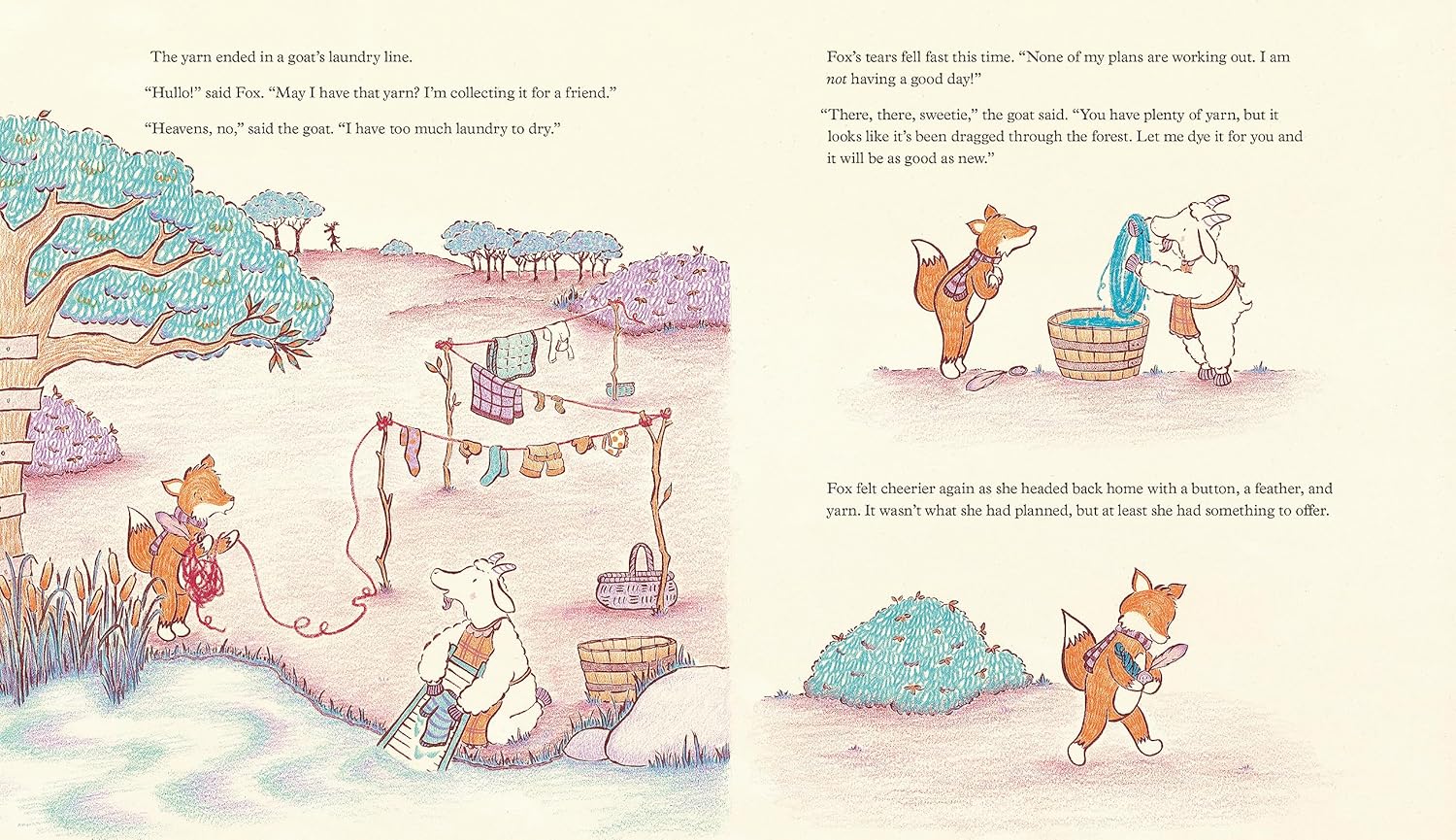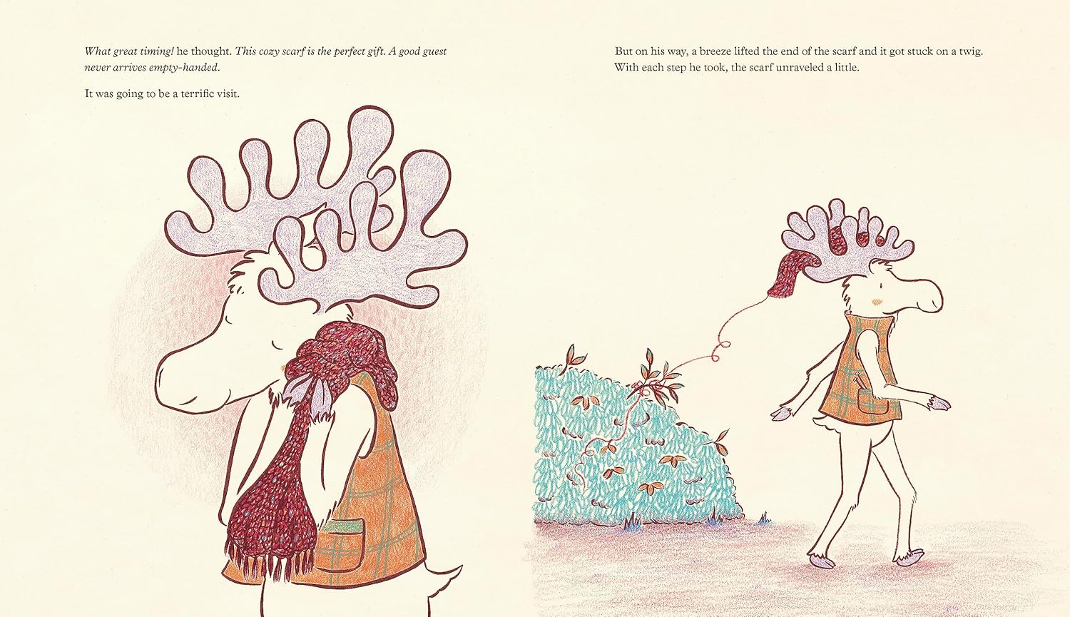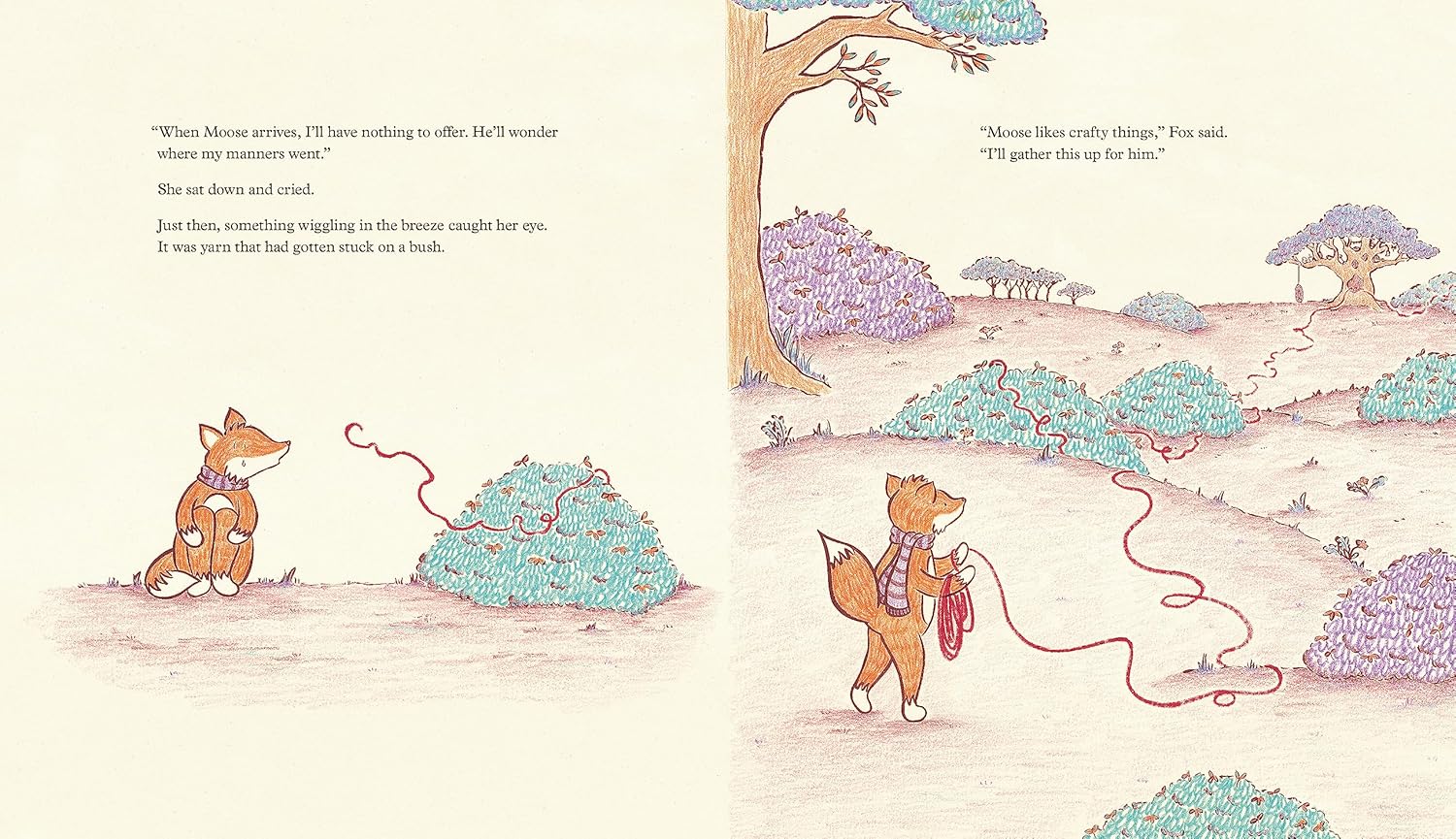 Meanwhile, Moose is delighted to have been invited for tea. He has just finished knitting a scarf that he will give to Fox, because good guests never arrive empty-handed. Little does he know that the scarf is unraveling as he walks to Fox's. When he discovers that his gift is gone, he's about to despair. But there are new ideas ahead. Maybe his visit with Fox will end up being as terrific as originally planned.