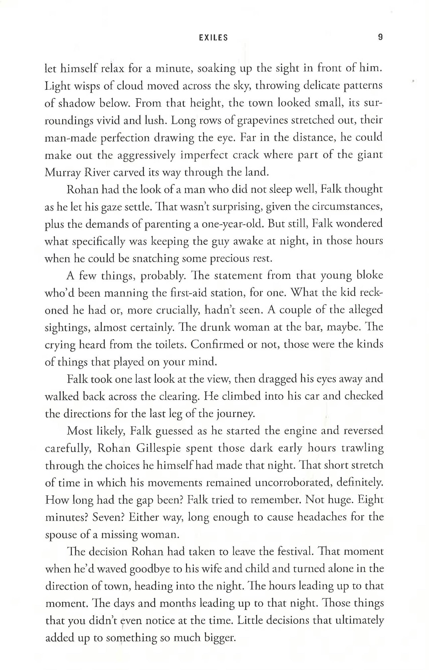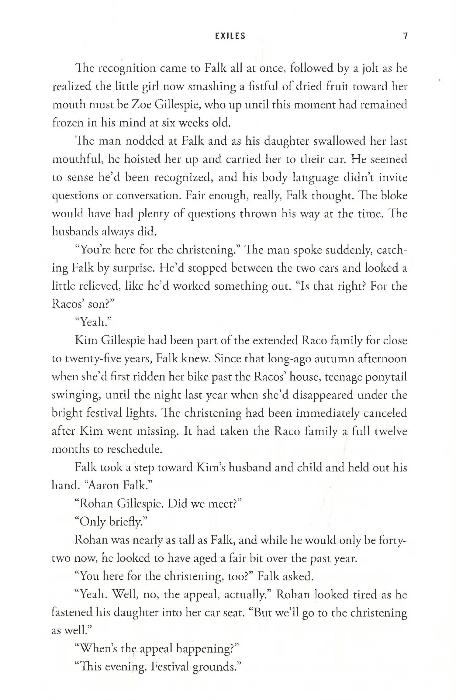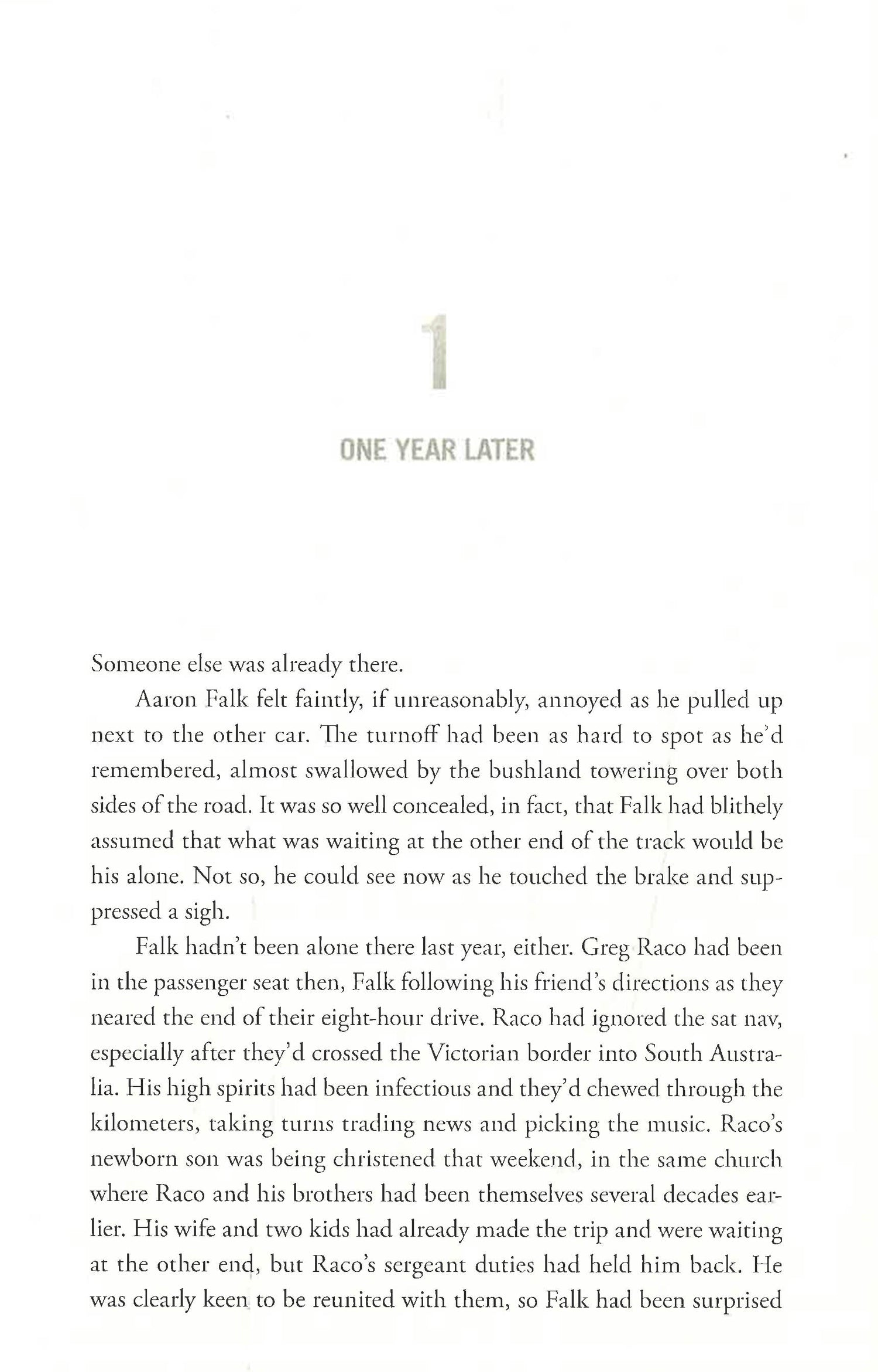 Federal Investigator Aaron Falk is on his way to a small town deep in Southern Australian wine country for the christening of an old friend's baby. But mystery follows him, even on vacation.