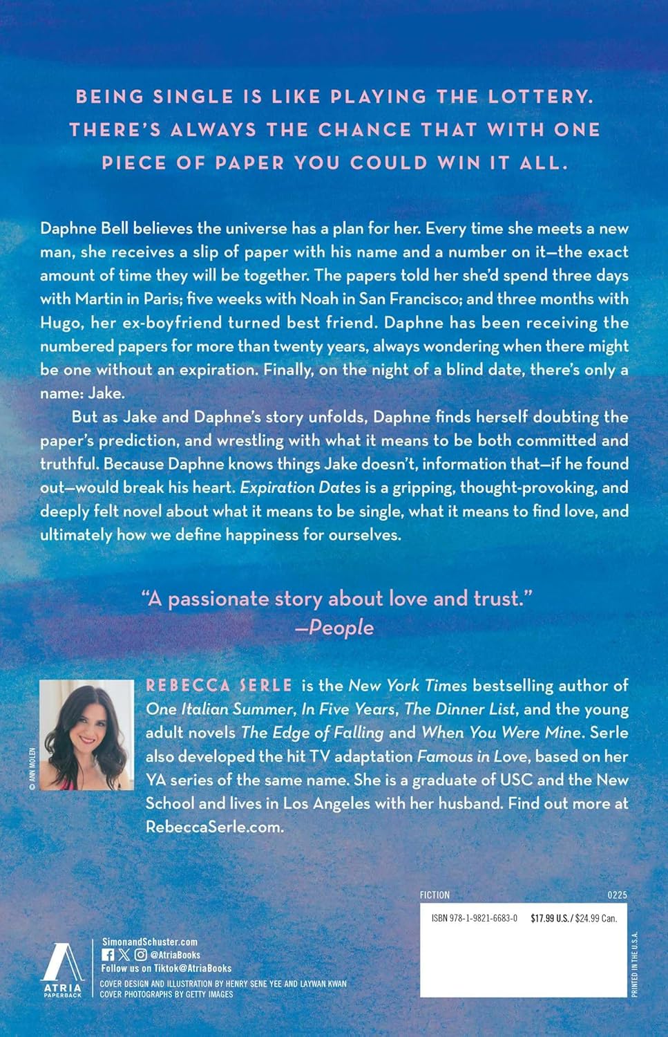Daphne Bell believes the universe has a plan for her. Every time she meets a new man, she receives a slip of paper with his name and a number on it—the exact amount of time they will be together. The papers told her she’d spend three days with Martin in Paris; five weeks with Noah in San Francisco; and three months with Hugo, her ex-boyfriend turned best friend. Daphne has been receiving the numbered papers for over twenty years, always wondering when there might be one without an expiration. Finally, the night of a blind date at her favorite Los Angeles restaurant, there’s only a name: Jake.