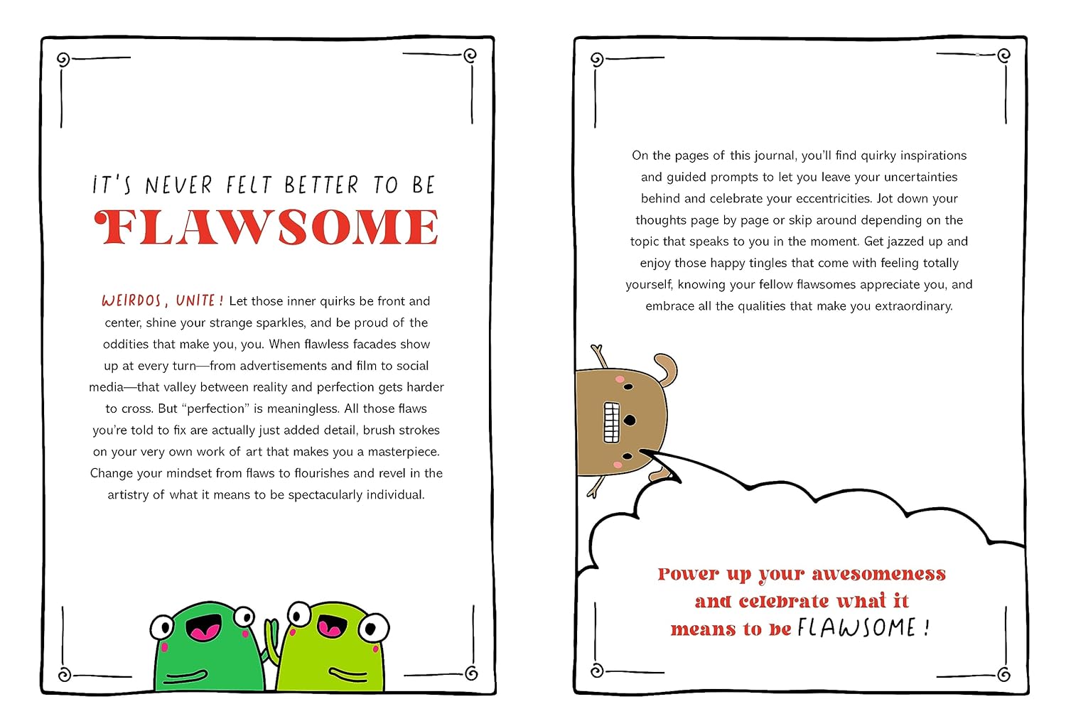 Take a hefty helping of awesome, sprinkle in some funky flaws, and enjoy your Flawsome self! Welcome to the guided journal that lets you be you. There’s no such thing as “perfect,” and embracing those special sparkles and fanciful idiosyncrasies that make you human is the surest way to feel your best. Through fun quotations and inspirations, follow along a range of thoughtful journaling questions that span the spectrum of goofy and fun to insightful and introspective. Use this journal to build your confidence, love your inner weirdo, and see the value of all your incredible quirks.